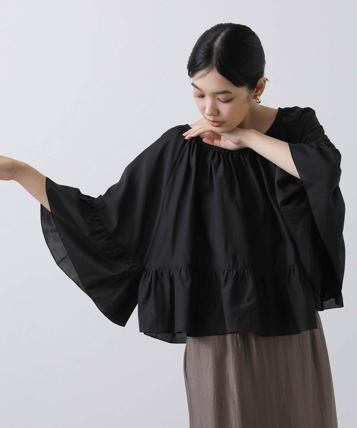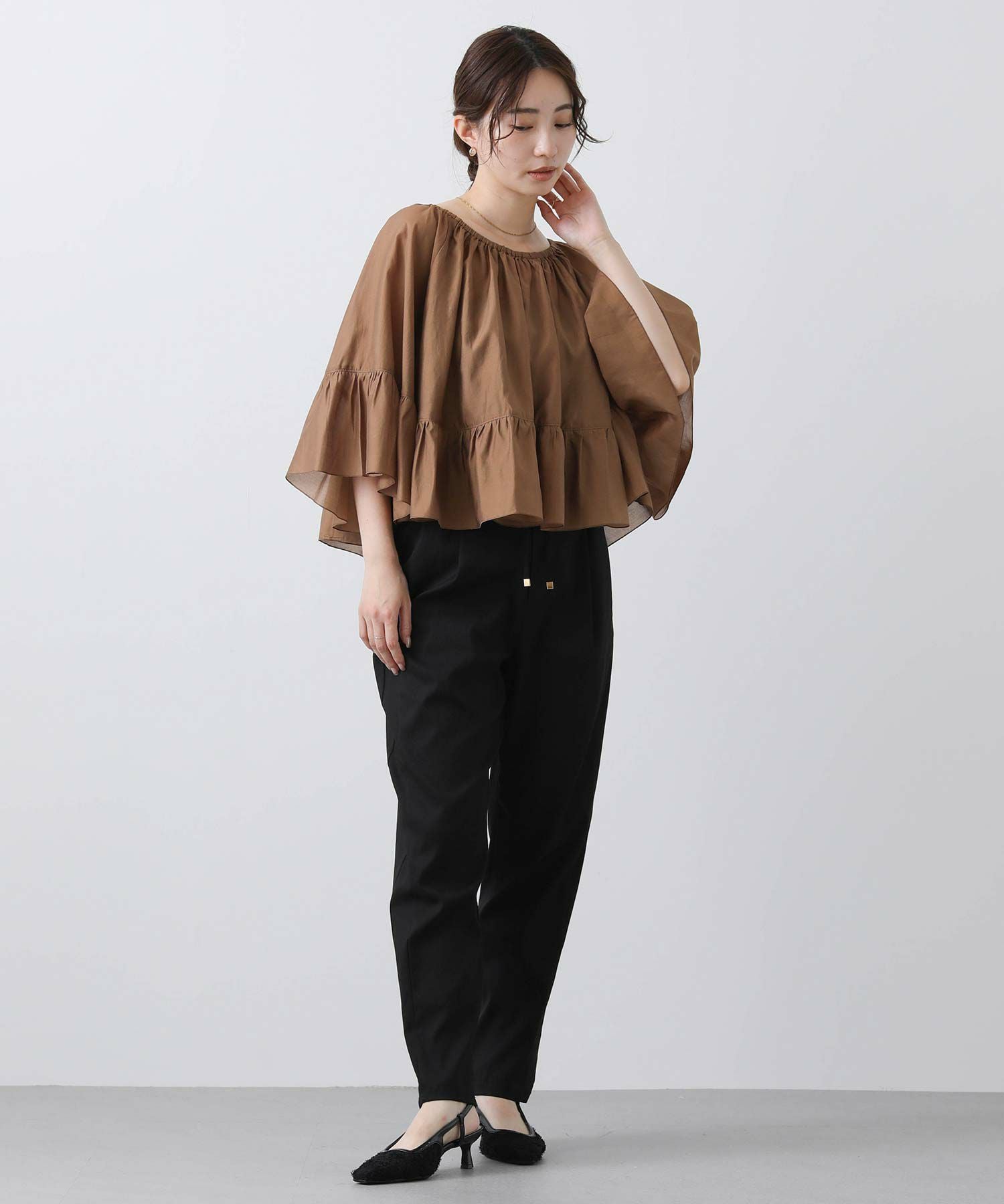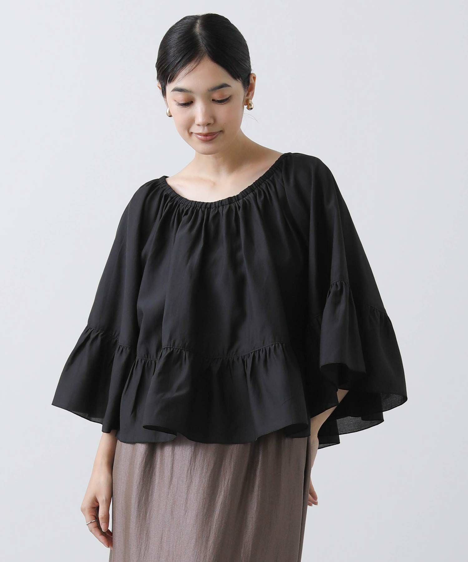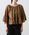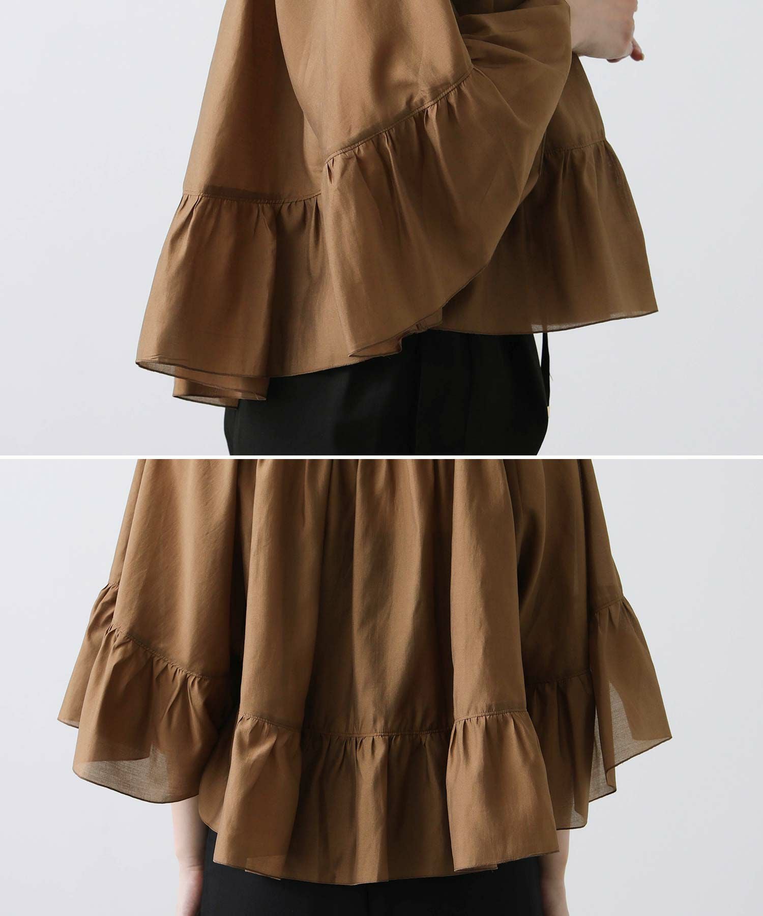 たっぷりギャザーの入ったケープ風フリルブラウス。