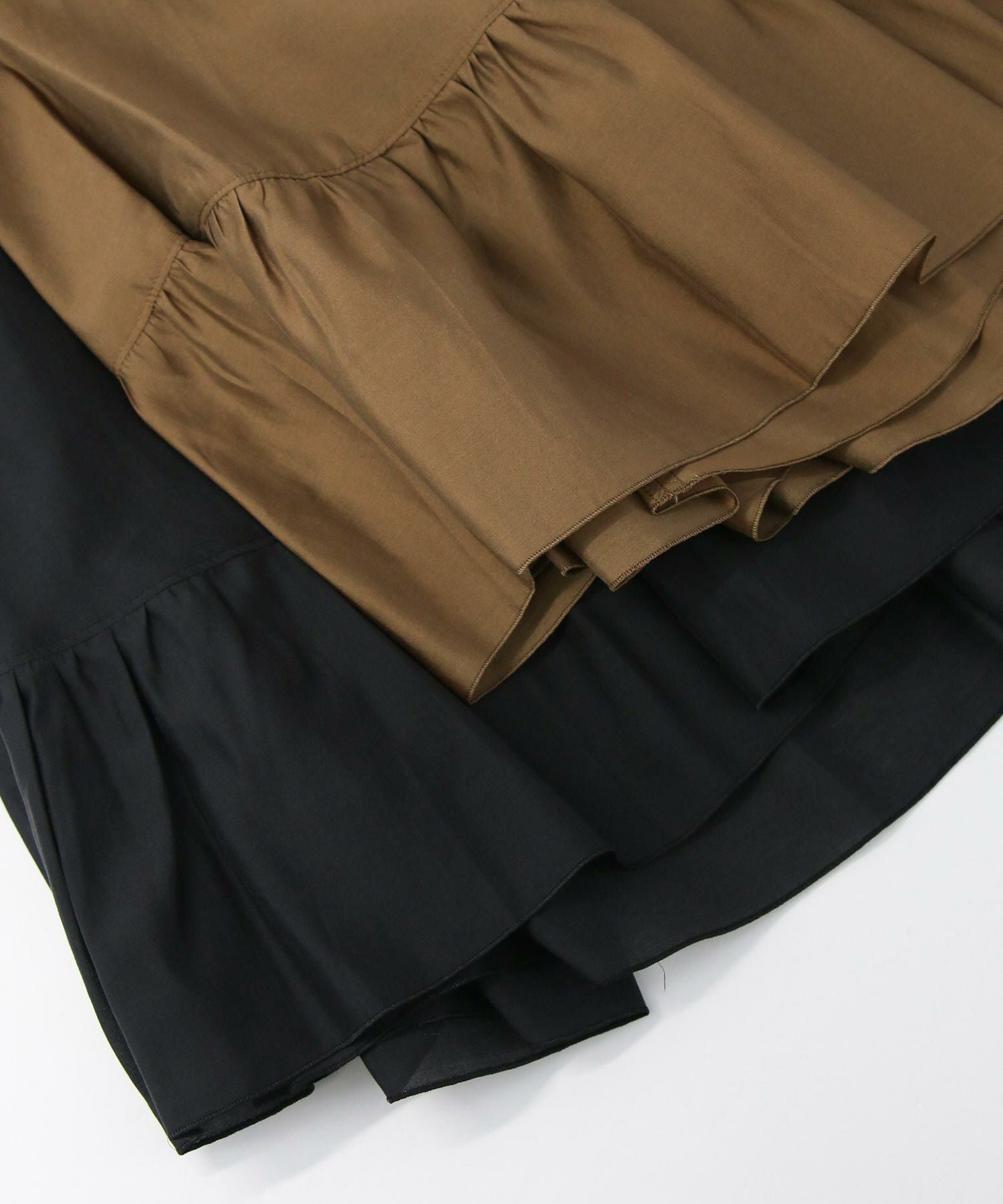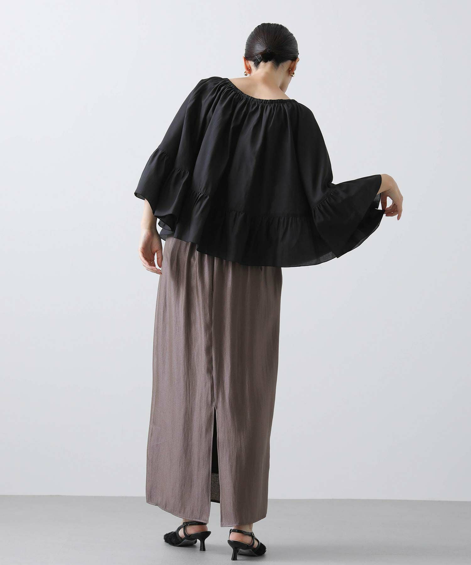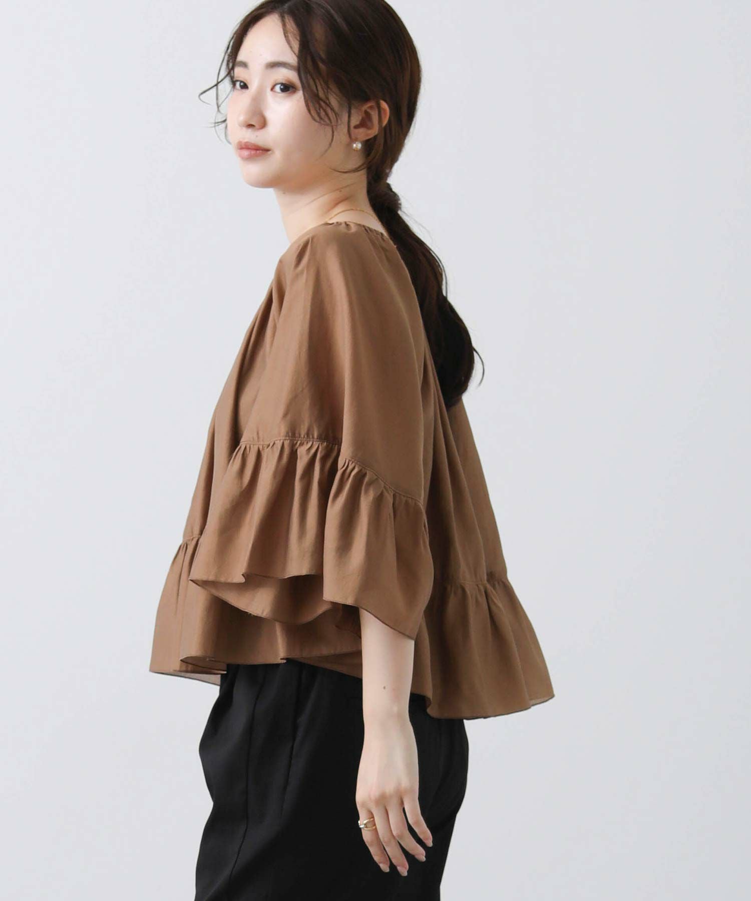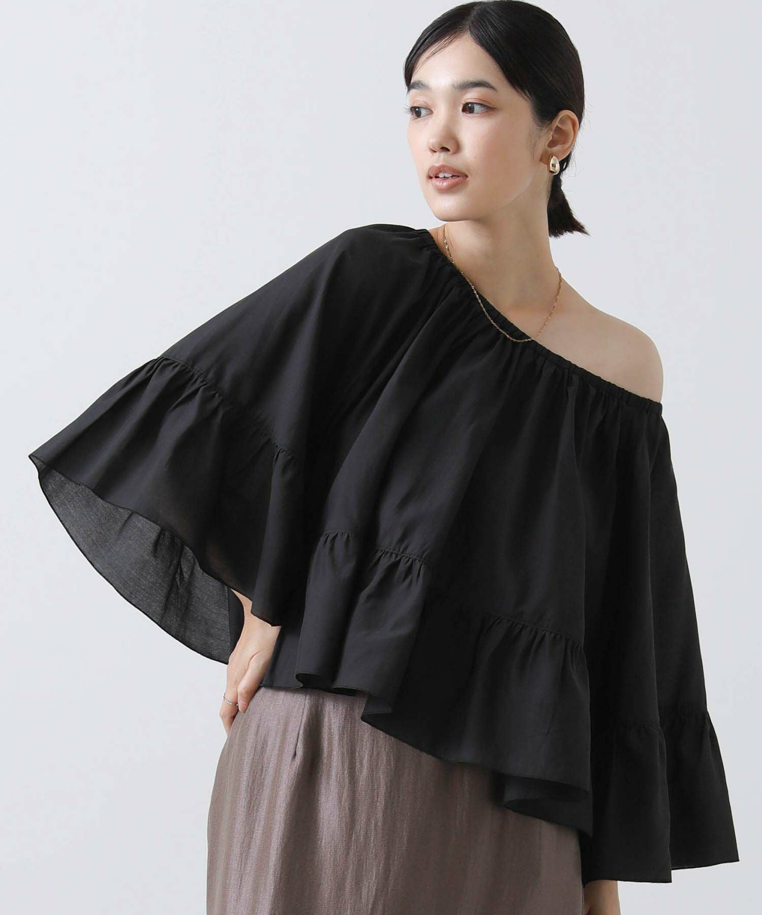 たっぷりギャザーの入ったケープ風フリルブラウス。