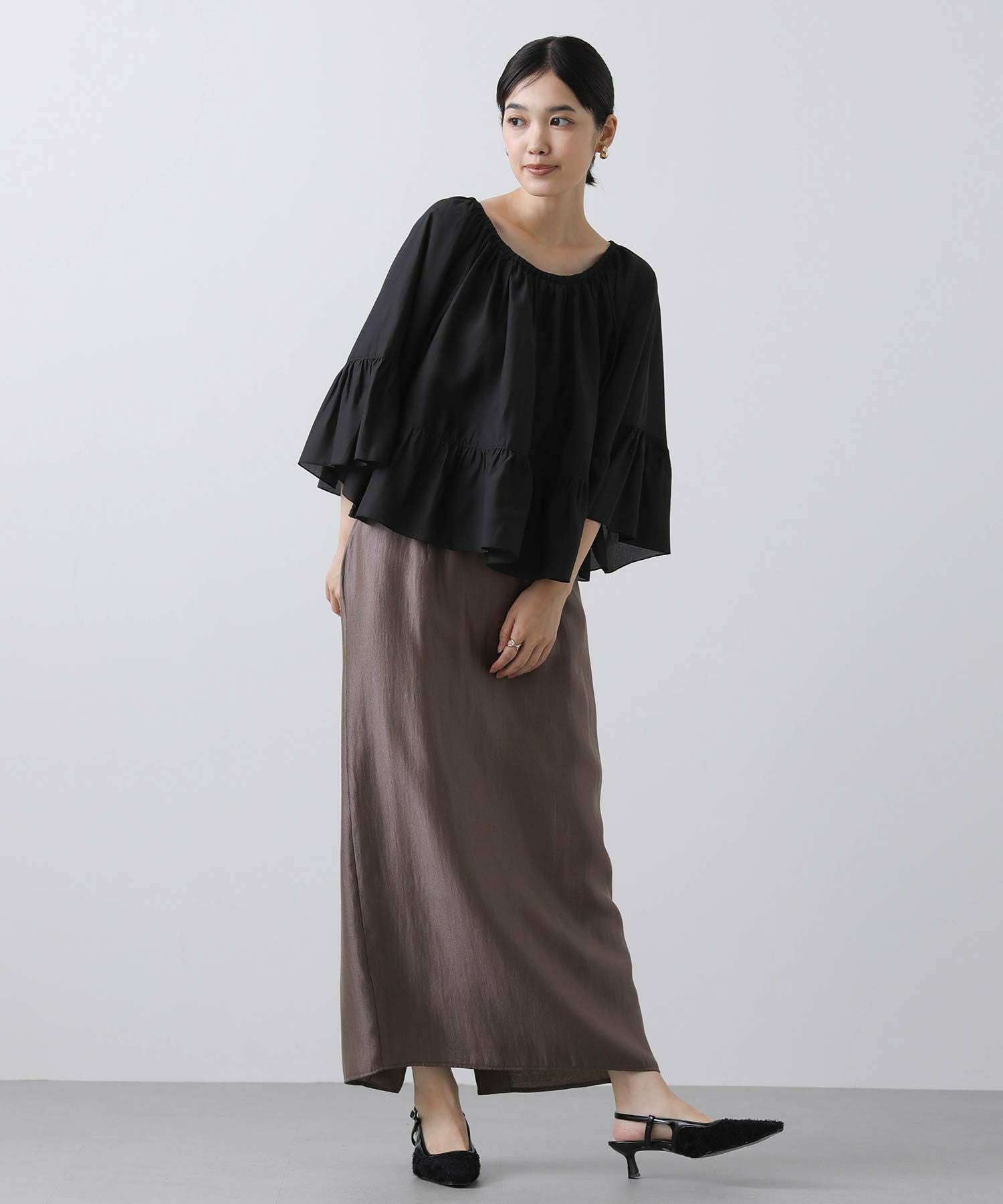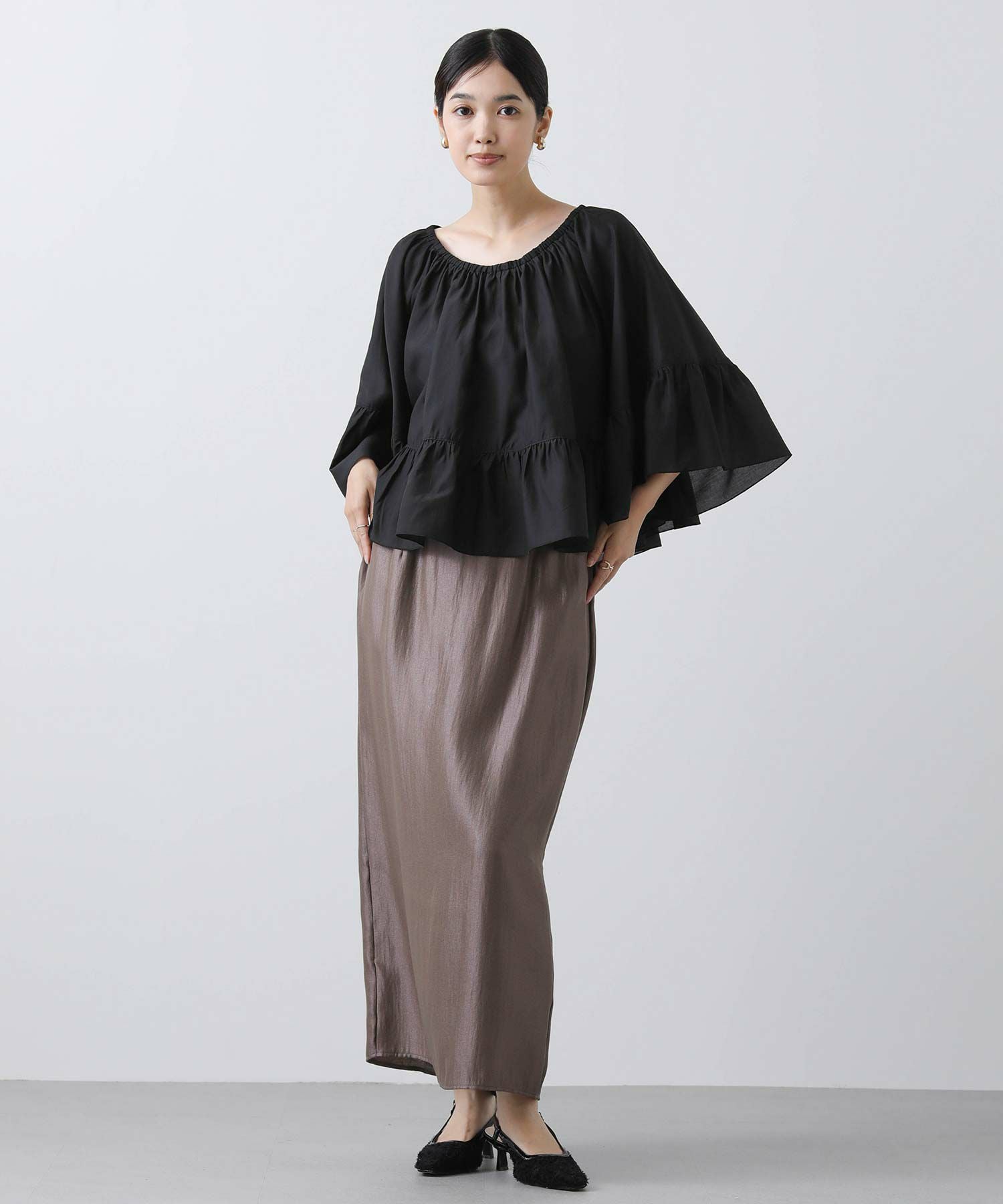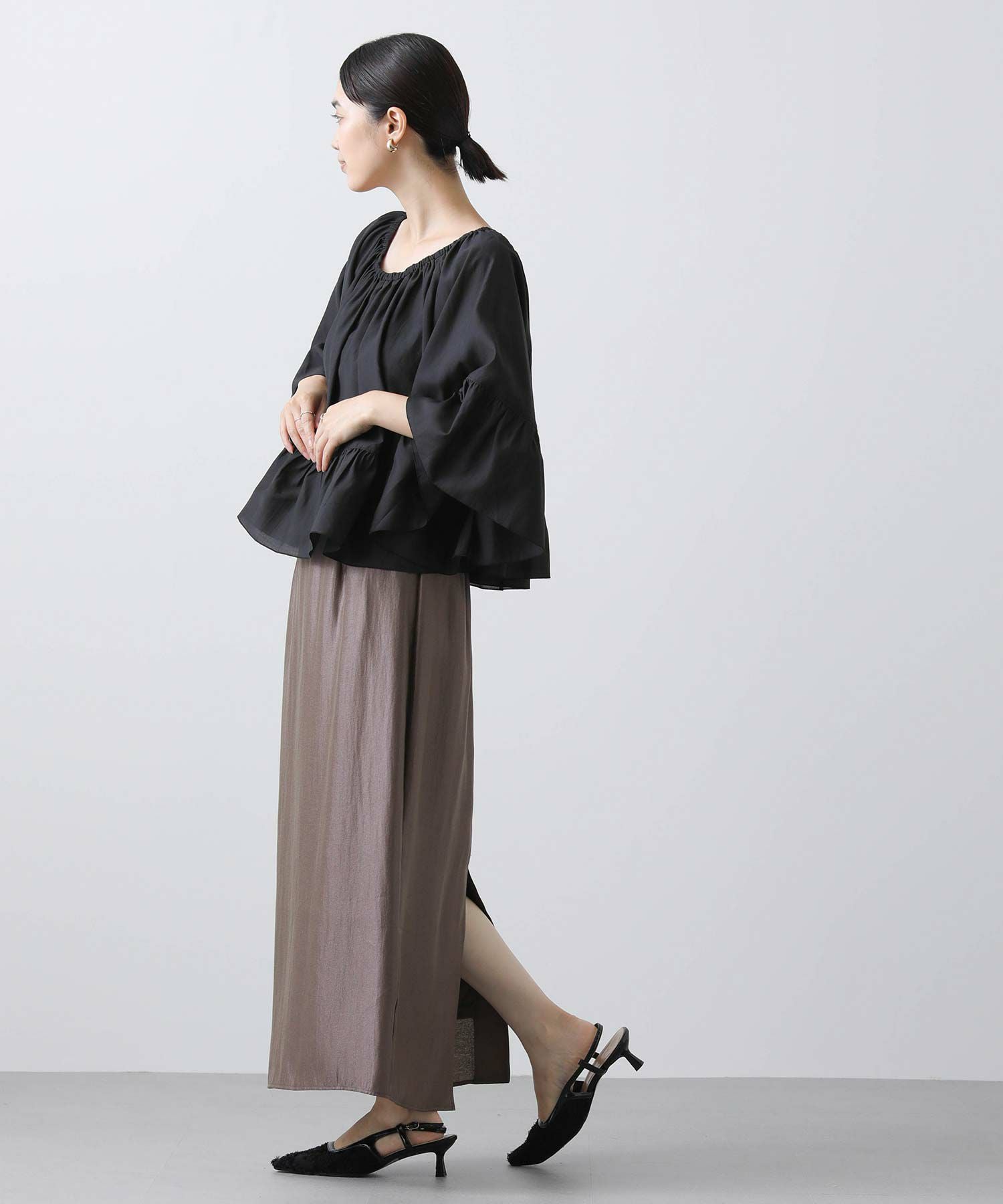 広げると半円になるシルエットで、少し短めの丈感が、ボトムに合わせやすく、トレンド感のあるスタイリングに。