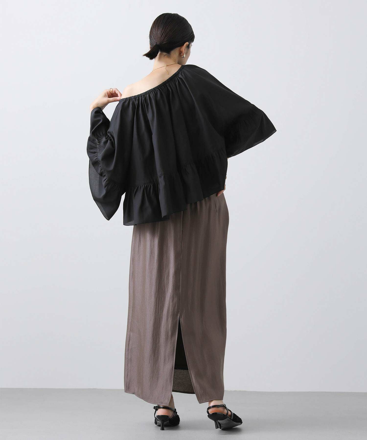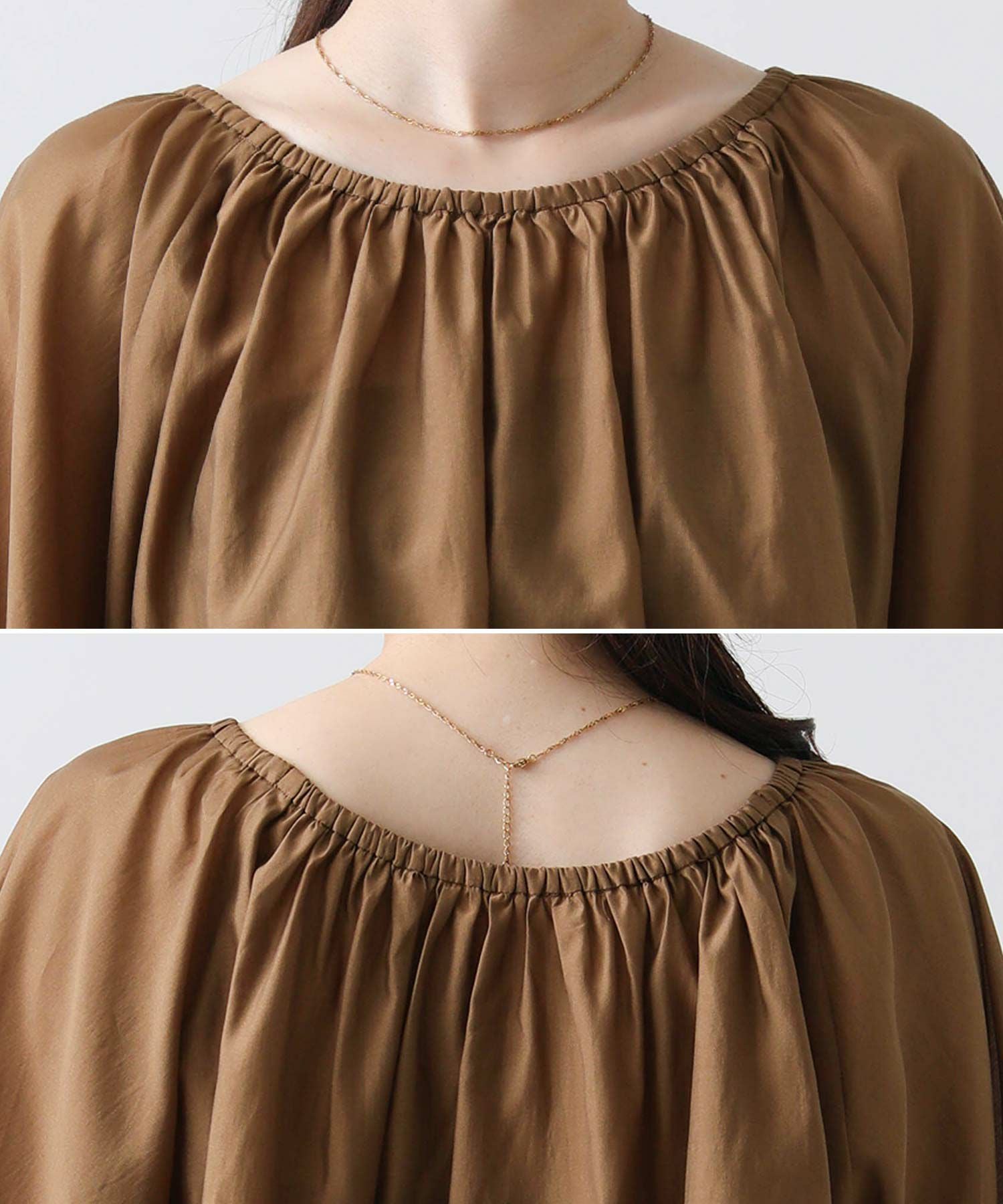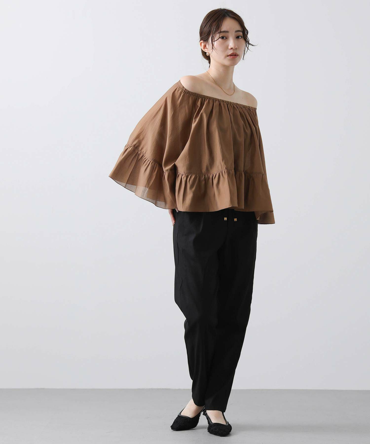 襟ぐりがゴム仕様なので、肩出しの抜け感のあるスタイルも可能です。