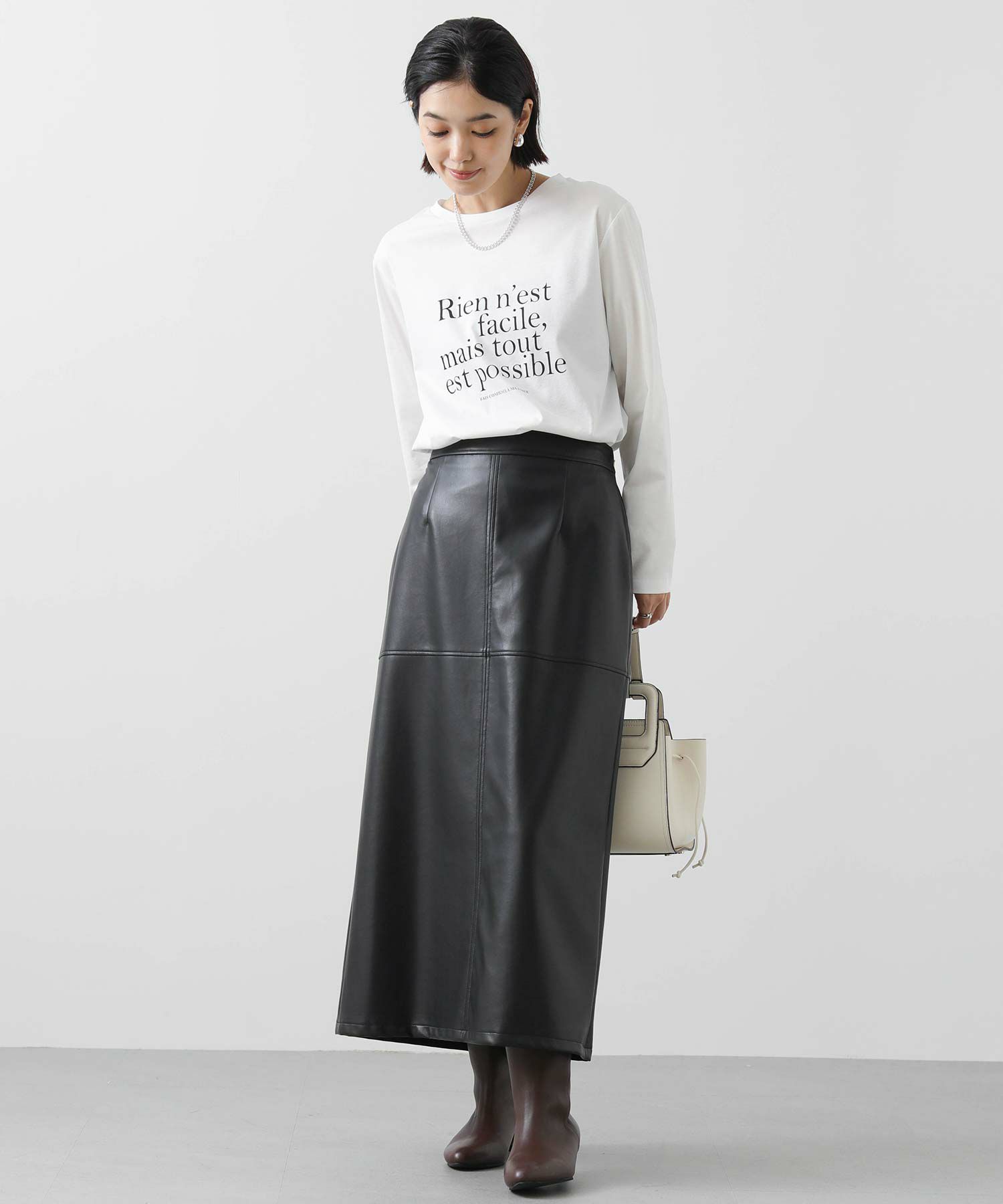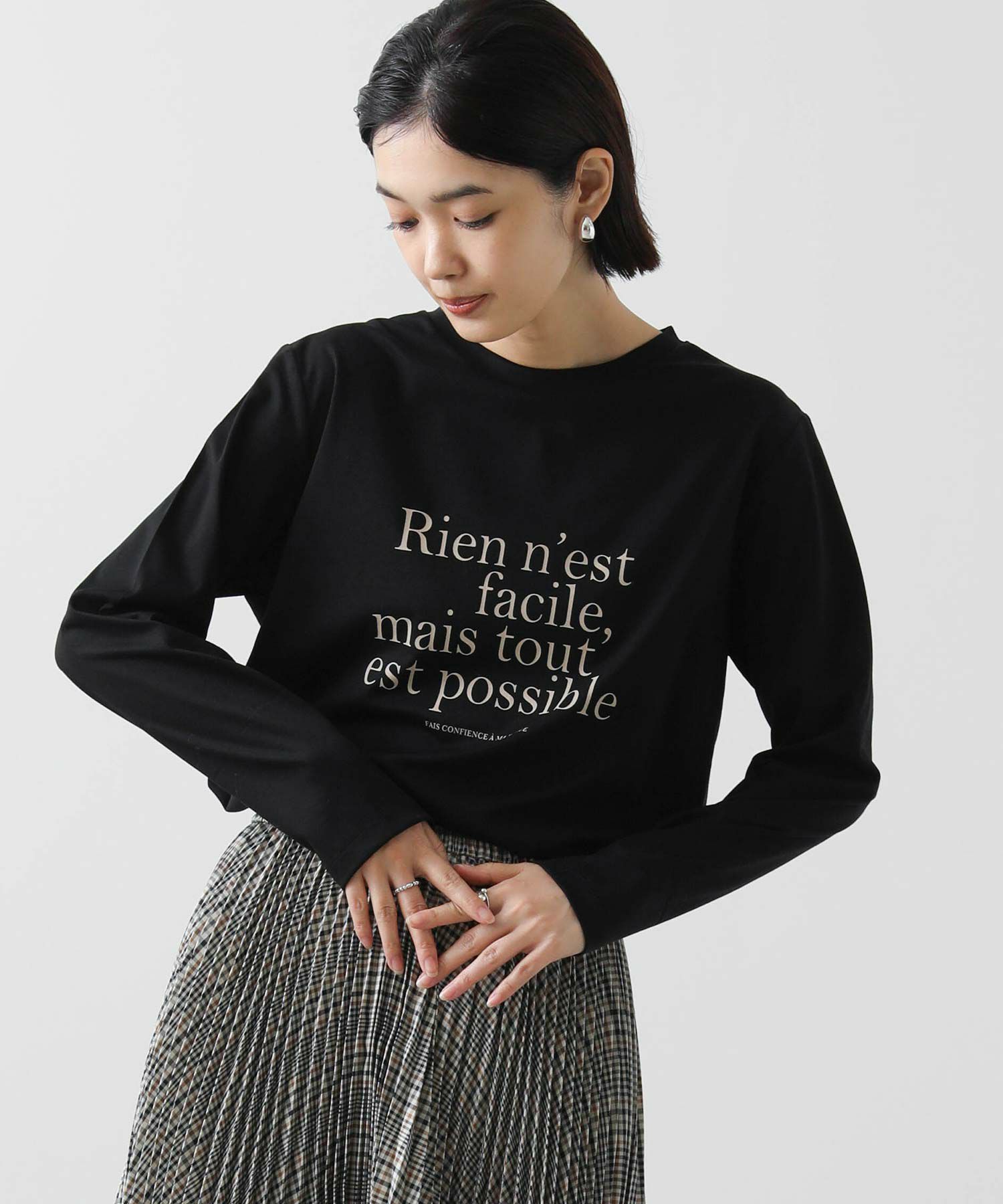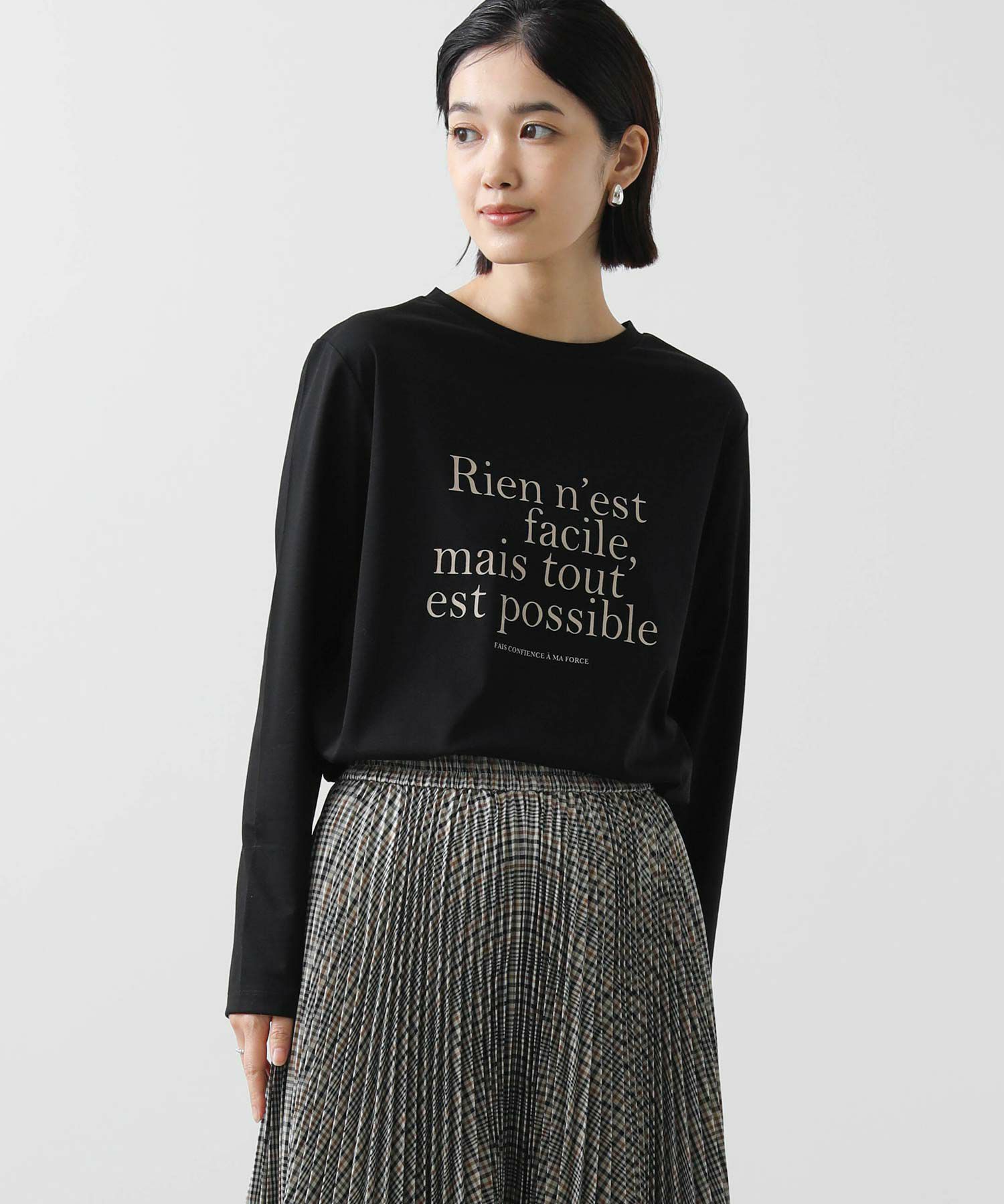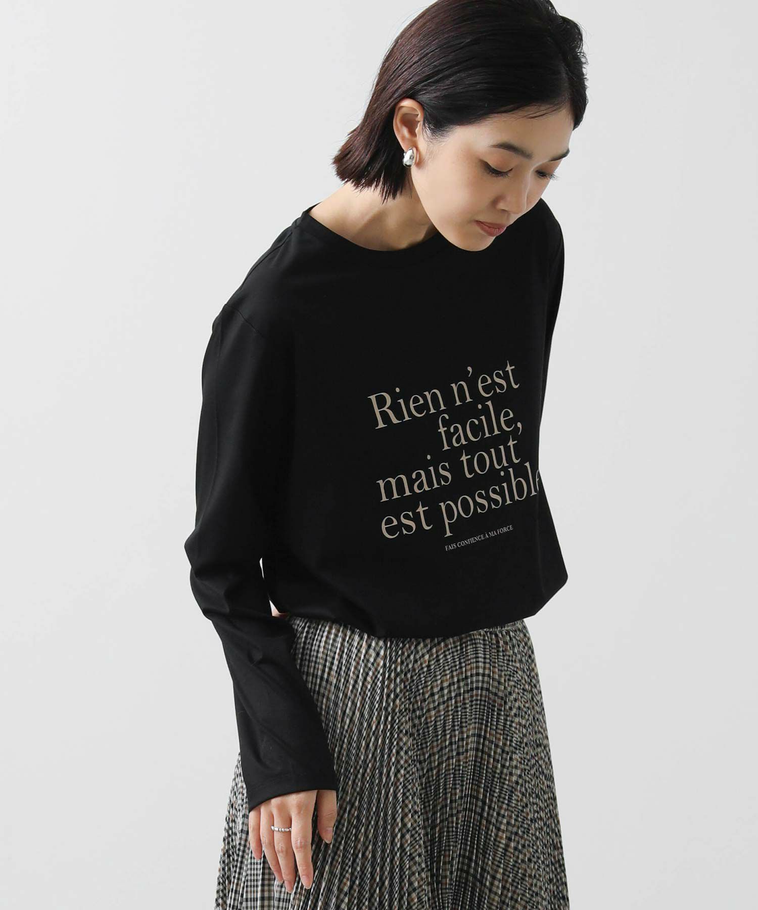 クセのない大人見えするバランスで仏語ロゴをプリントし、秋にしっくりくる一着。