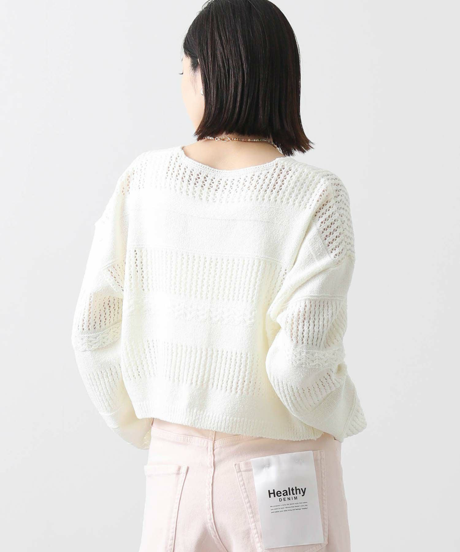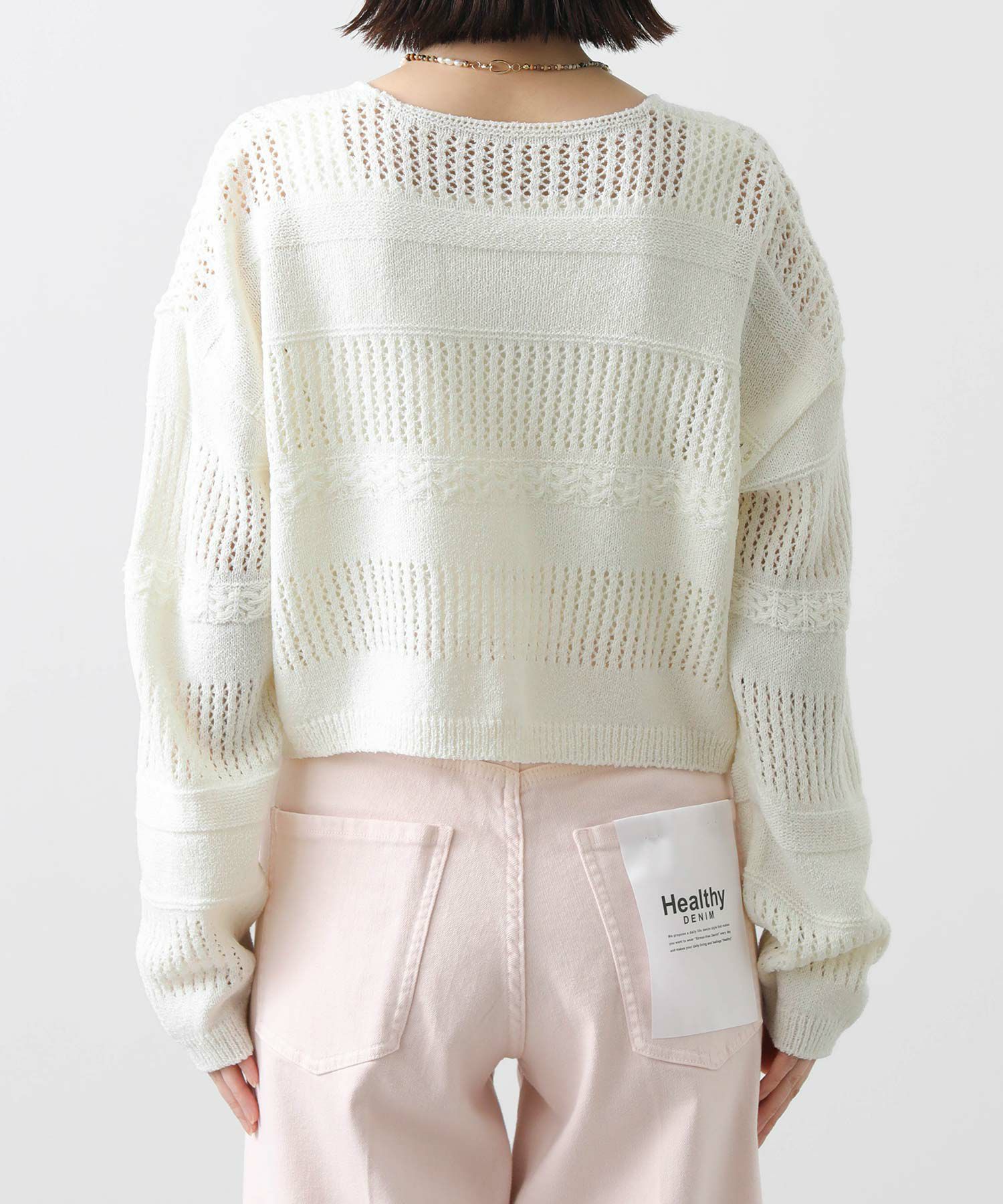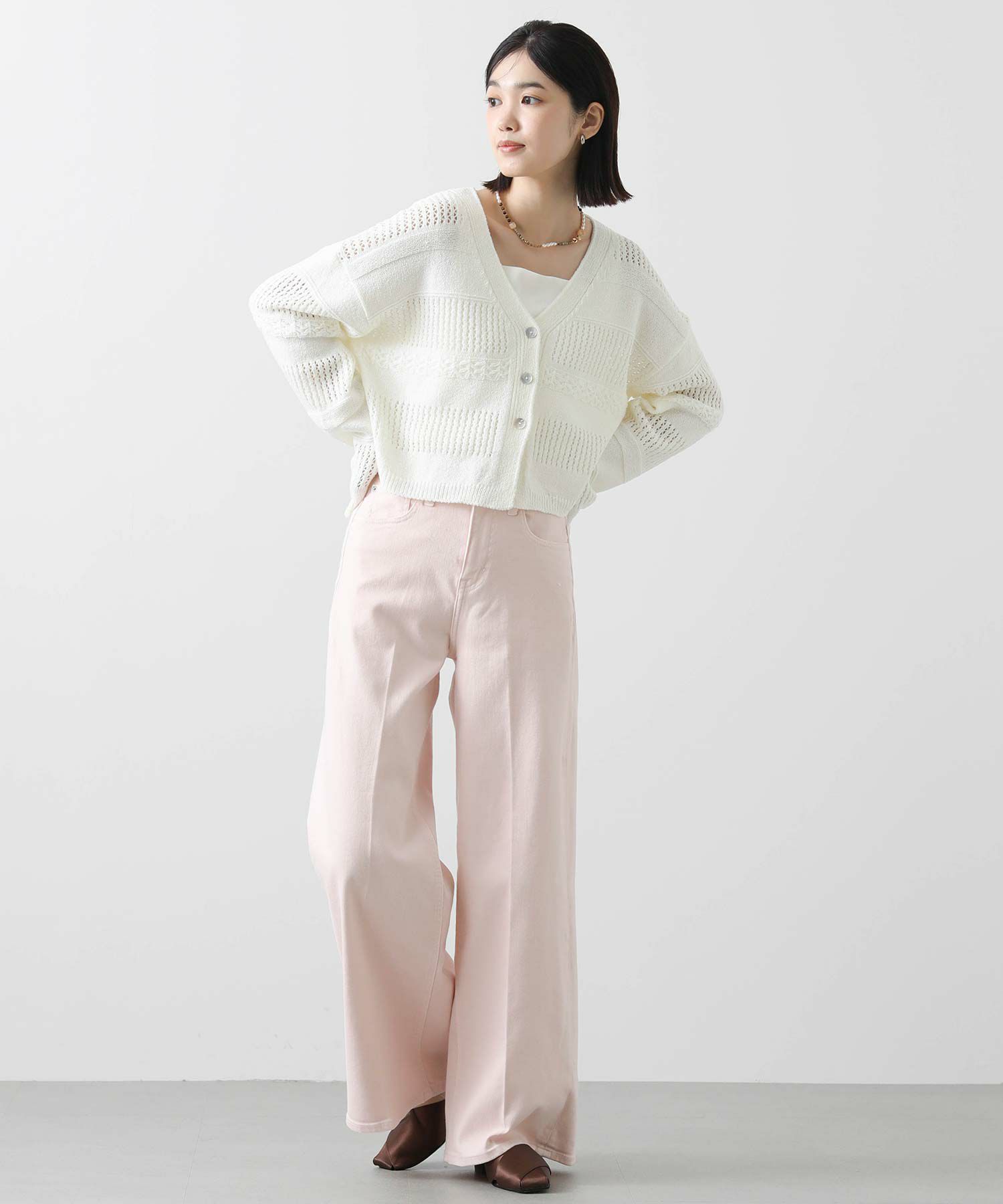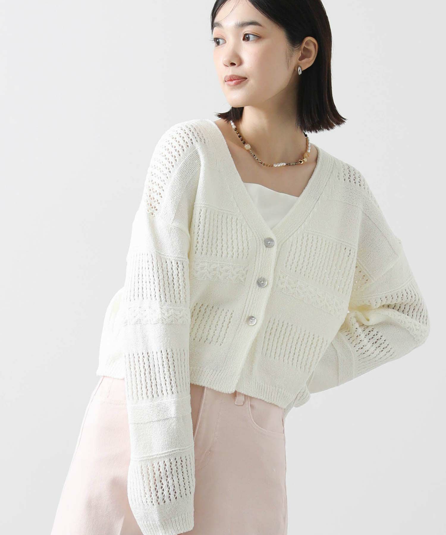 表面感のある編地が春ムードを高めてくれます。ボレロ風のショート丈は、スタイリングに今年らしさをプラスしてくれ、ワイドボトムやギャザースカート、ワンピースに羽織るなどスタイリングの幅が広がります。