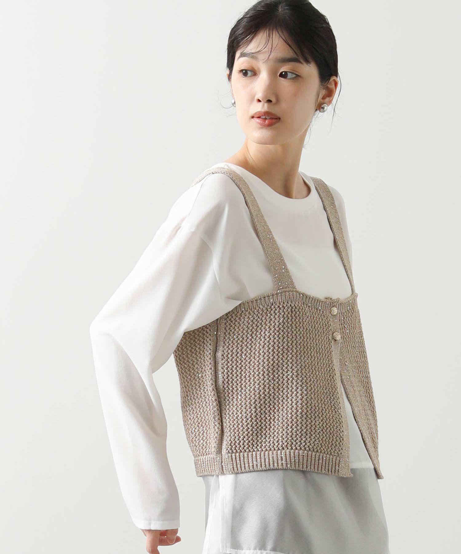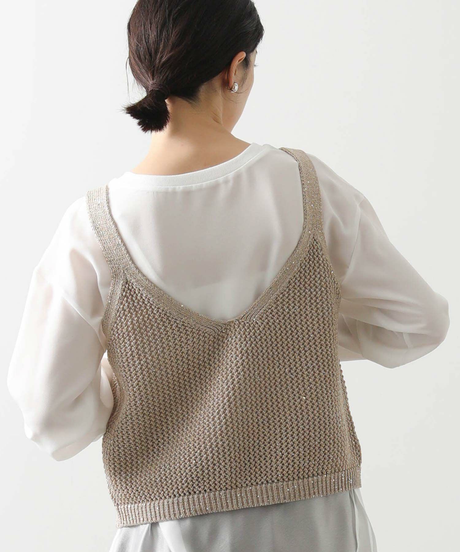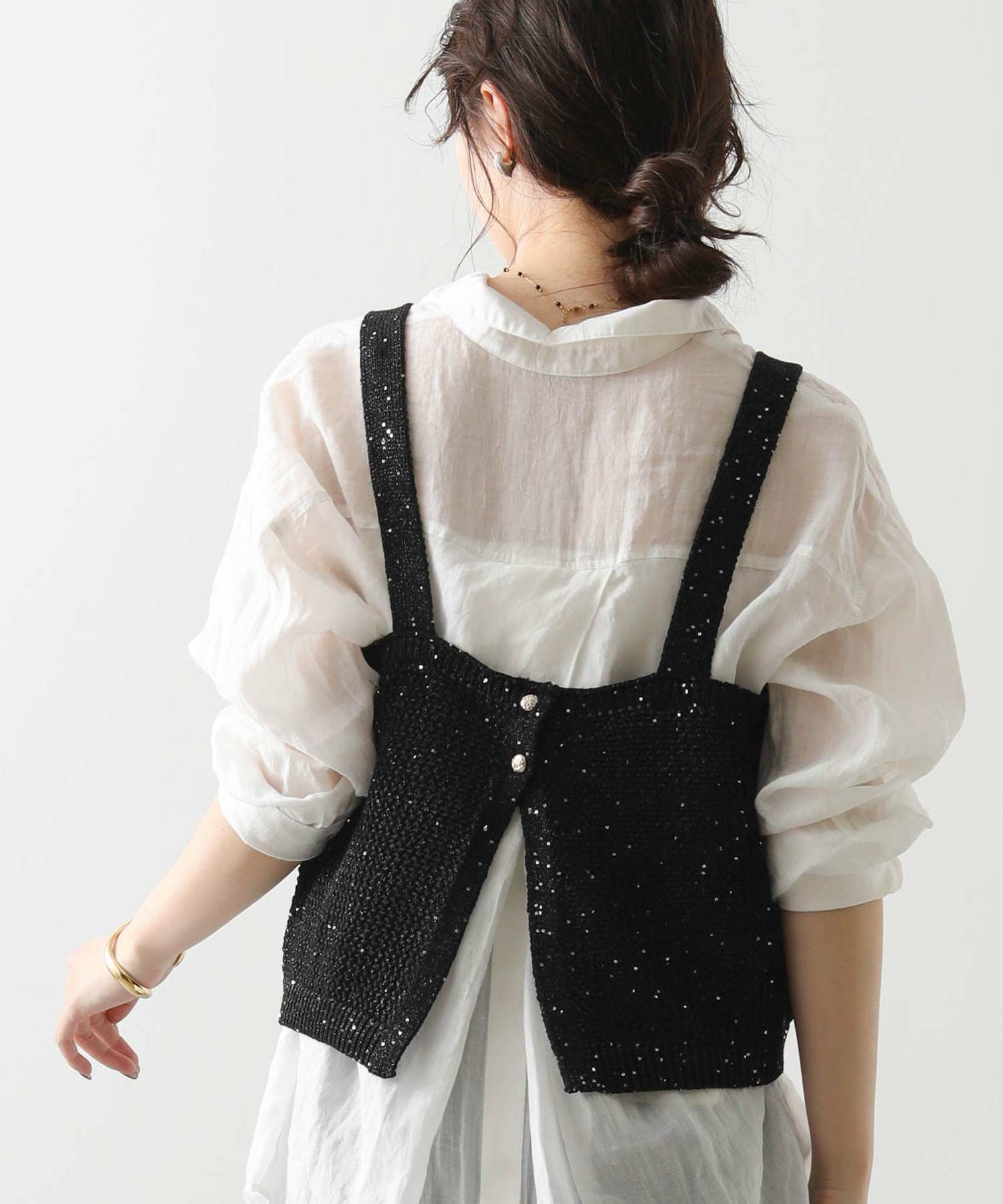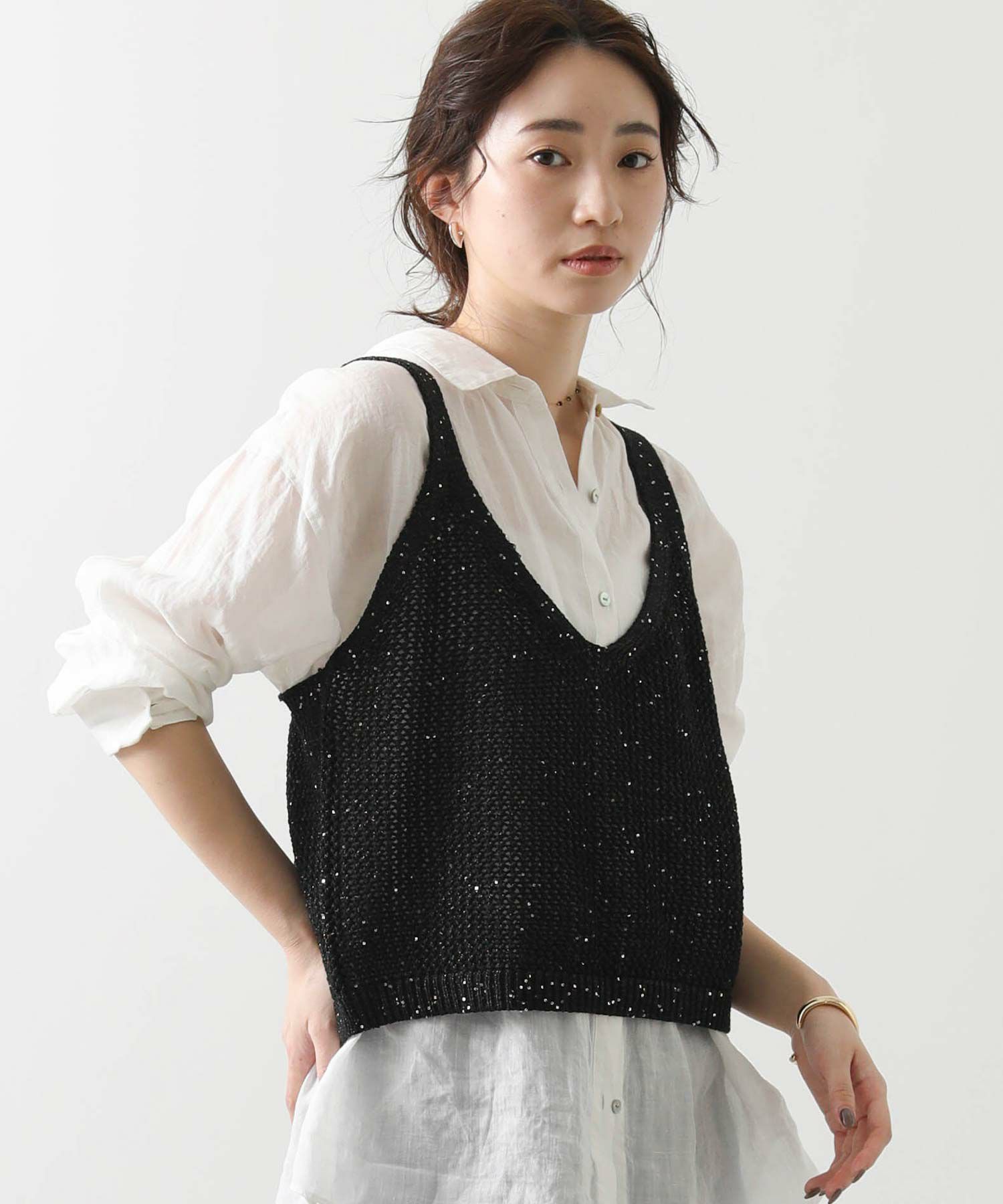 ラメ糸とスパンコールが編みこまれており、シンプルなデザインながらもさりげない煌めきが華やかさをプラスしてくれます。