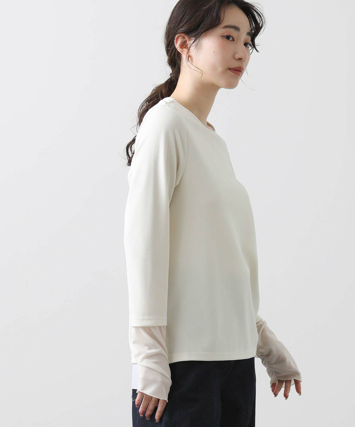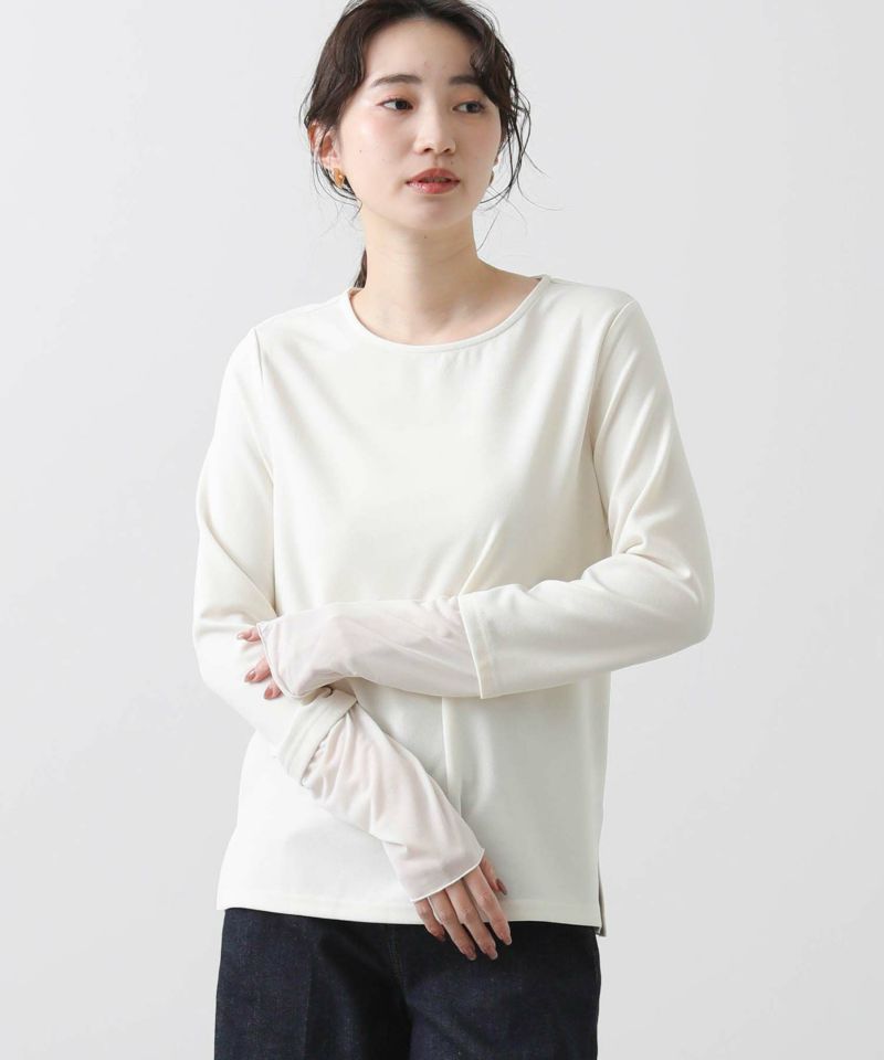 ジョーゼットの軽い素材感でロングシーズン着られる1枚。袖口をシアー素材で切り替えたデザインがポイントです。