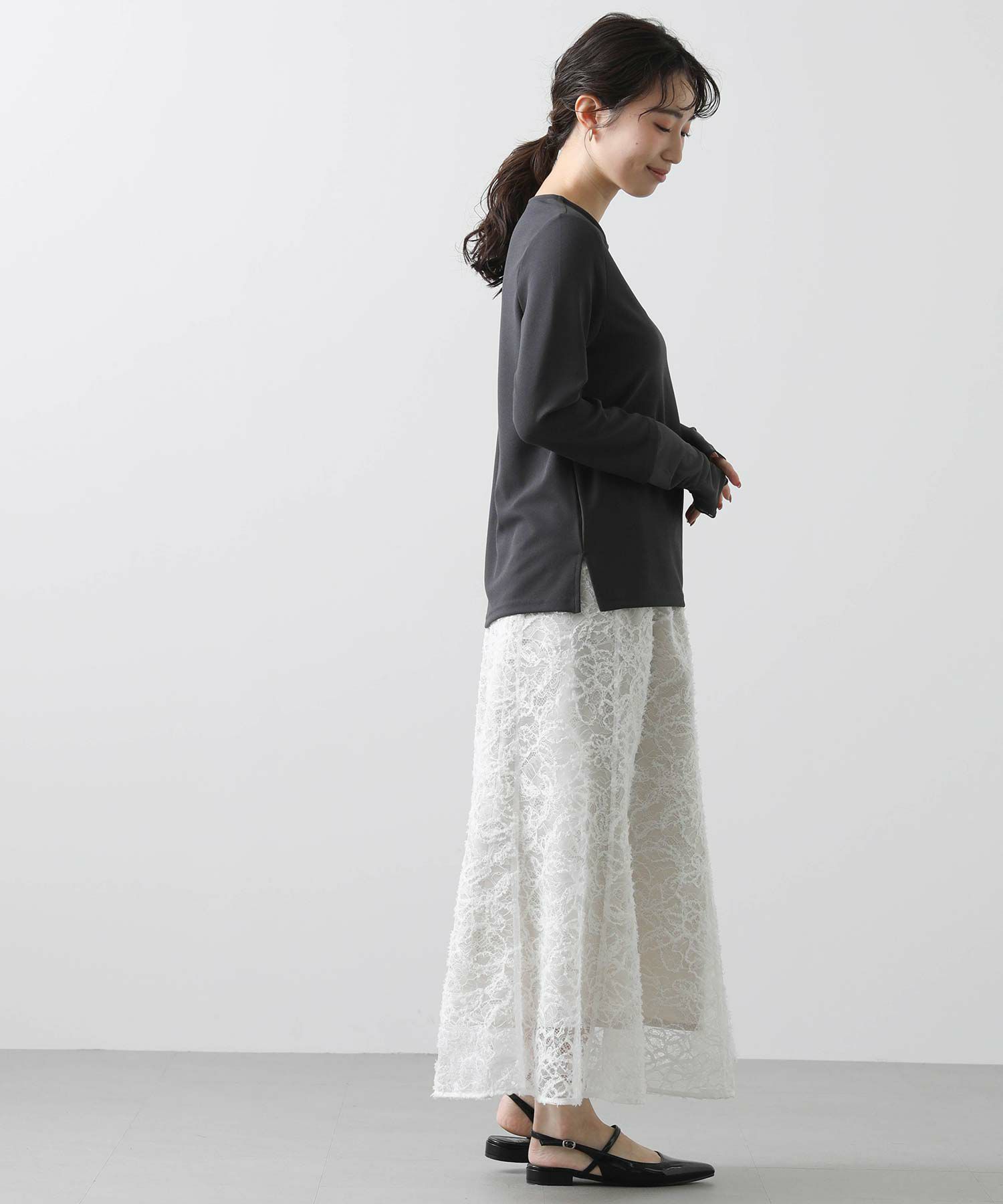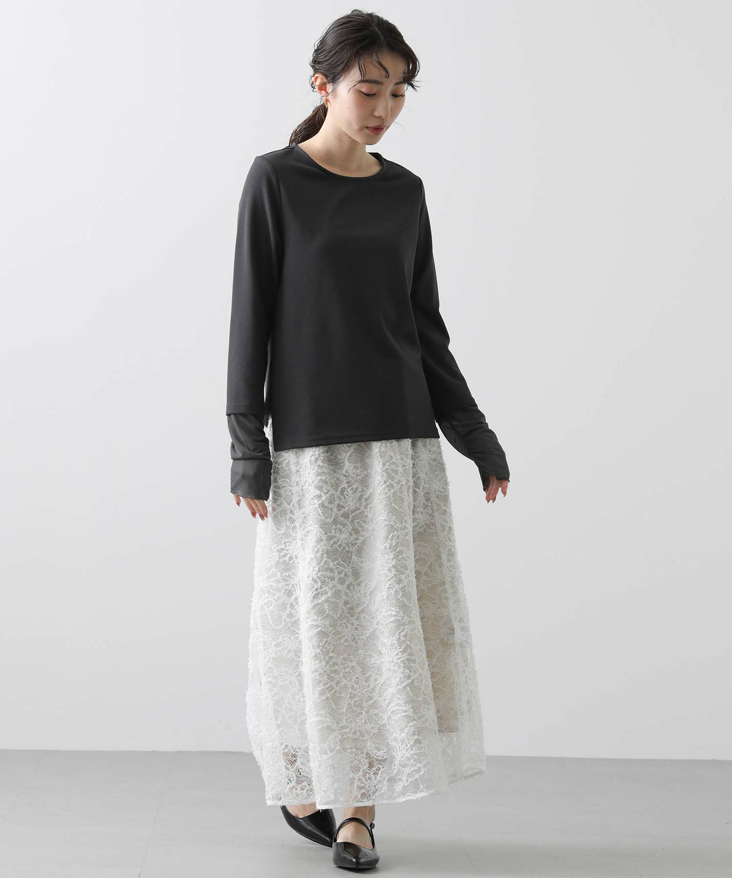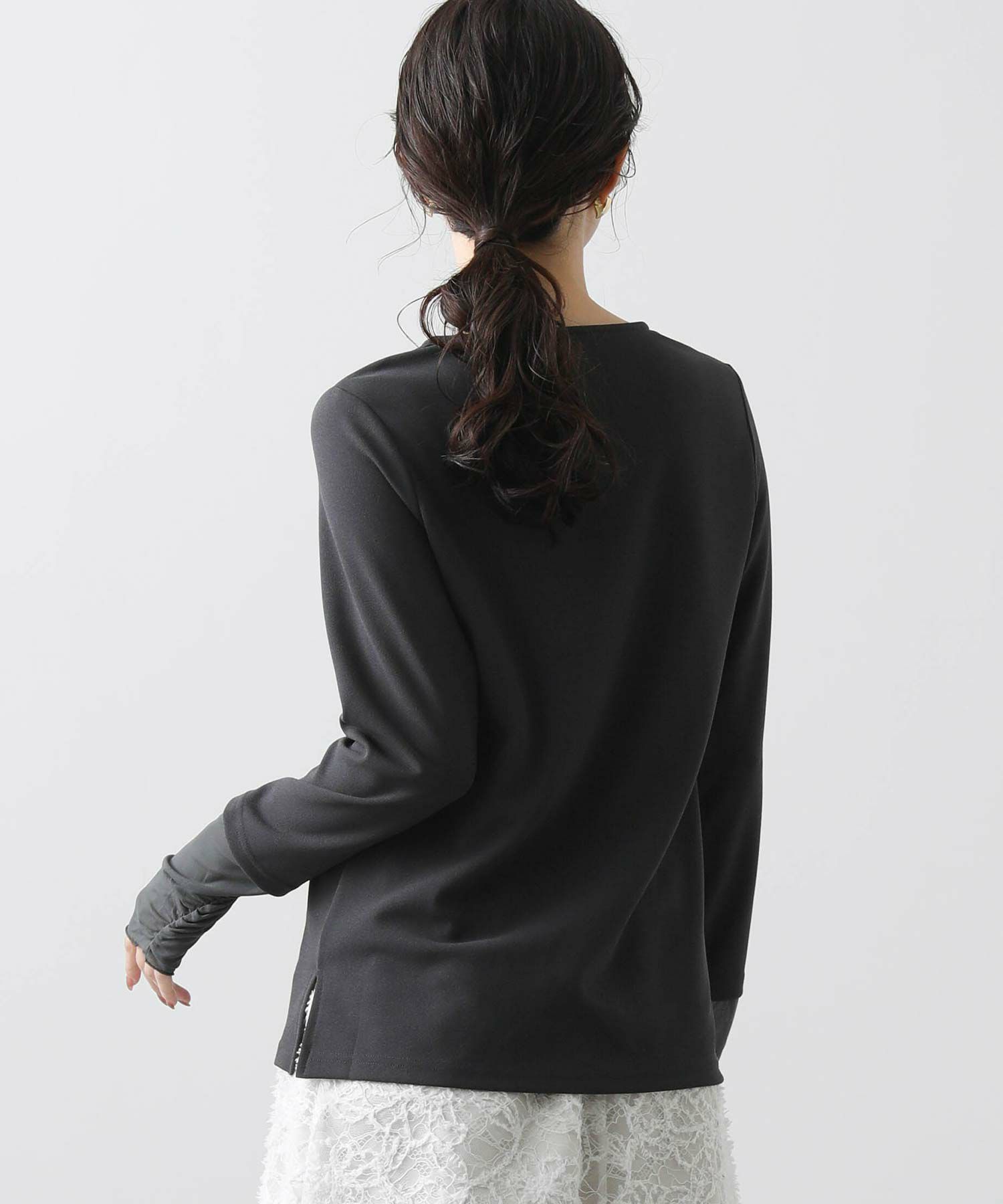 肌寒い季節のレイヤードアイテムとして、季節が進めば1枚着としてもお使い頂けます。程よい厚みのカットジョーゼット素材なので身体のラインを拾いにくく、肌離れも良いのが特徴です。