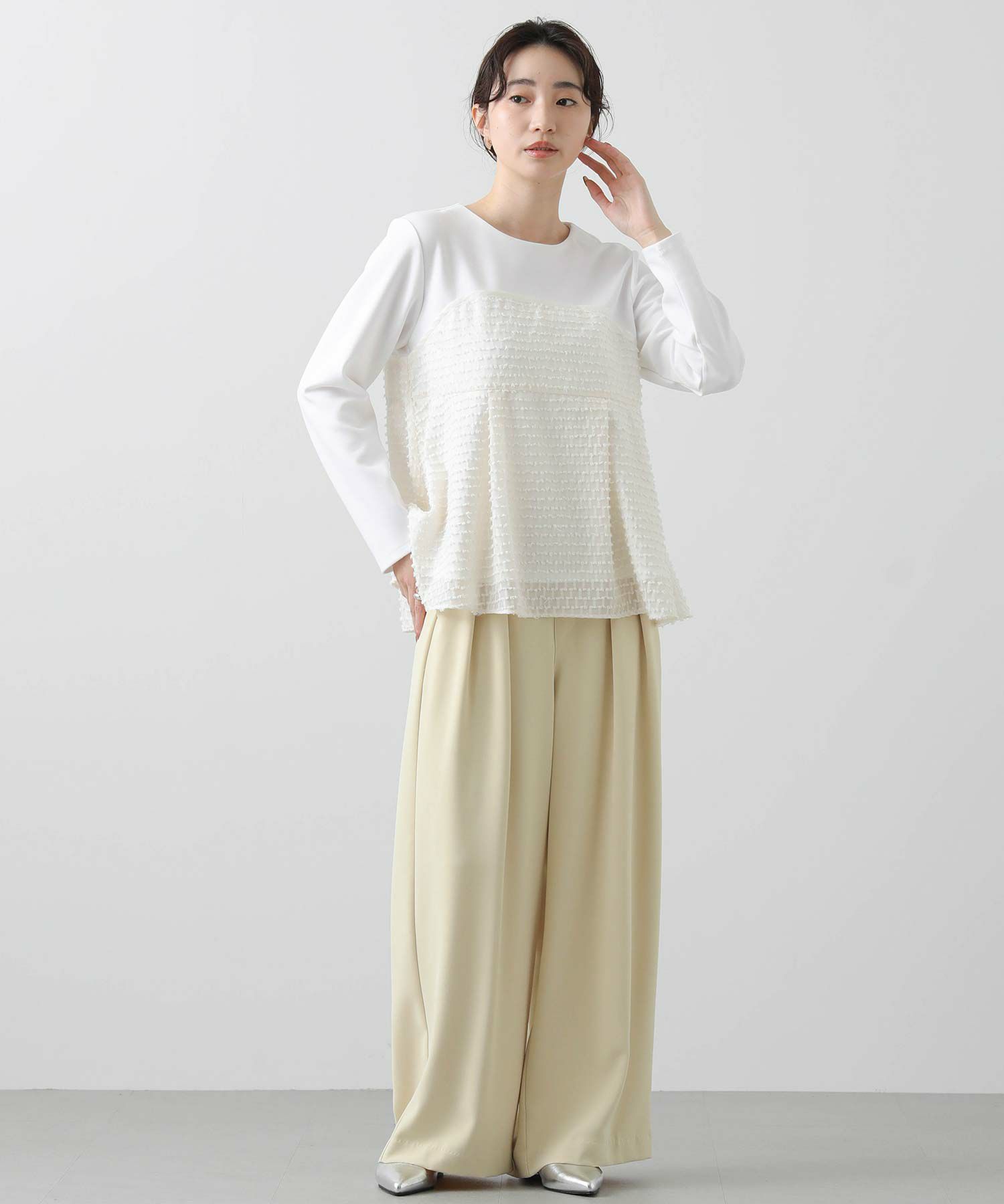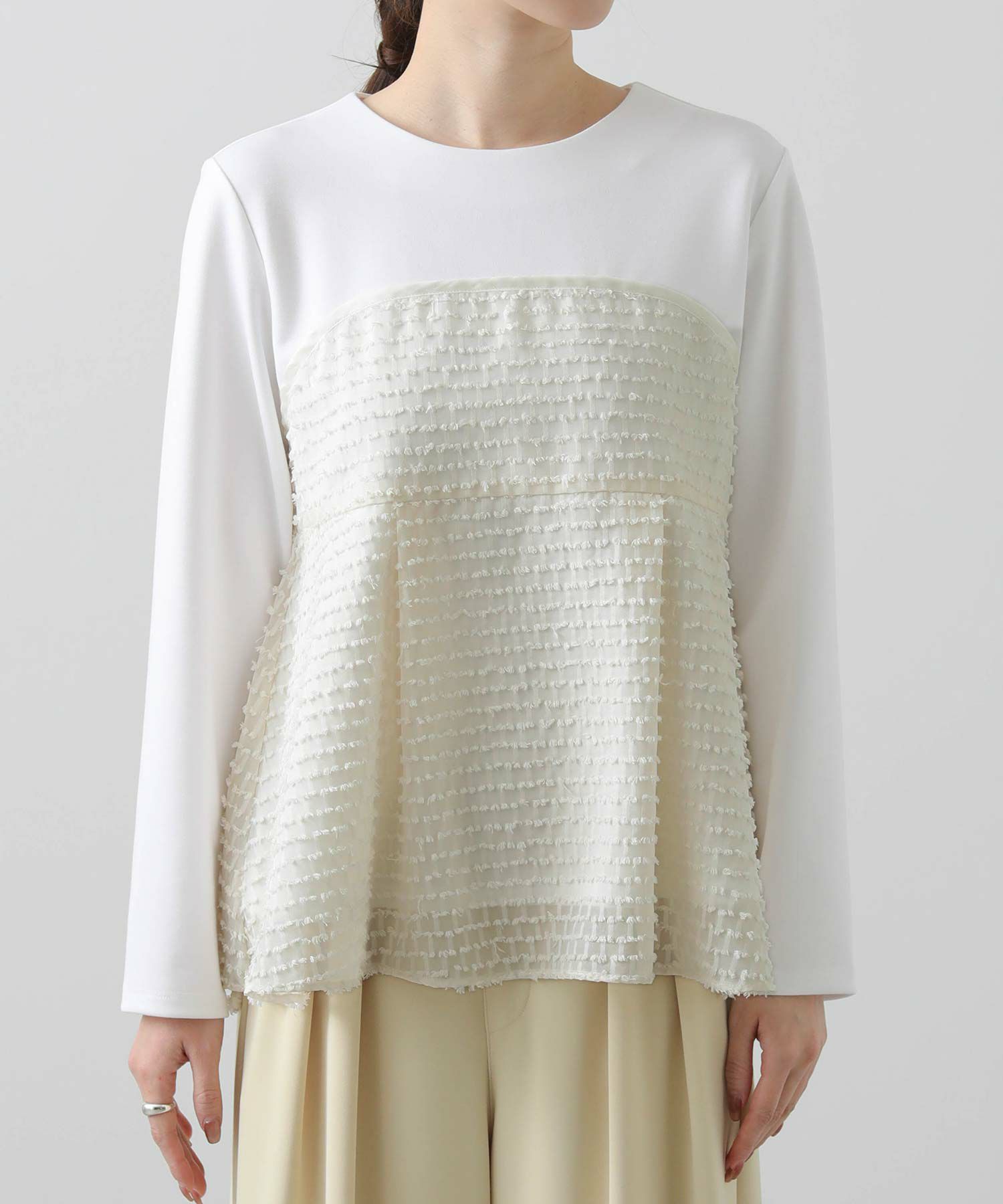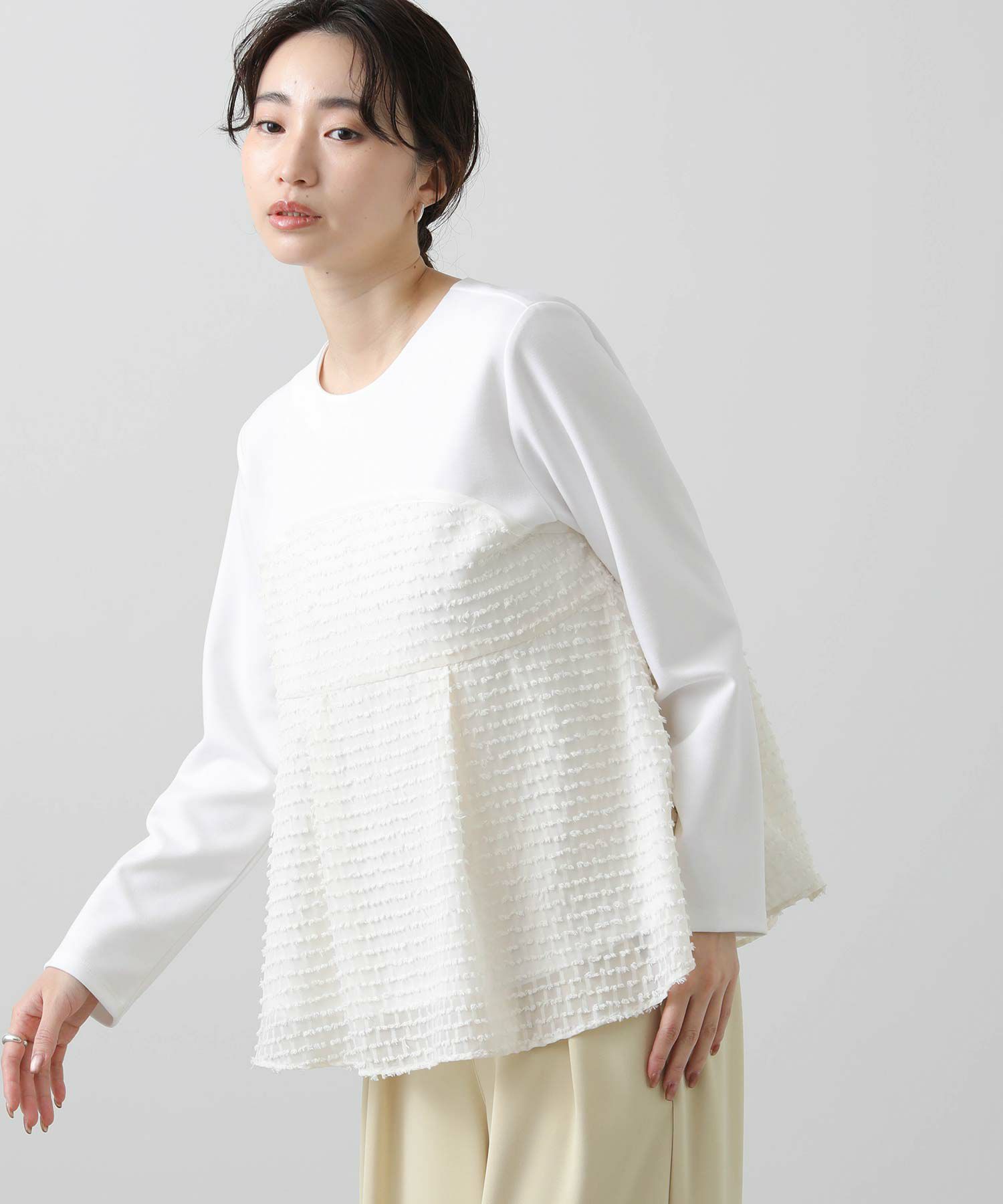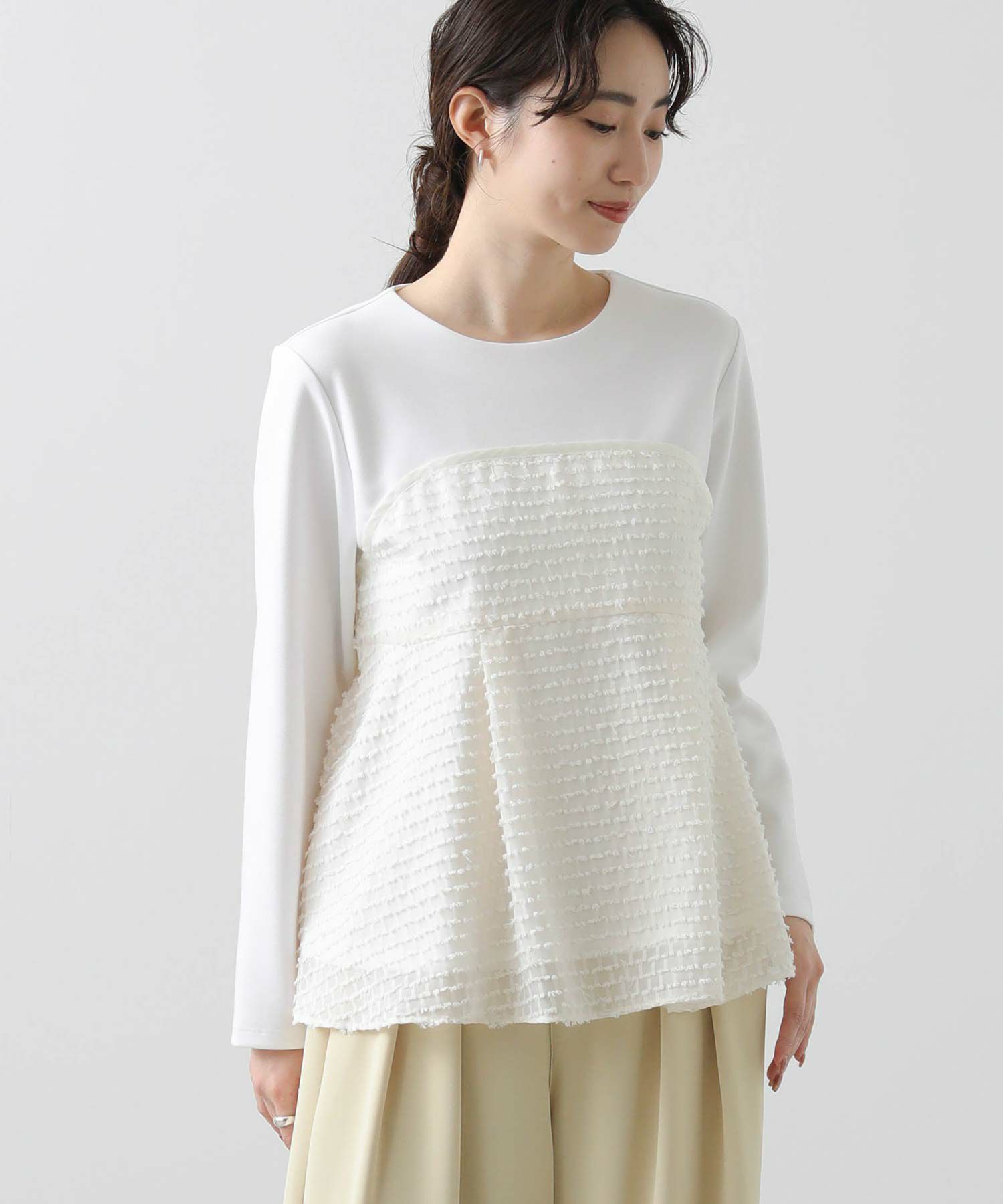 ベーシックなカットソーと立体的なフリンジ生地の組み合わせが、カジュアルながらエレガントさのある女性らしい1着。