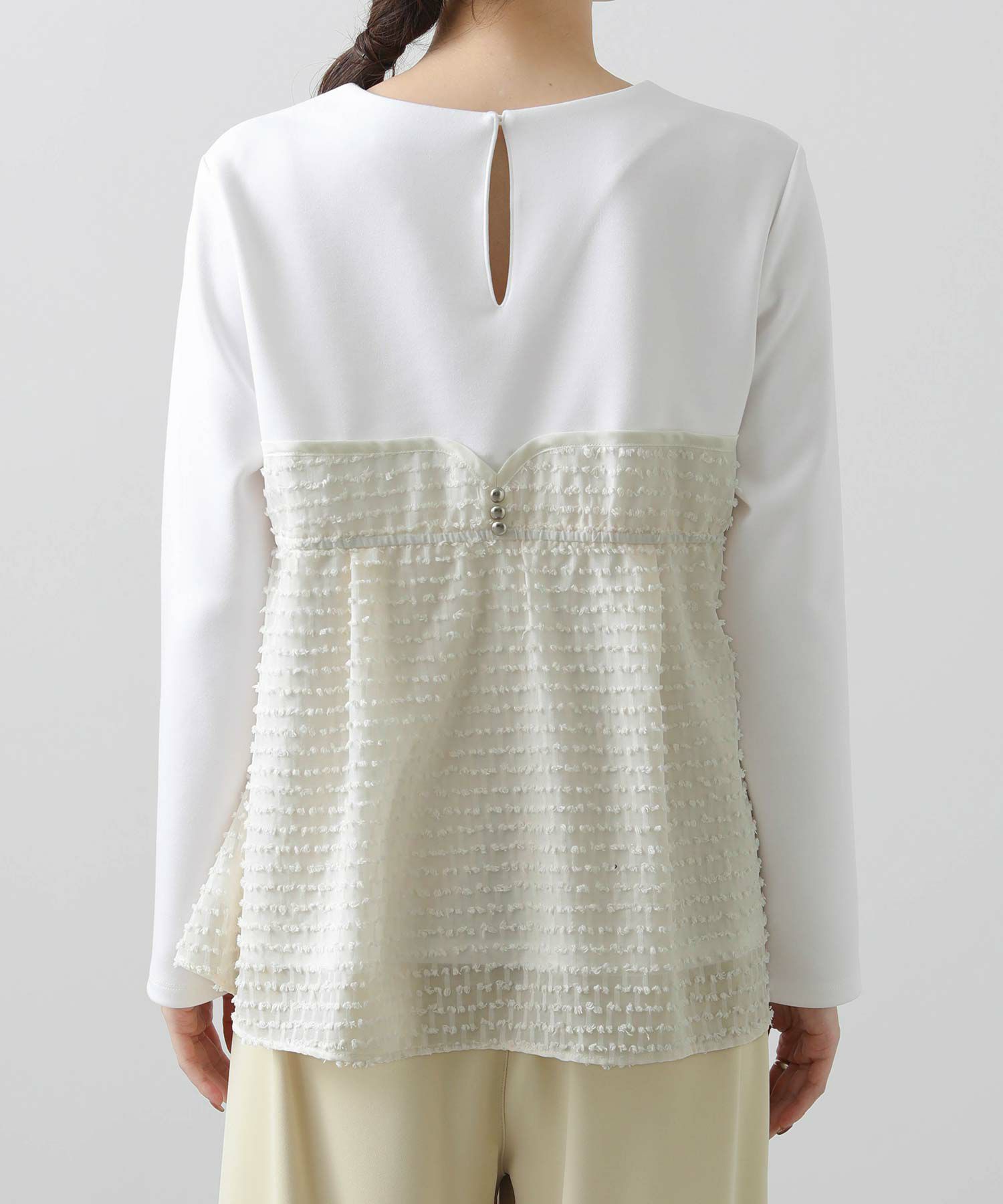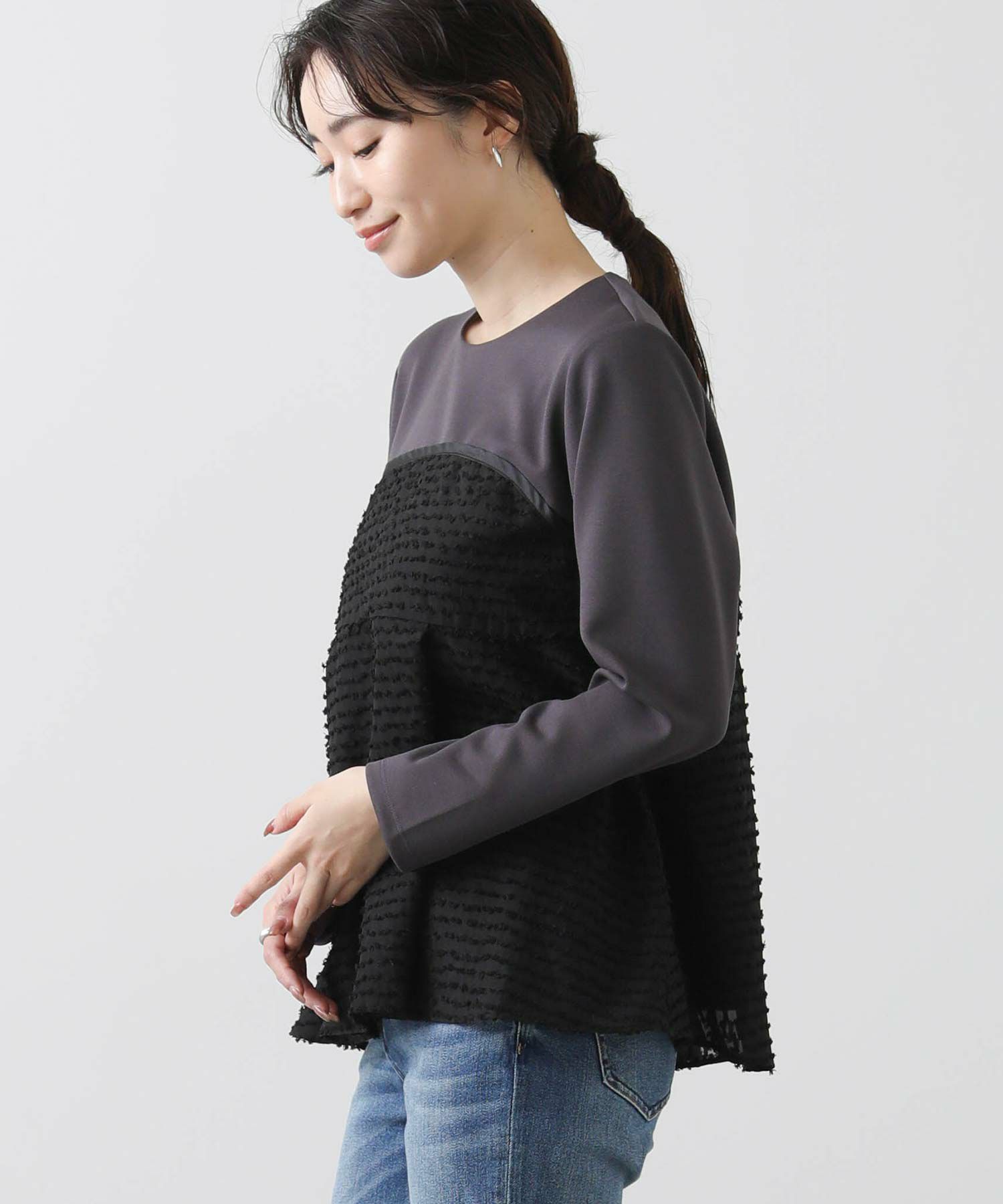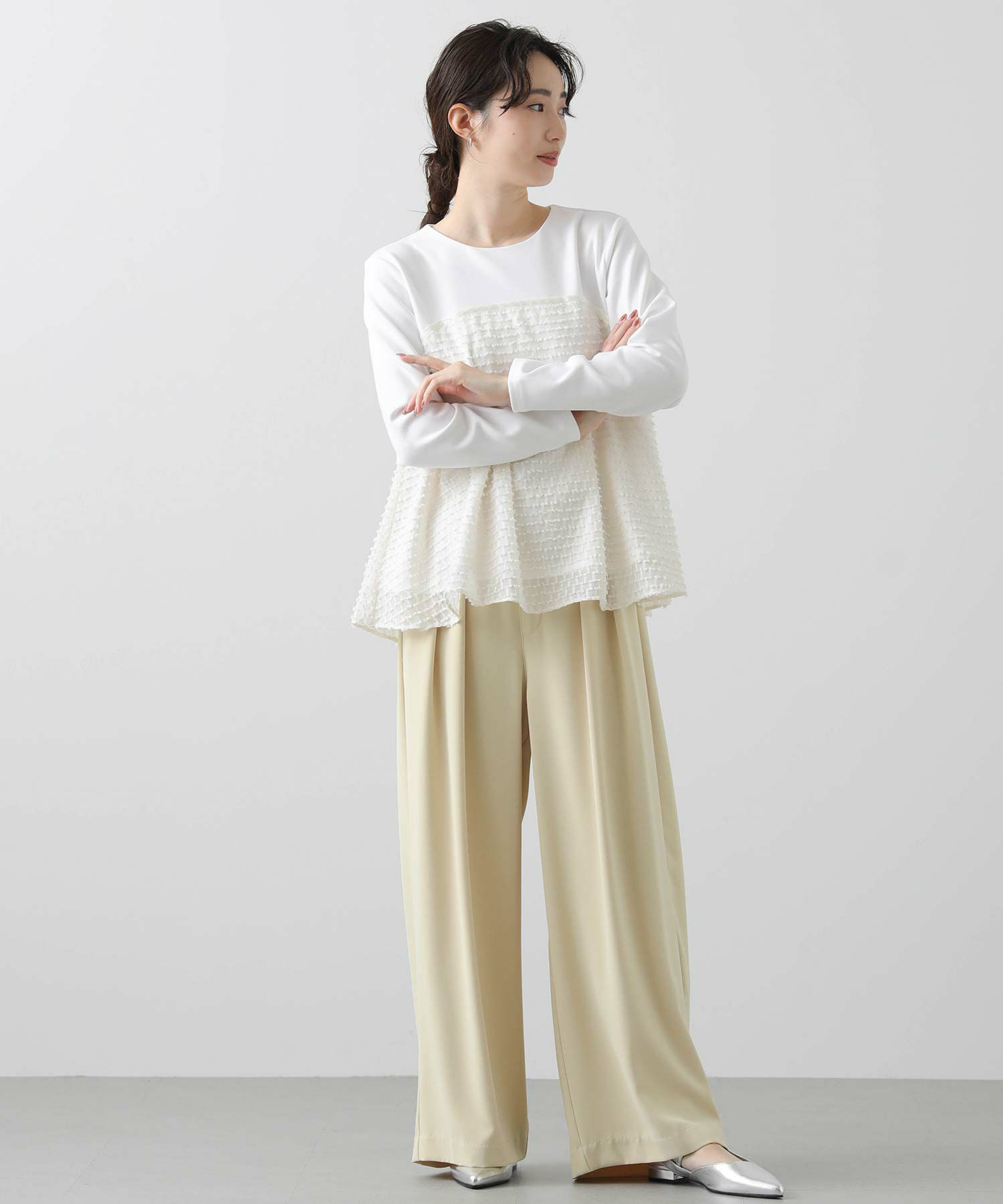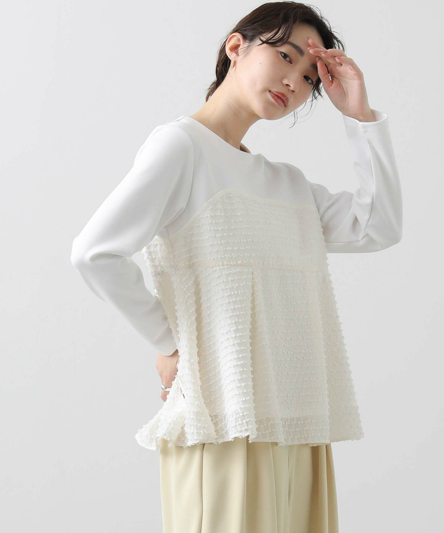 ベーシックなカットソーと立体的なフリンジ生地の組み合わせが、カジュアルながらエレガントさのある女性らしい1着。