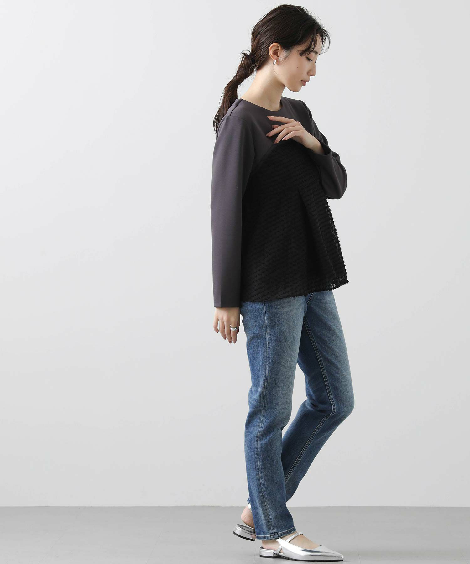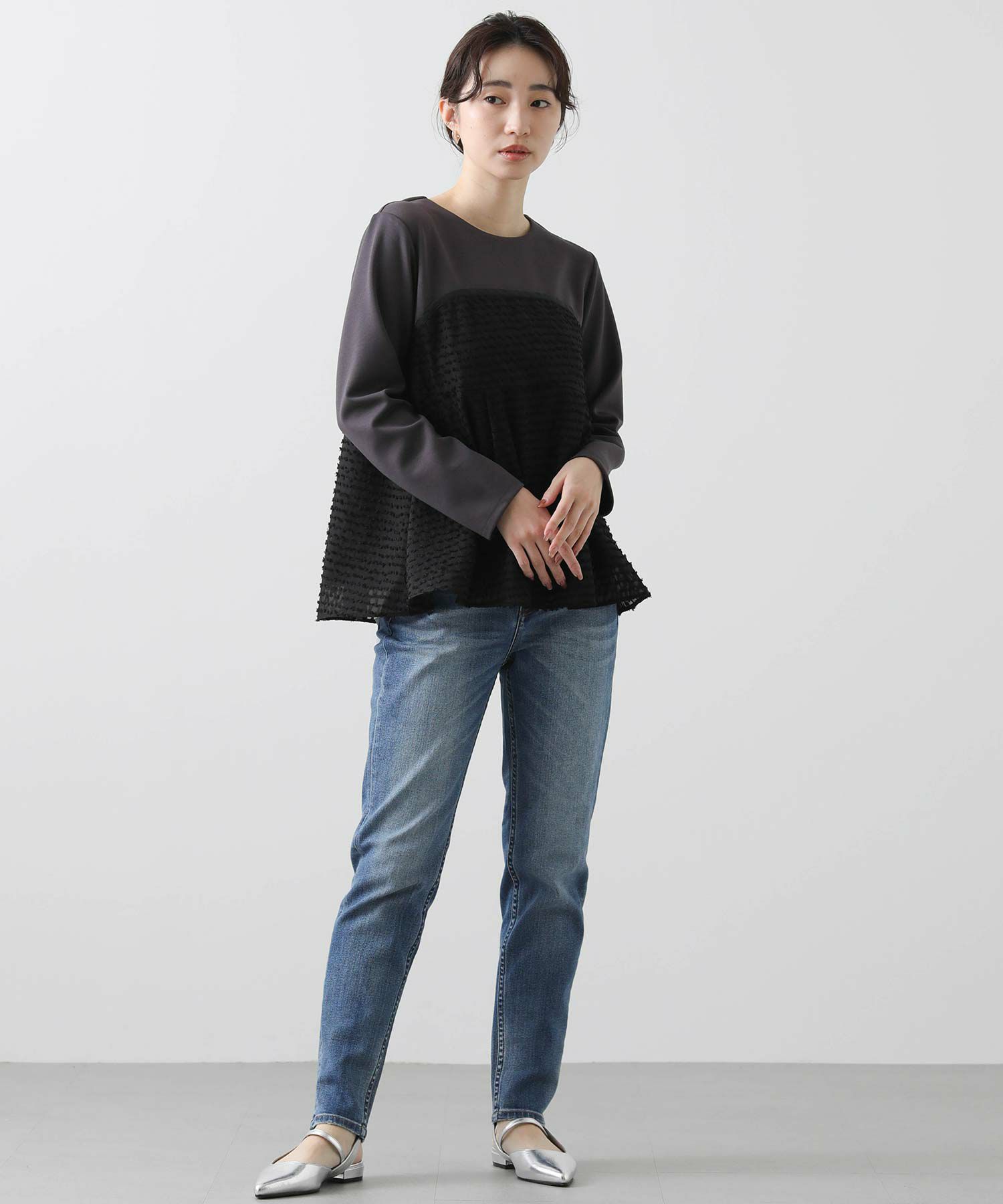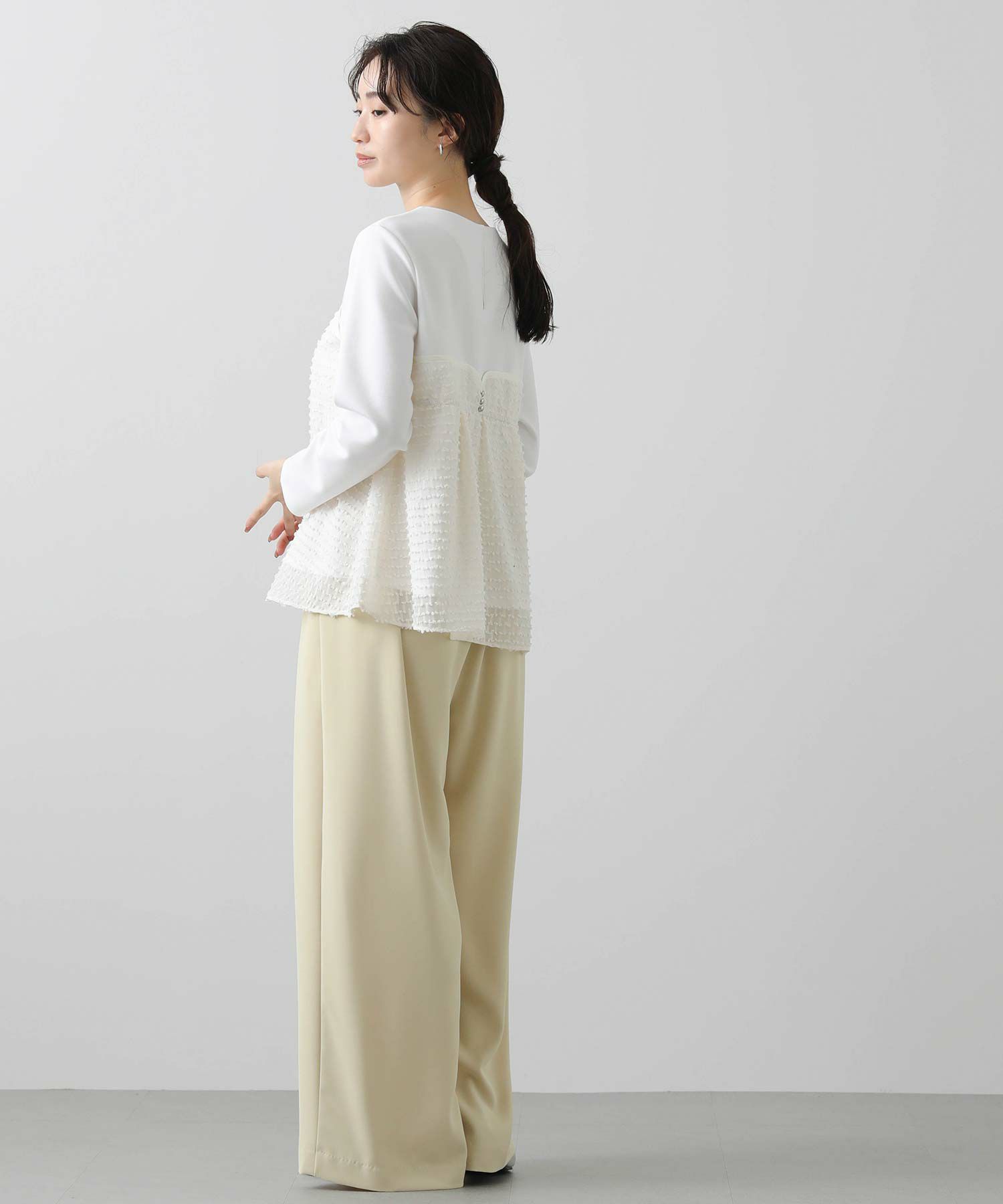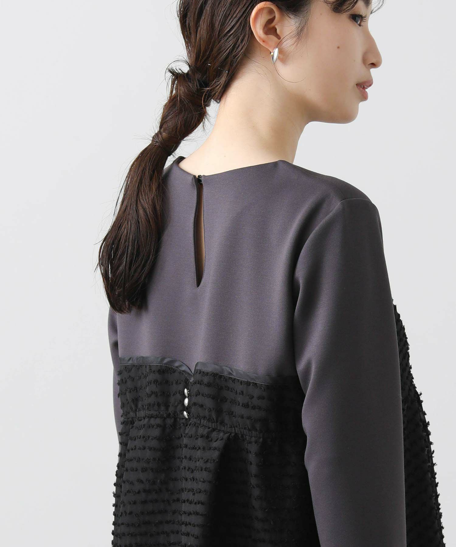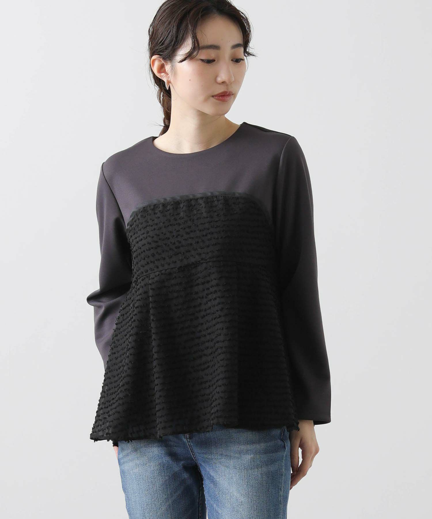 ベーシックなカットソーと立体的なフリンジ生地の組み合わせが、カジュアルながらエレガントさのある女性らしい1着。