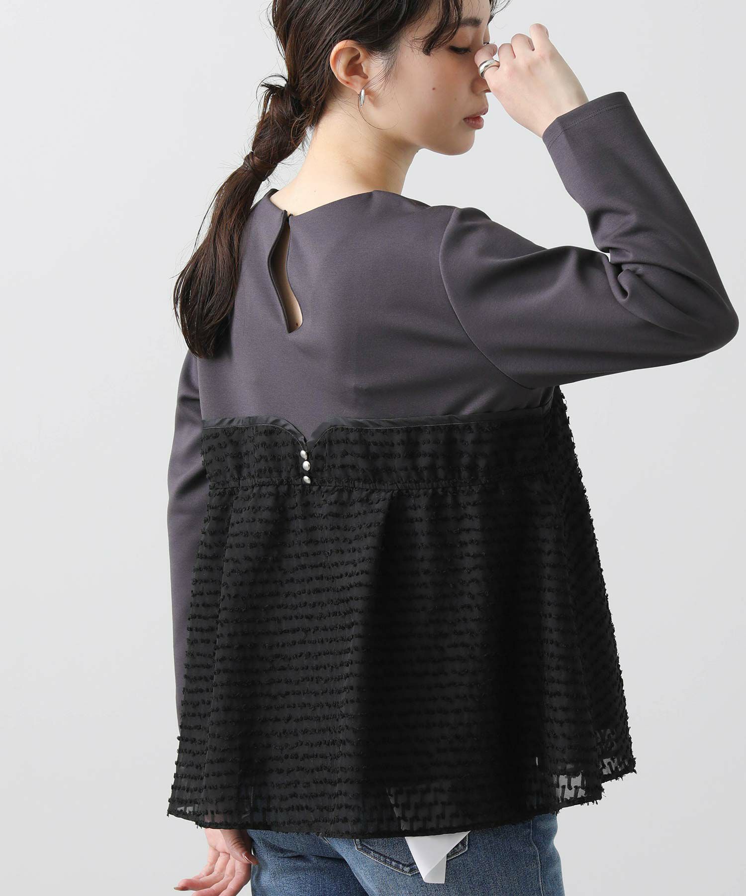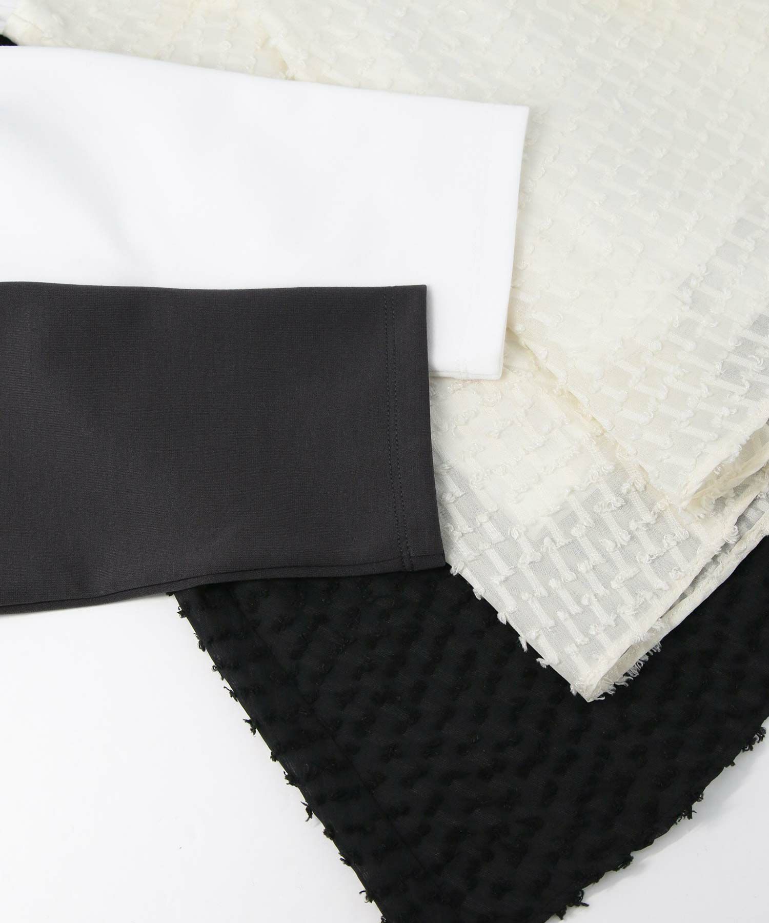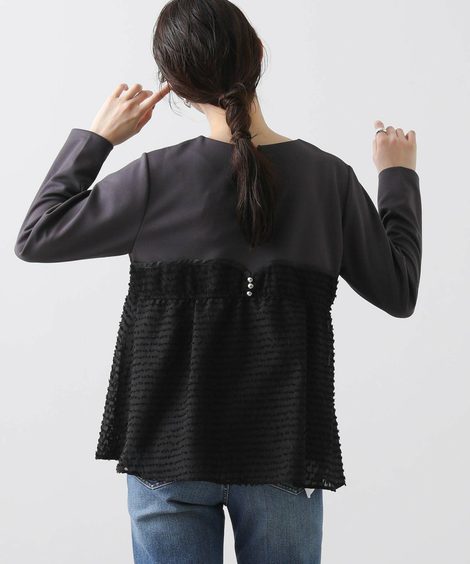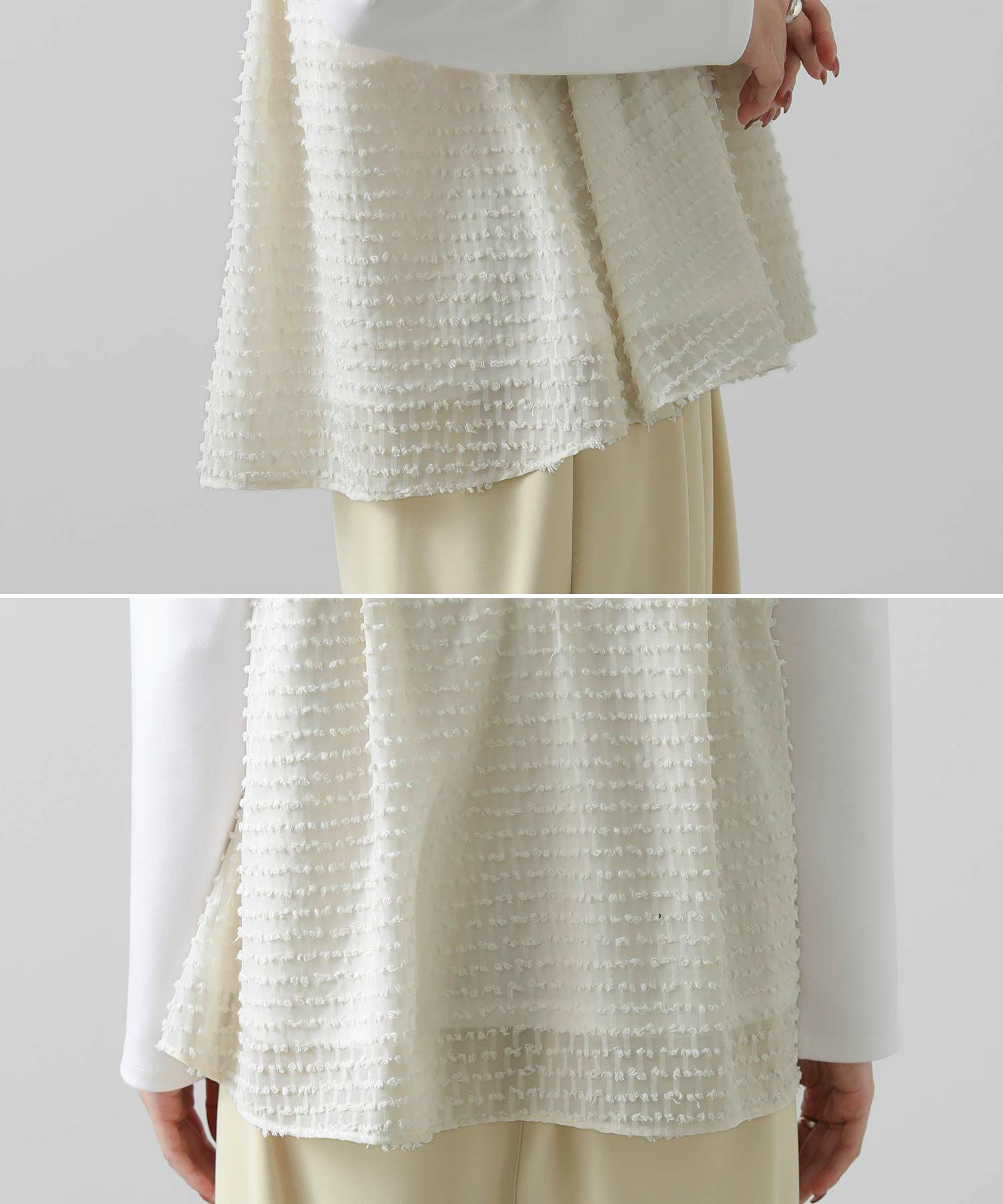 ベーシックなカットソーと立体的なフリンジ生地の組み合わせが、カジュアルながらエレガントさのある女性らしい1着。