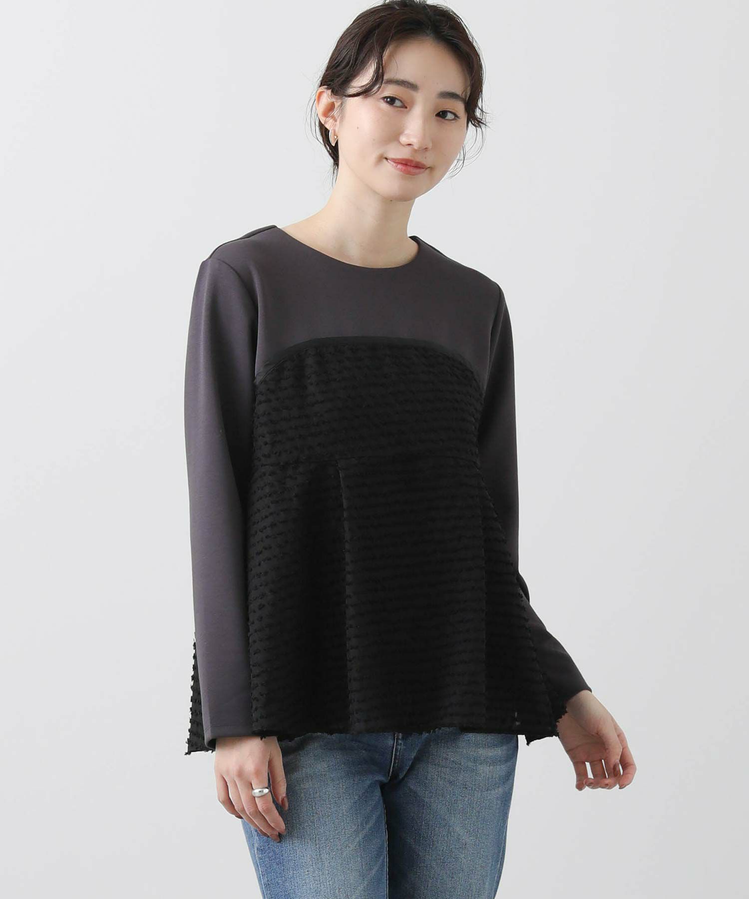 ベーシックなカットソーと立体的なフリンジ生地の組み合わせが、カジュアルながらエレガントさのある女性らしい1着。