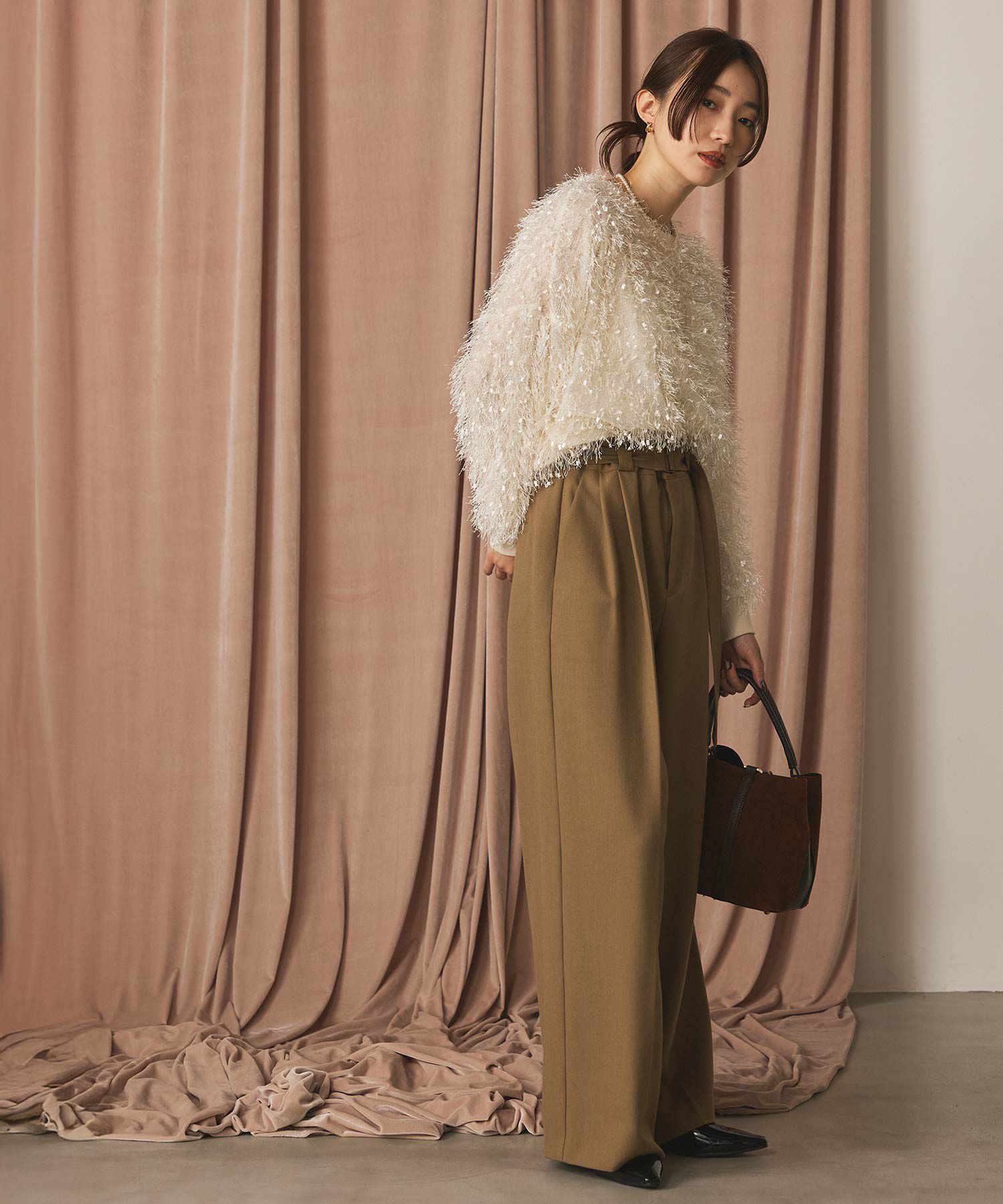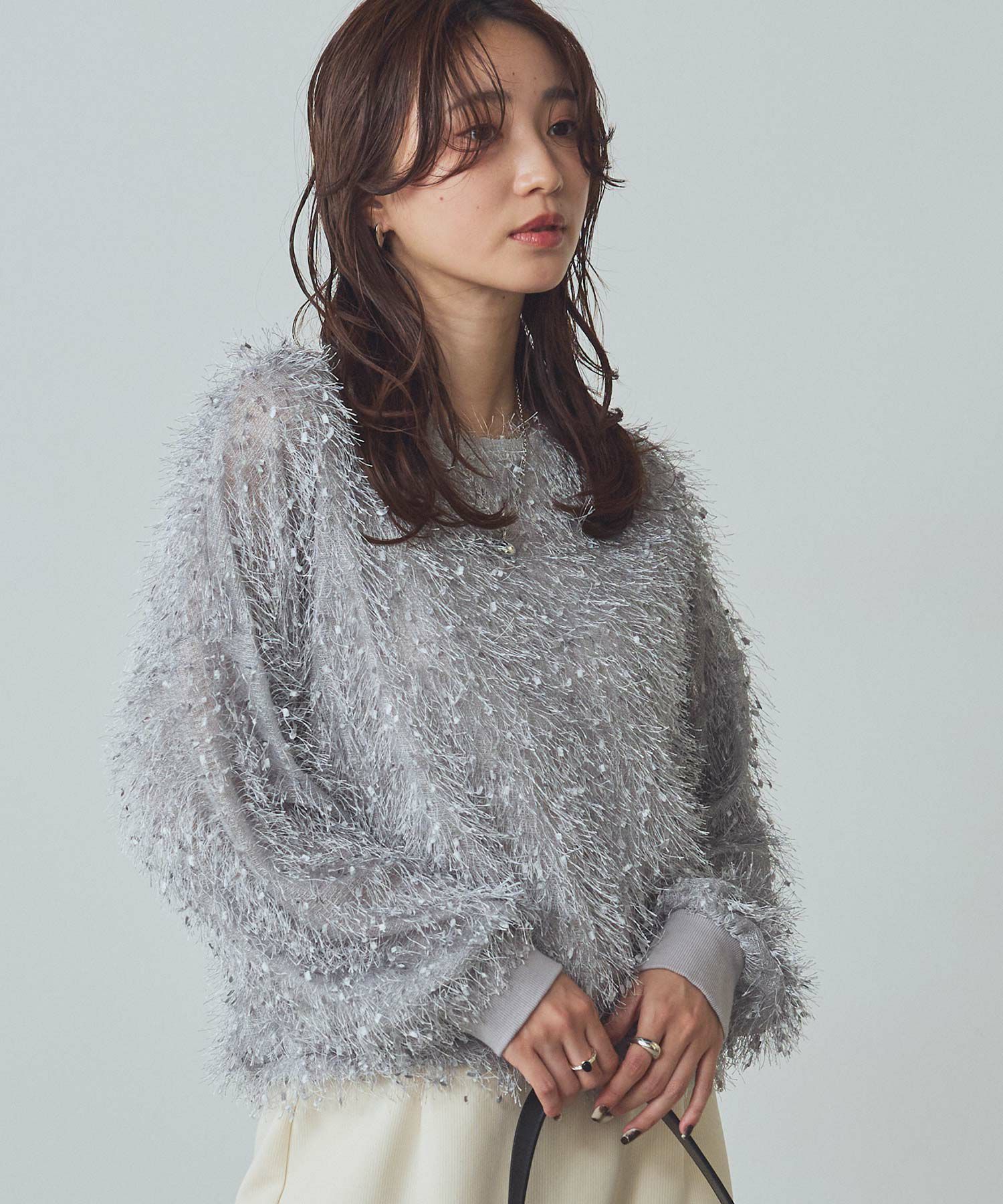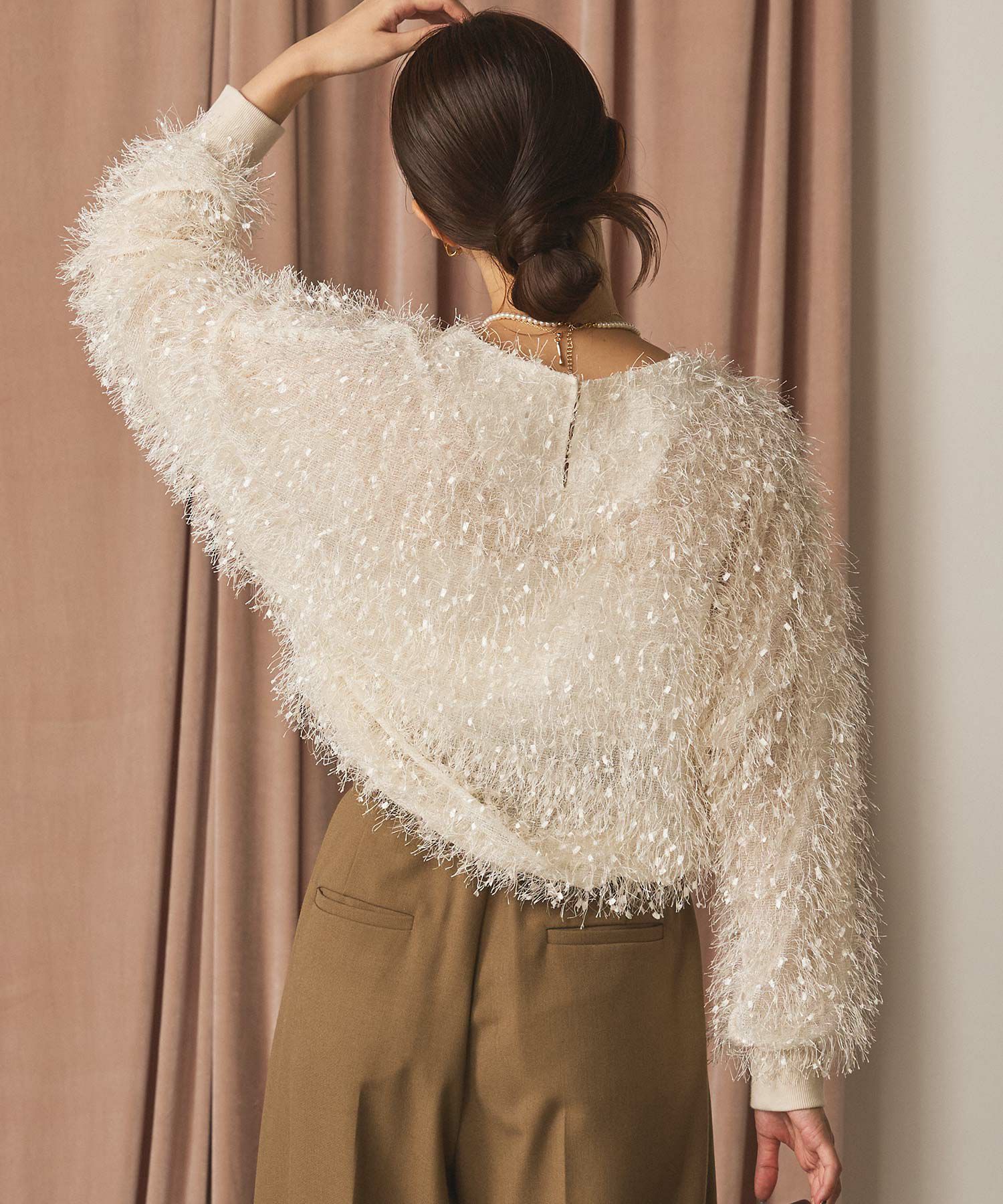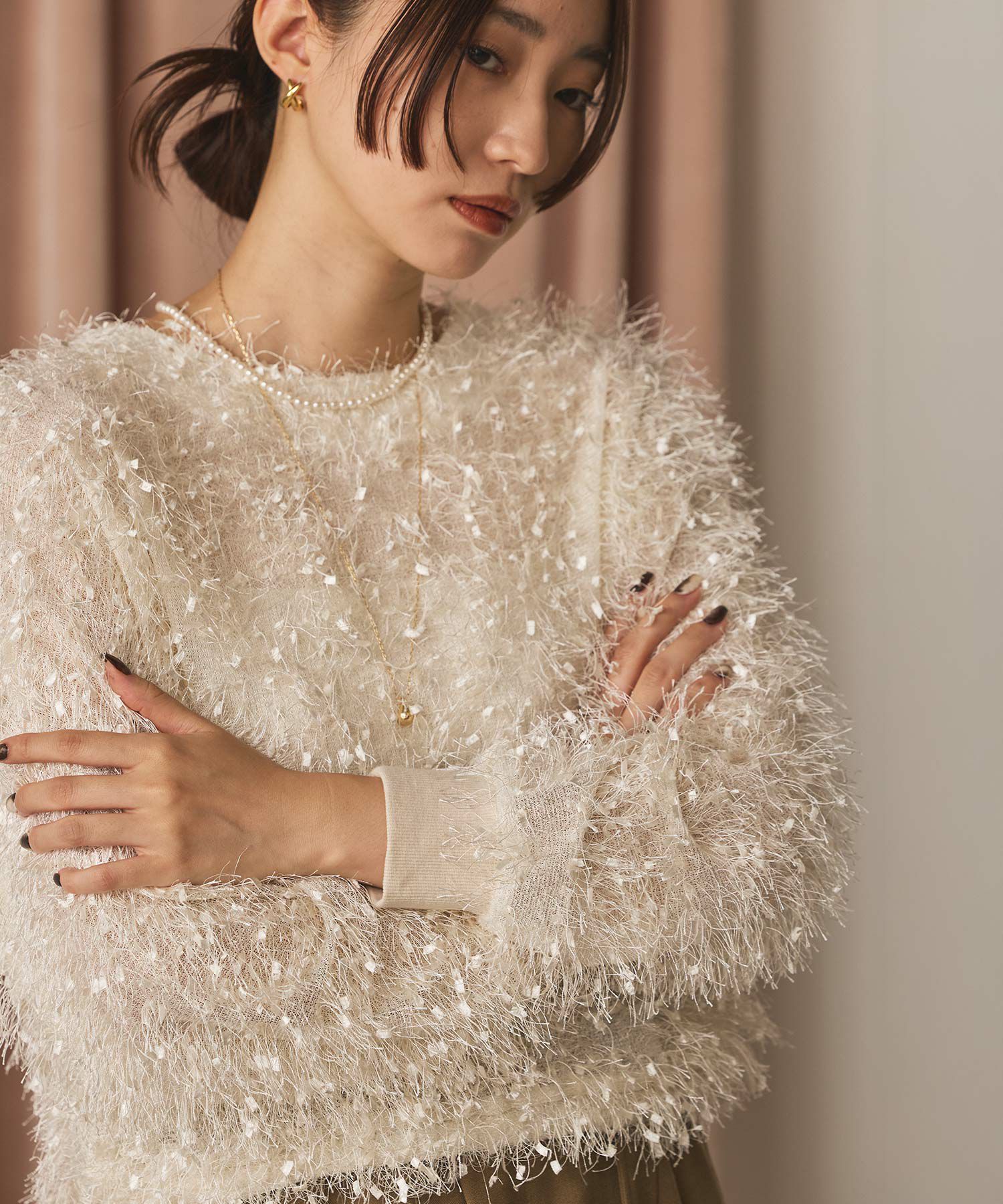 柔らかな毛足と光沢感のある素材が織り込まれたブラウスは、休日のスタイルに上品な華やかさを添えてくれる一枚です。