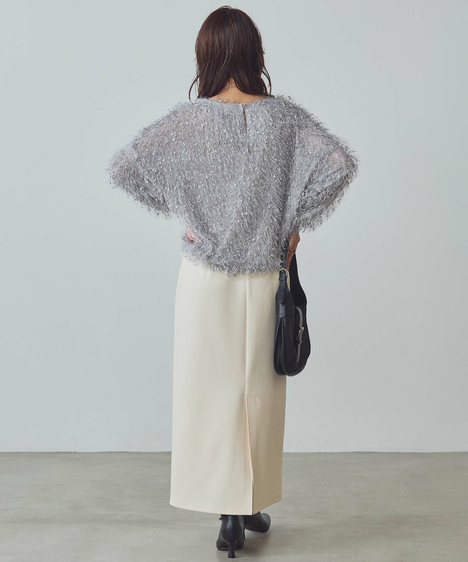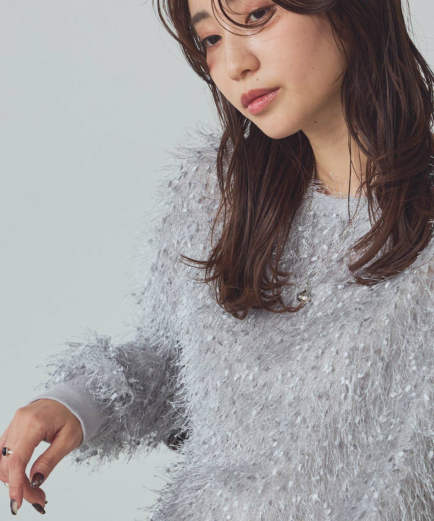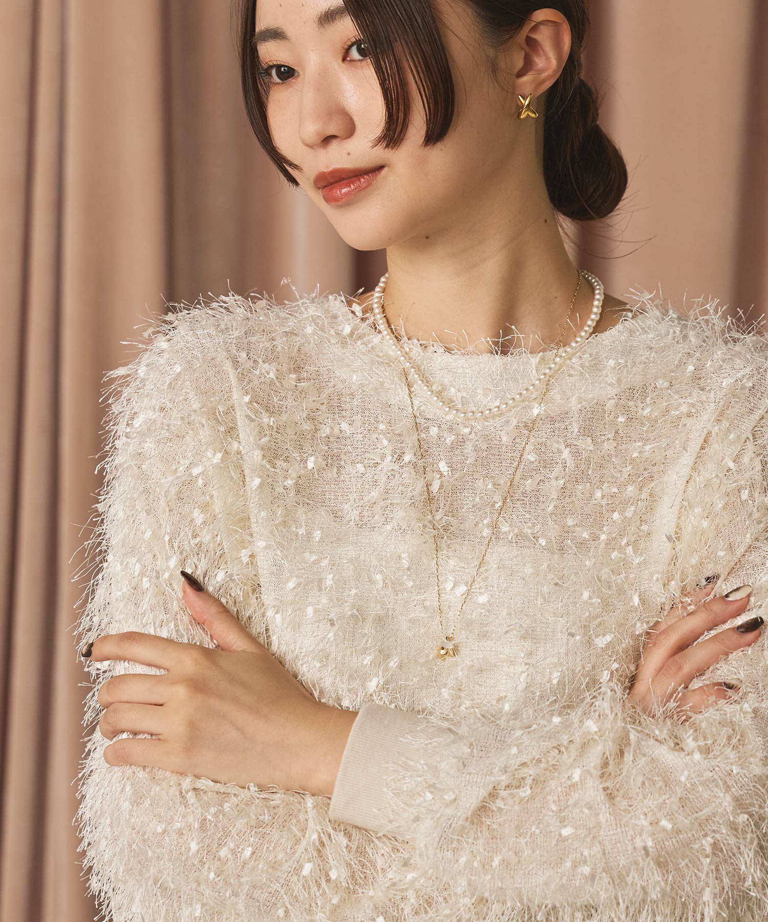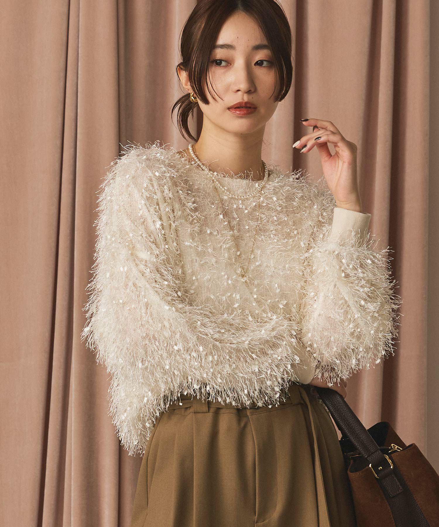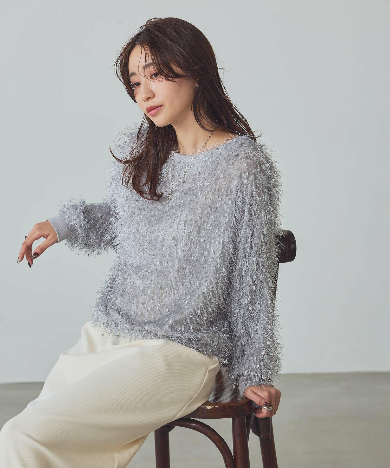 柔らかな毛足と光沢感のある素材が織り込まれたブラウスは、休日のスタイルに上品な華やかさを添えてくれる一枚です。
