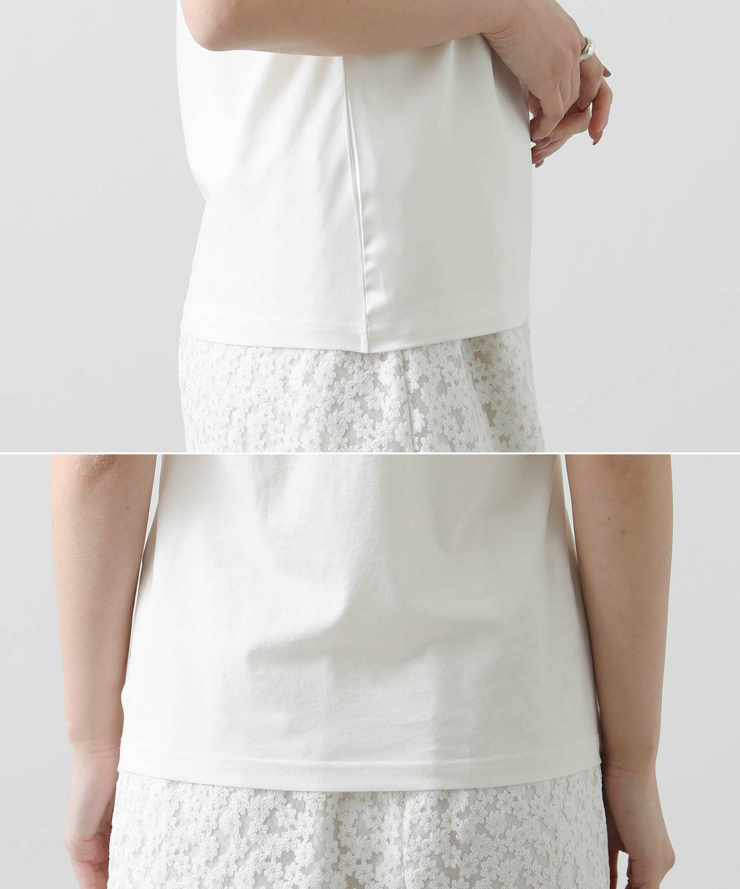 後ろ身頃やサイドにはドライタッチなカットソー素材を使用。肌に張り付きにくく、さらりとした快適な着心地。