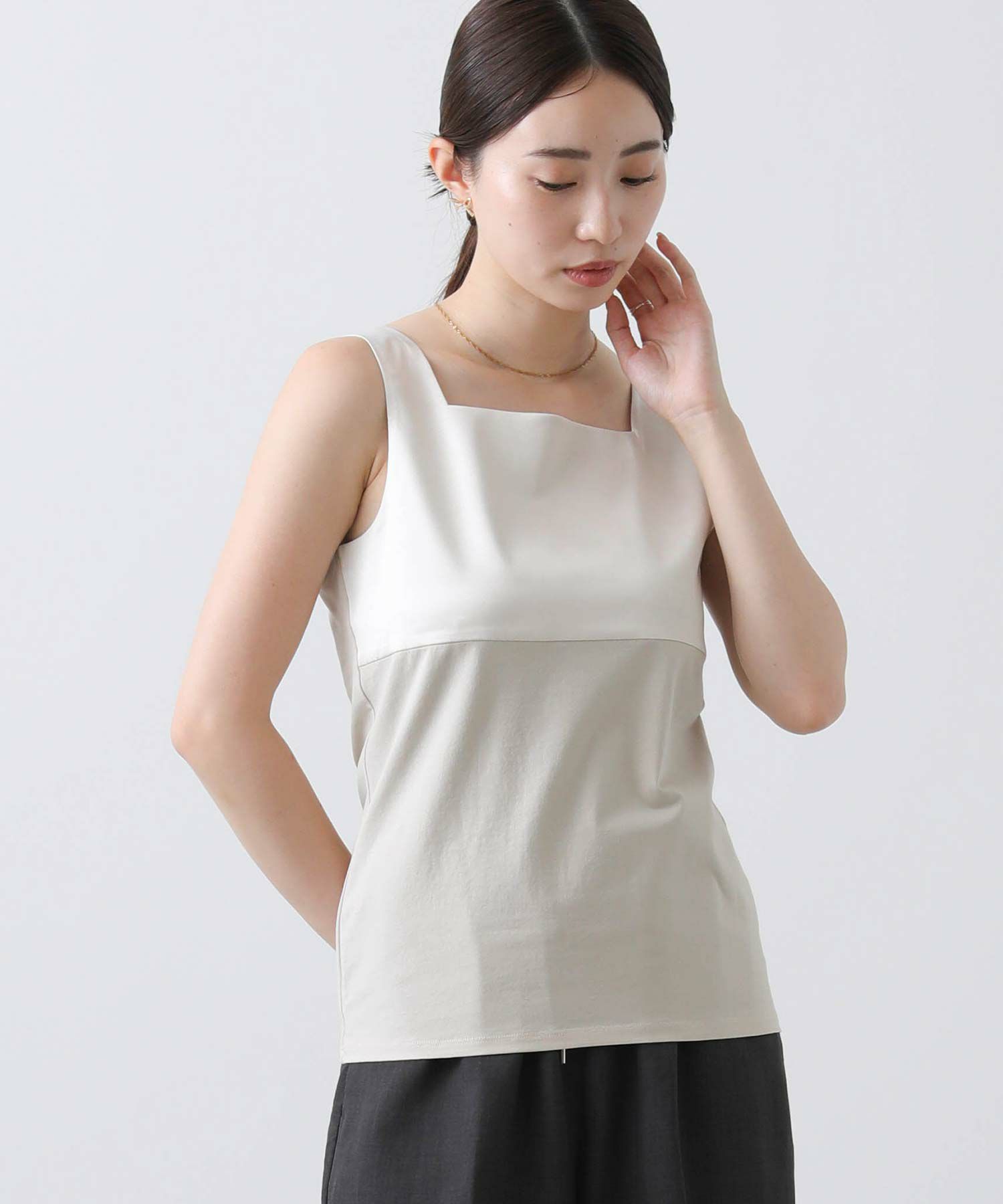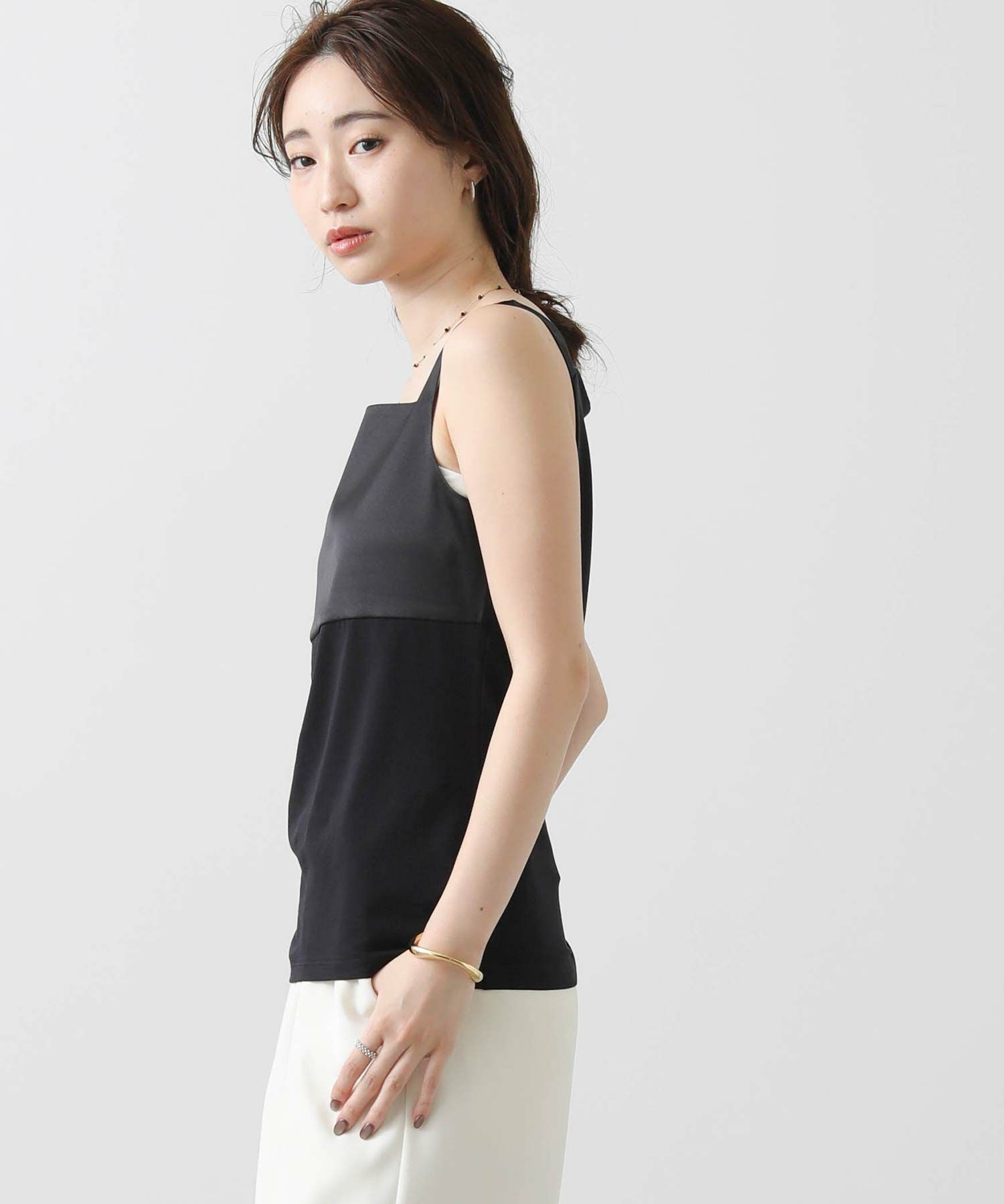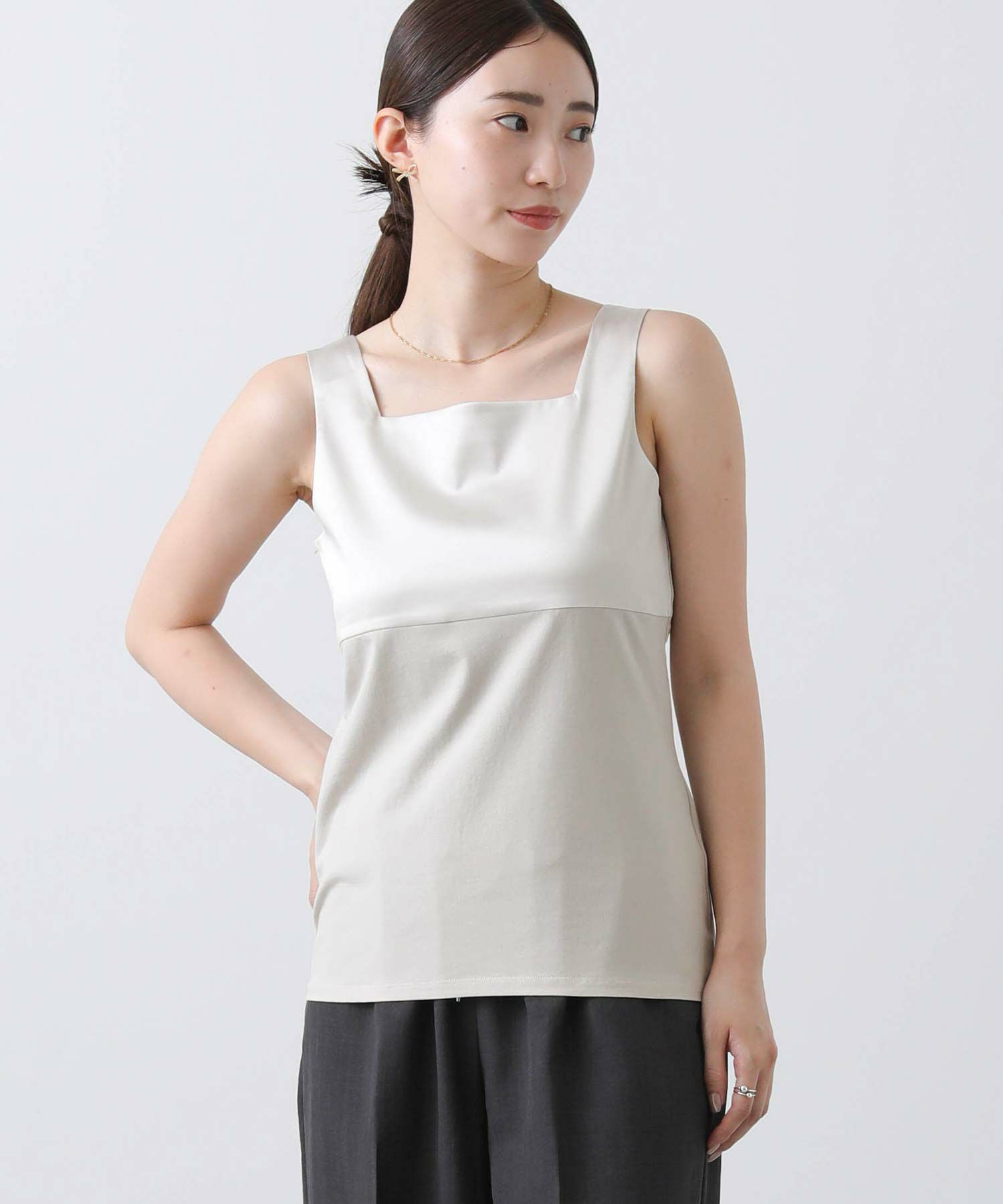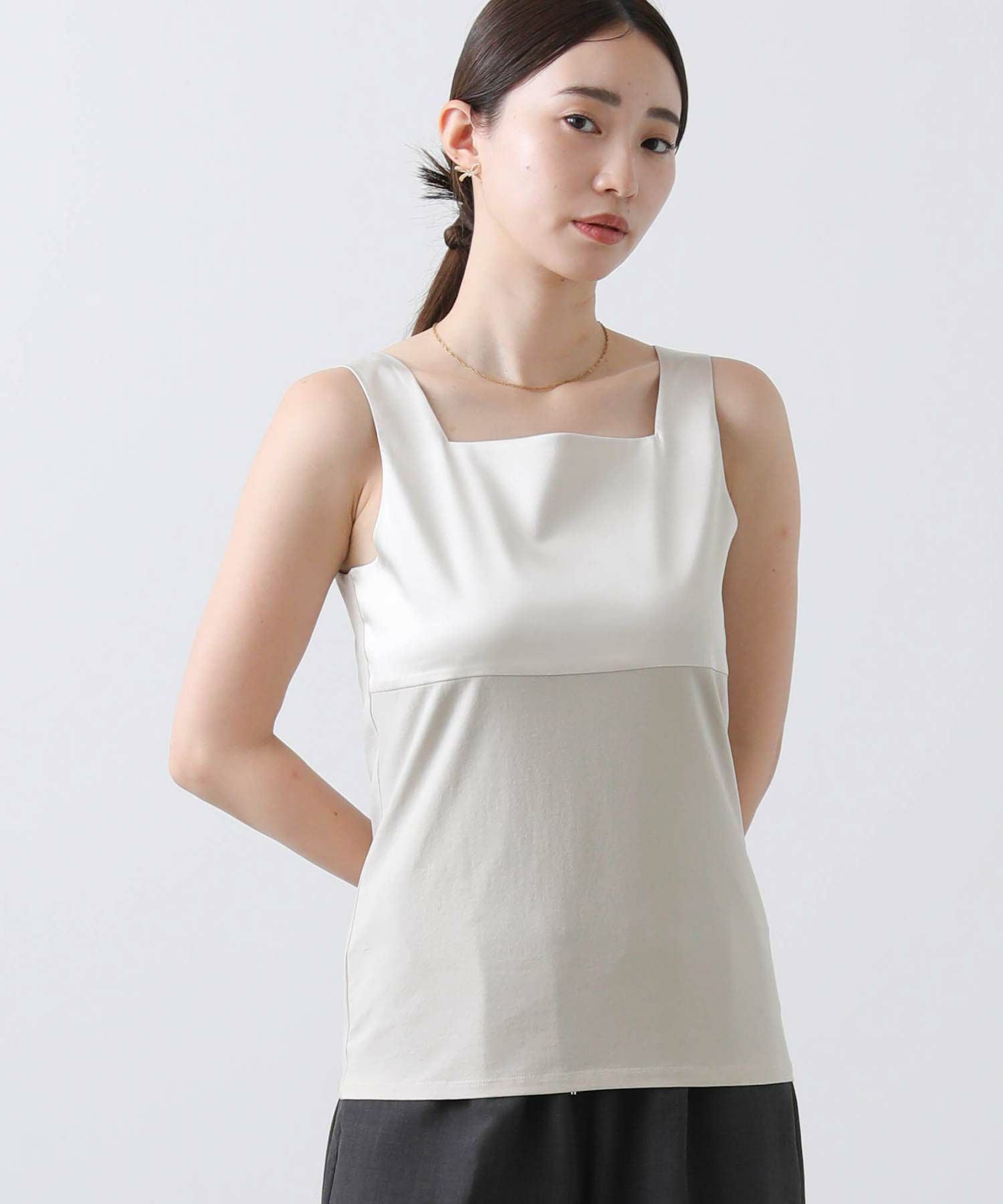 フライス2WAYタンクトップをベースにサテンキャミソールの微ストレッチのサテン素材を組み合わせ、イナンーにもトップスにも使えるデザインに仕上げました。