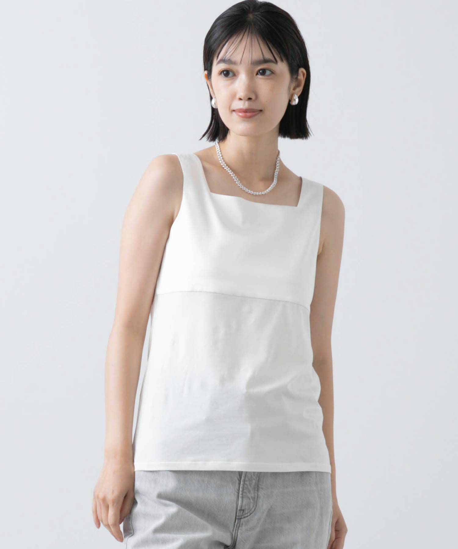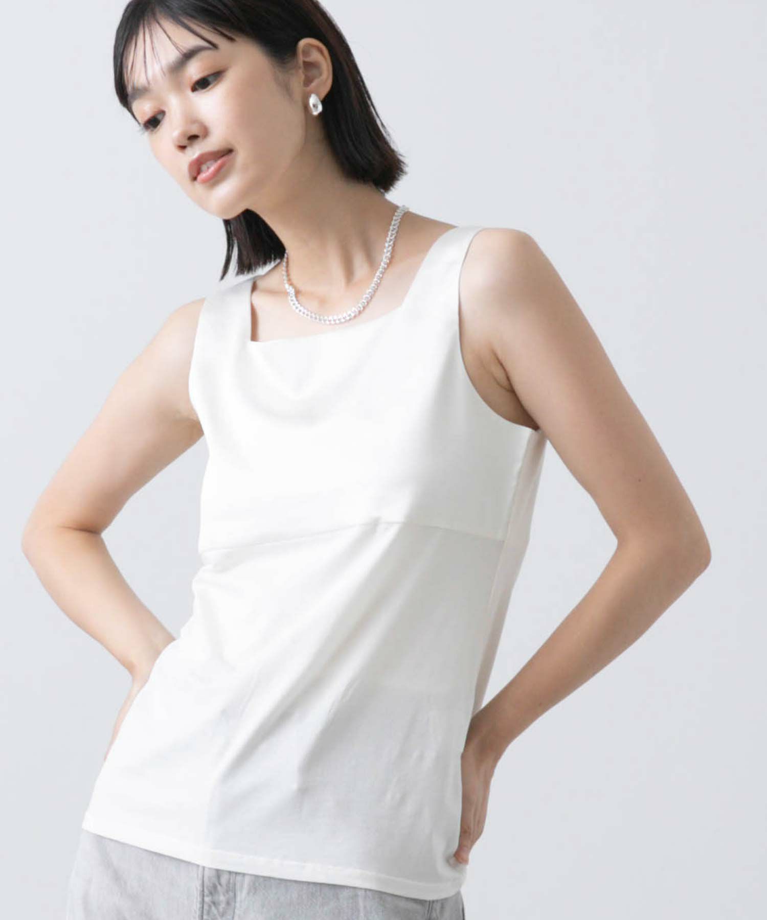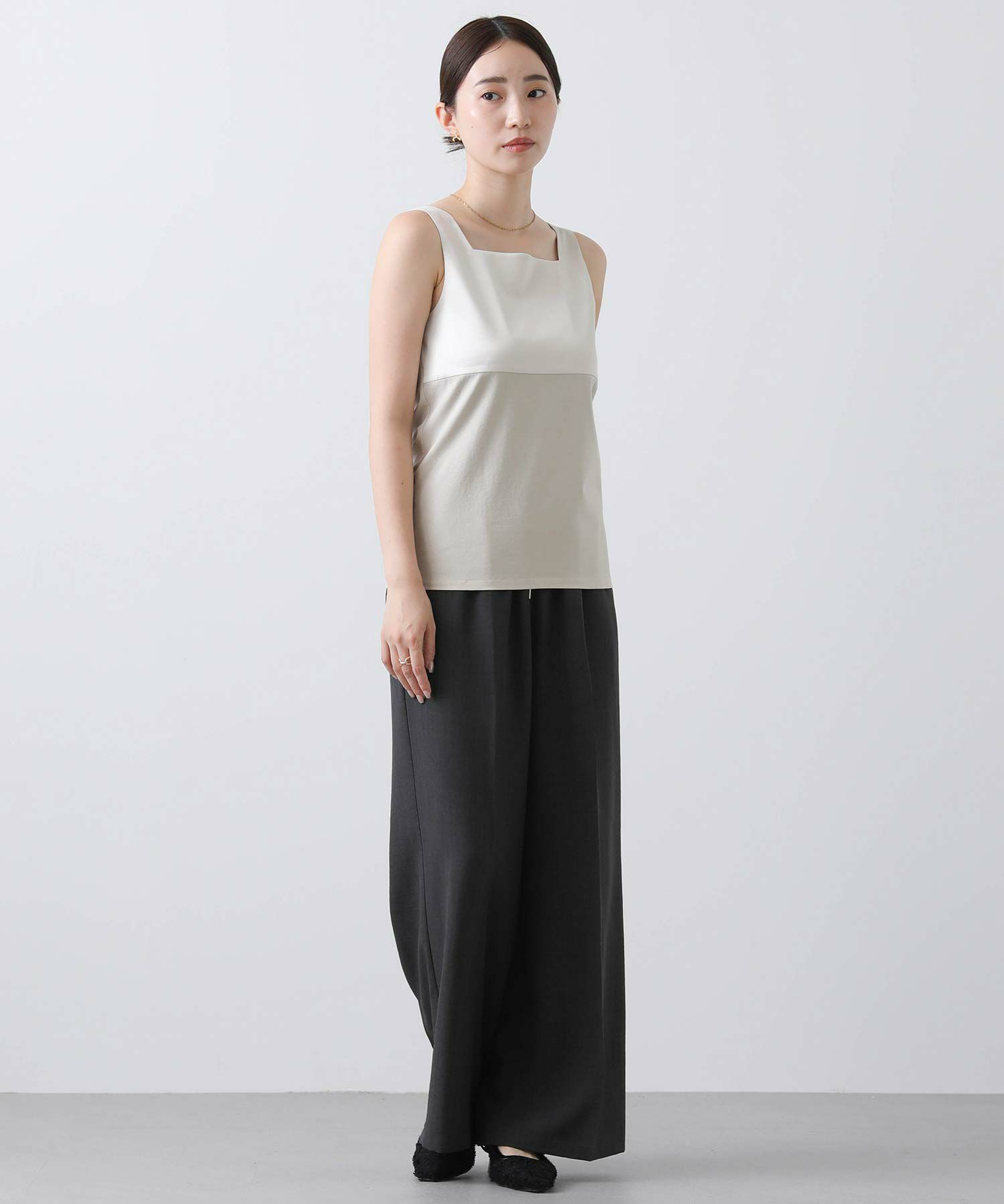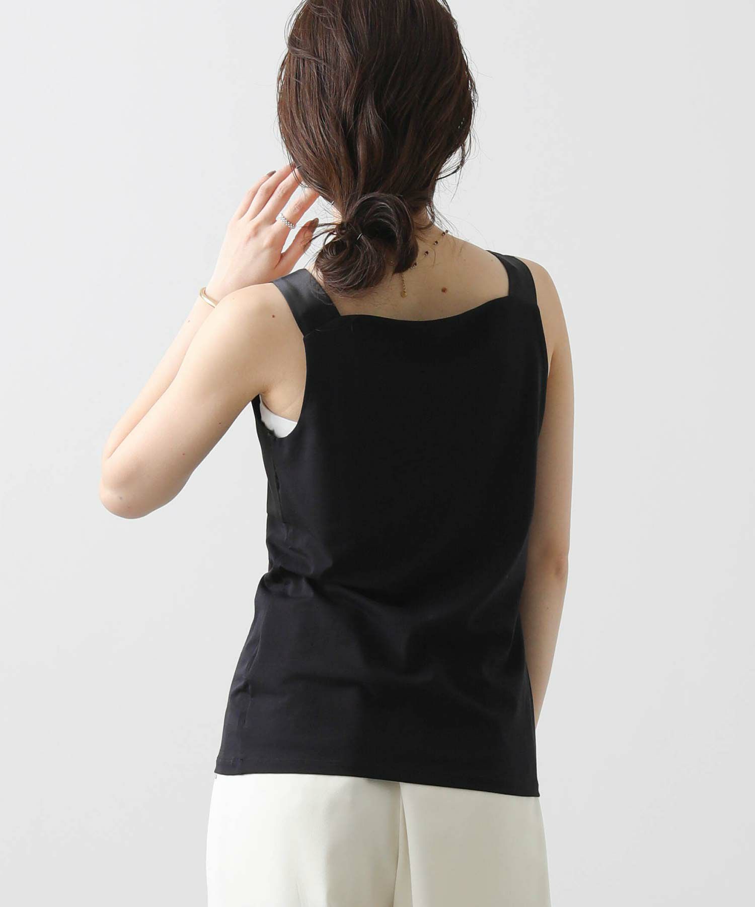 フライス2WAYタンクトップをベースにサテンキャミソールの微ストレッチのサテン素材を組み合わせ、イナンーにもトップスにも使えるデザインに仕上げました。