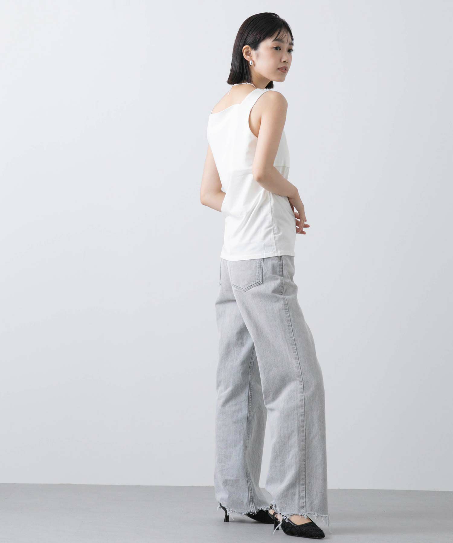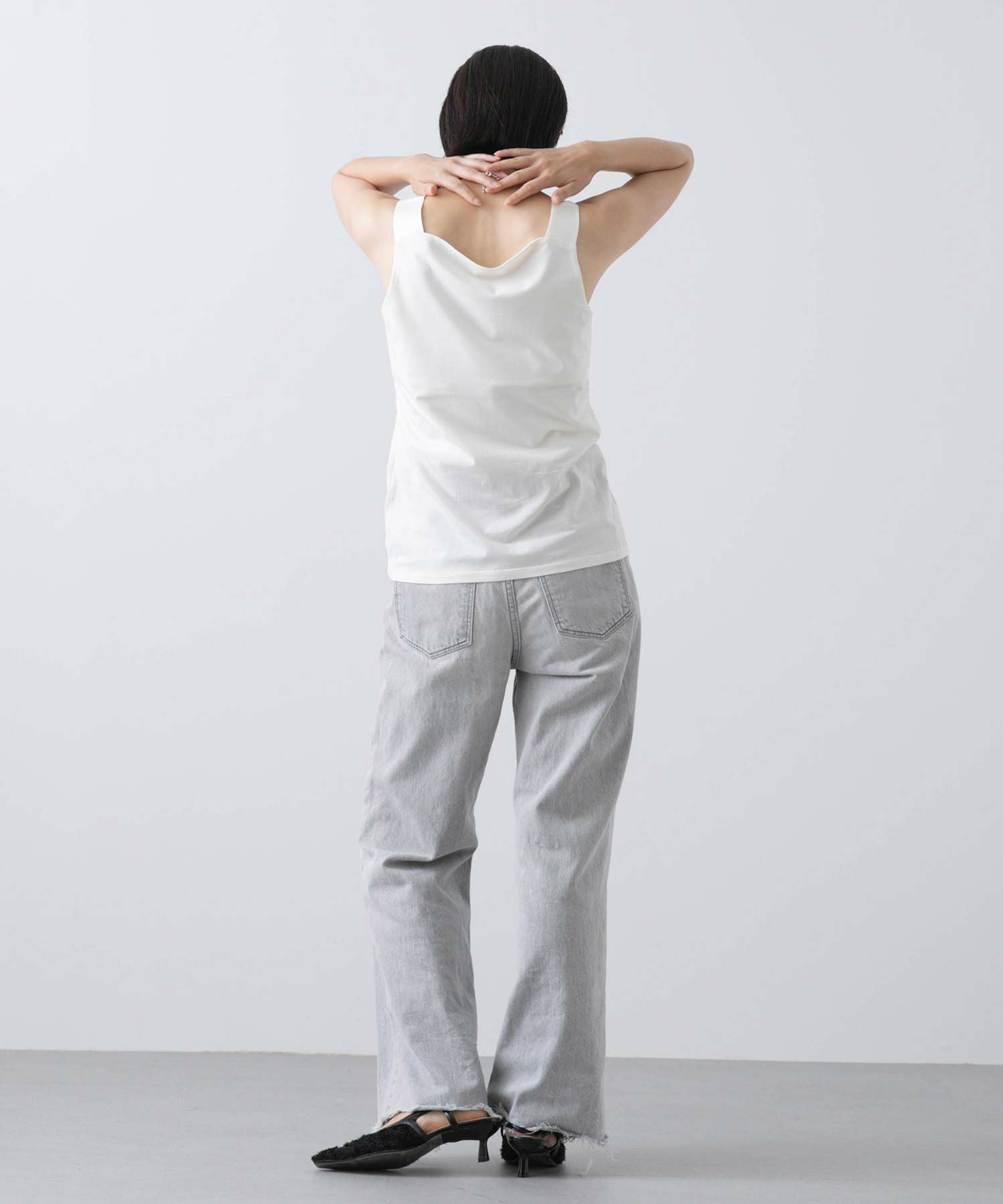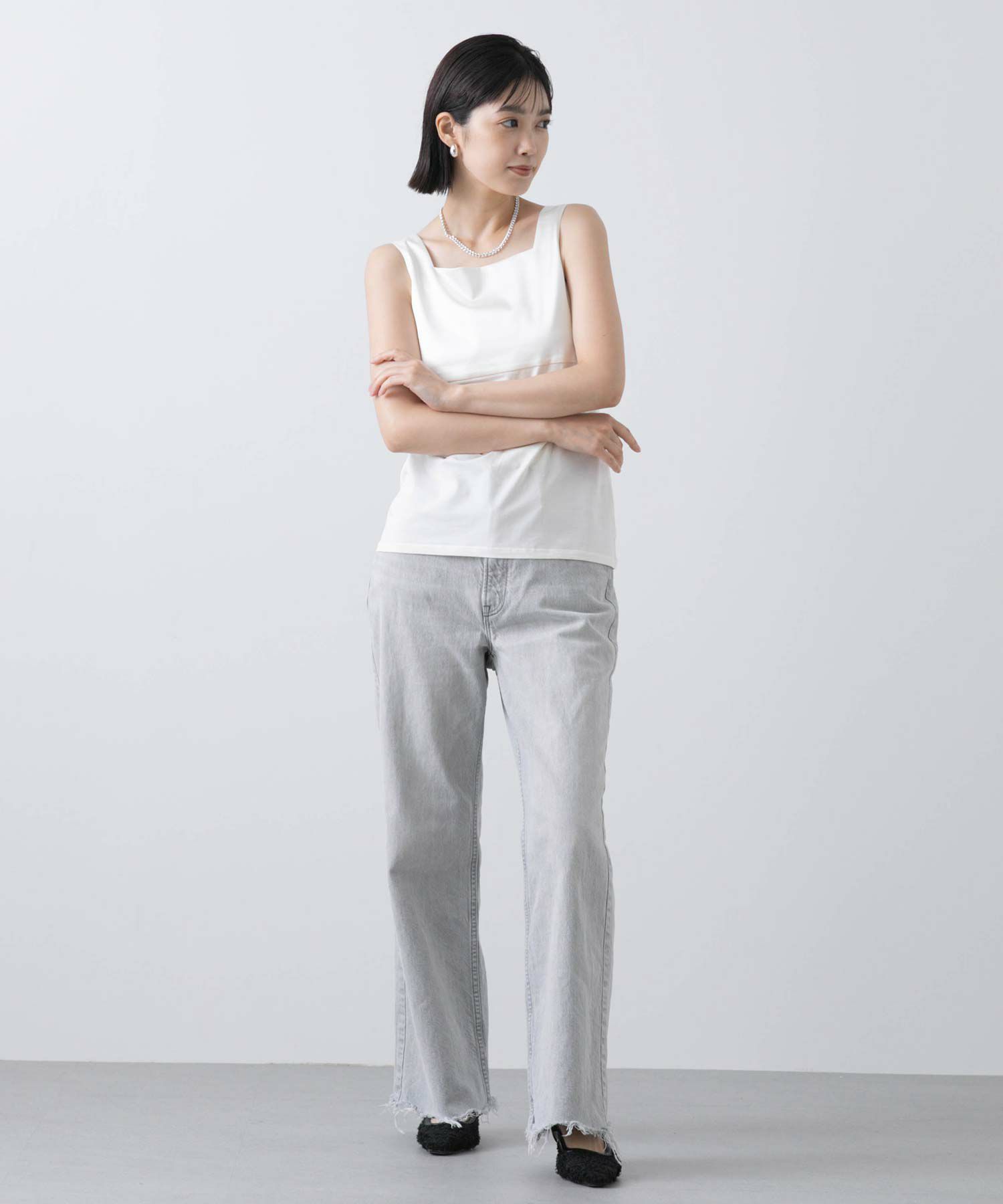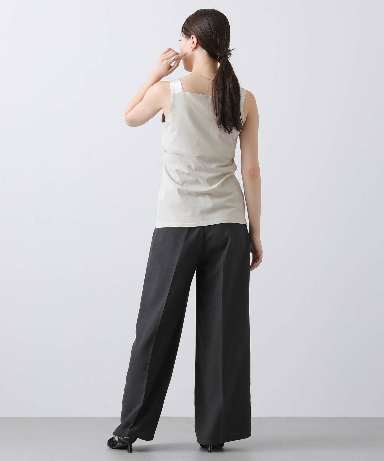 フライス2WAYタンクトップをベースにサテンキャミソールの微ストレッチのサテン素材を組み合わせ、イナンーにもトップスにも使えるデザインに仕上げました。