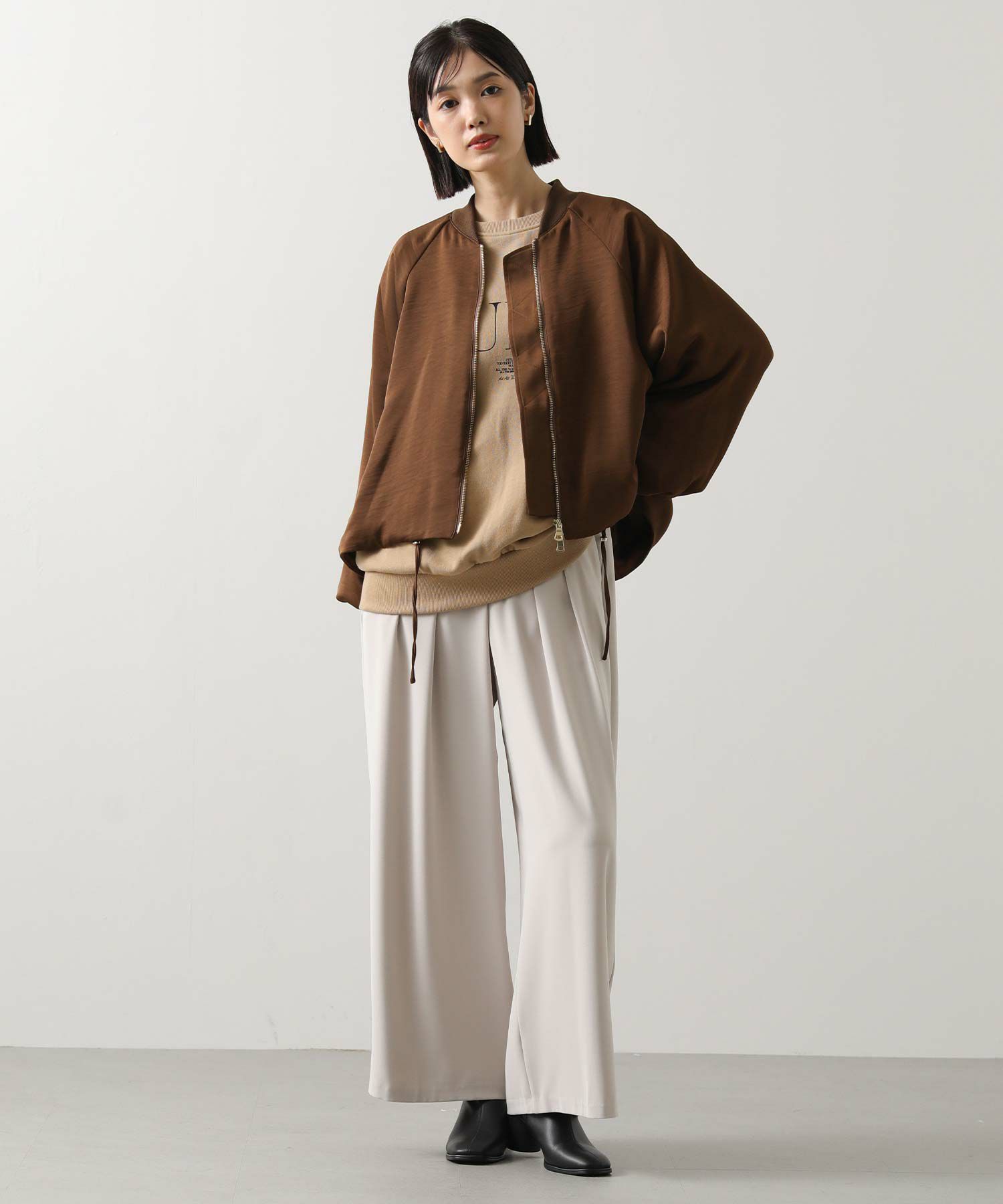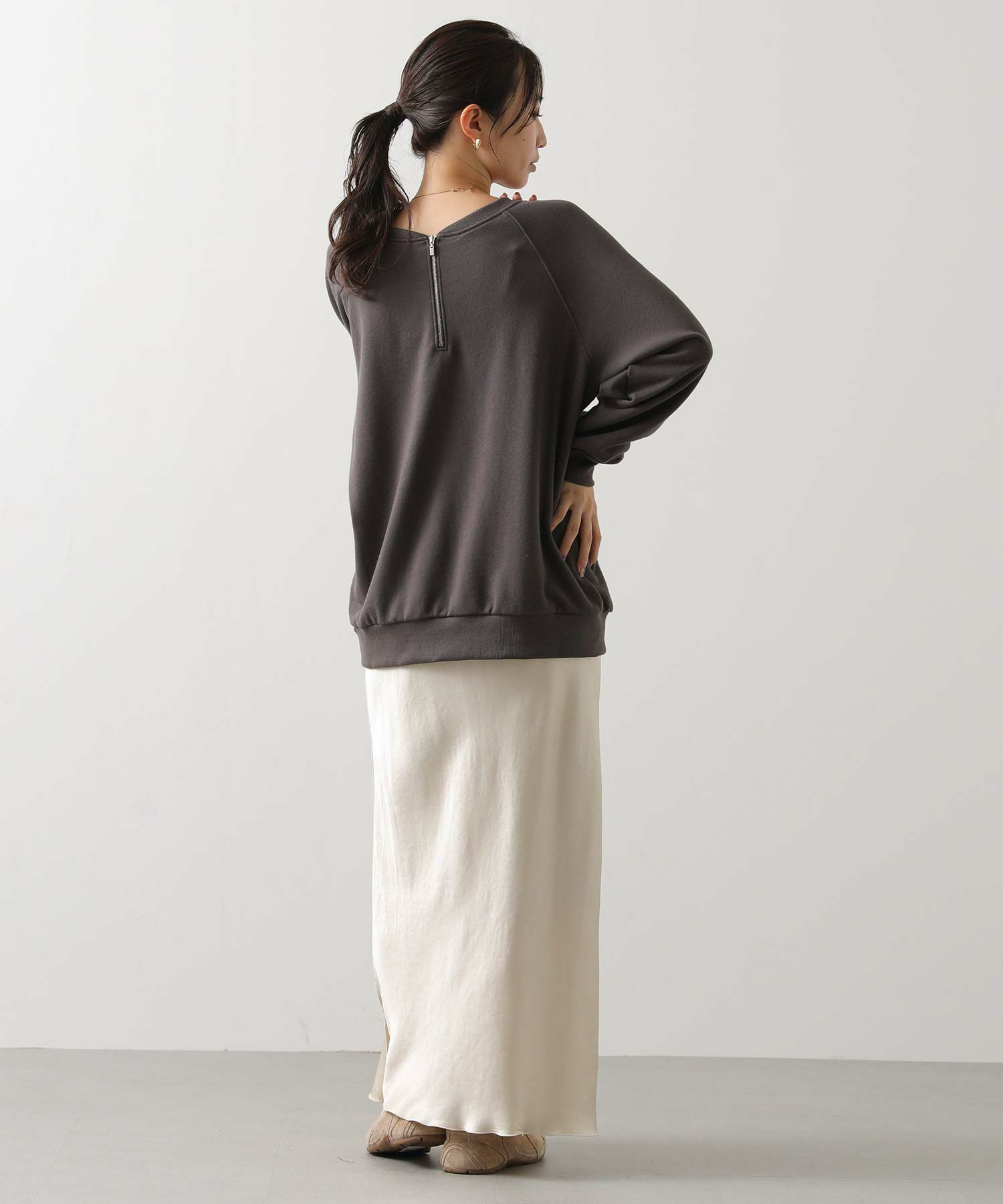 ZIPを少し開け、首を抜かせてデコルテを覗かせる着こなしも女性らしくてオススメ。