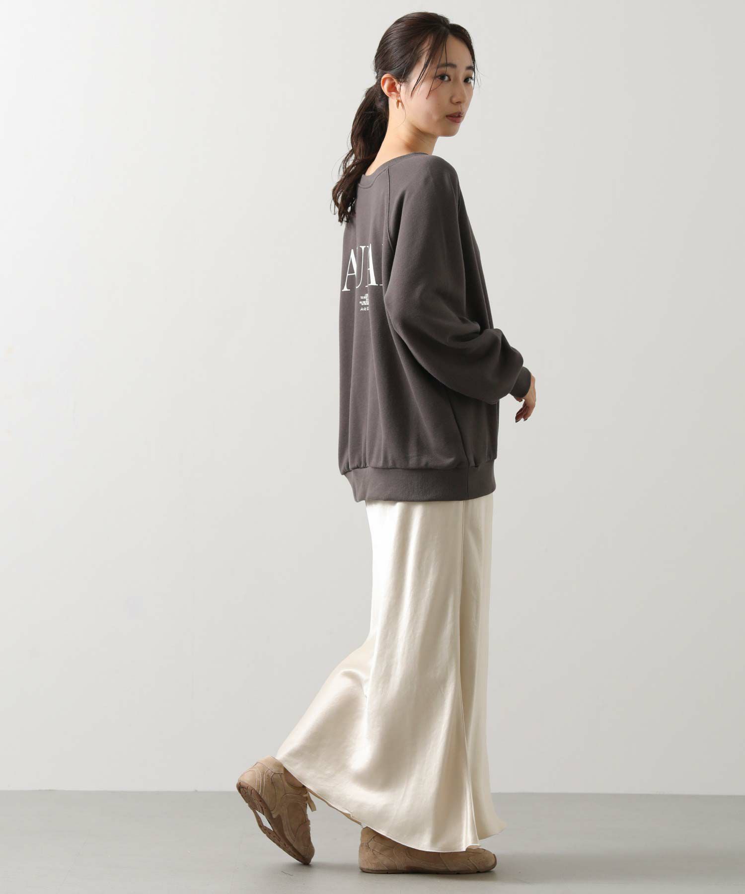 柔らかな裏毛素材を使用。上品で大人っぽいフォントのロゴなので、カジュアルになりすぎず女性らしく決まります。