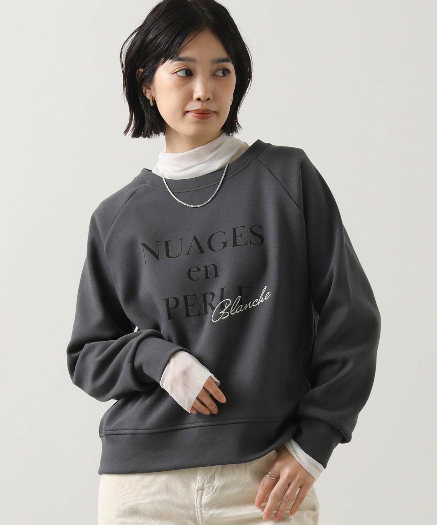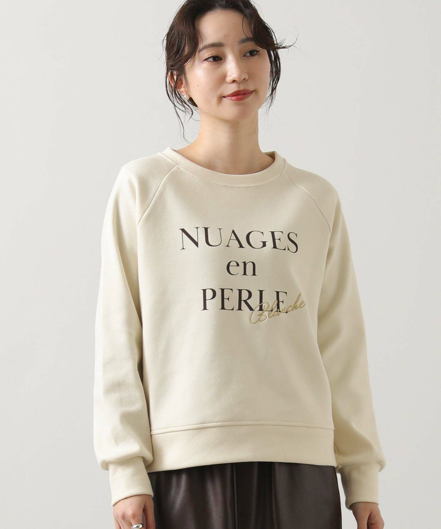 フロントには「NuagesenPerle(Perle(=真珠のような雲」ロゴとフランス語で“白”を意味するフランス語「Blanche」銀糸で刺繍。