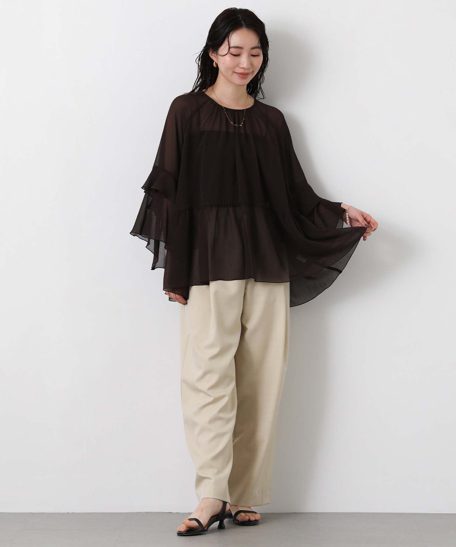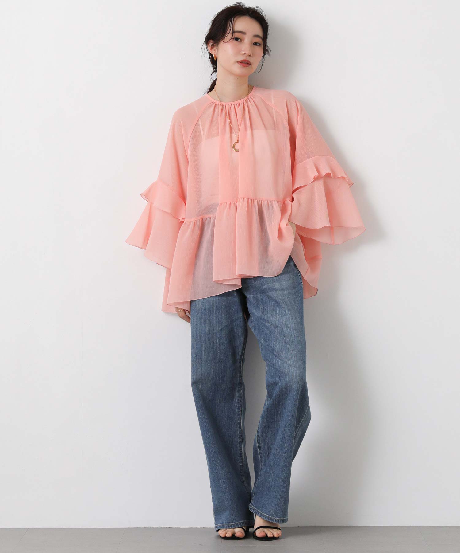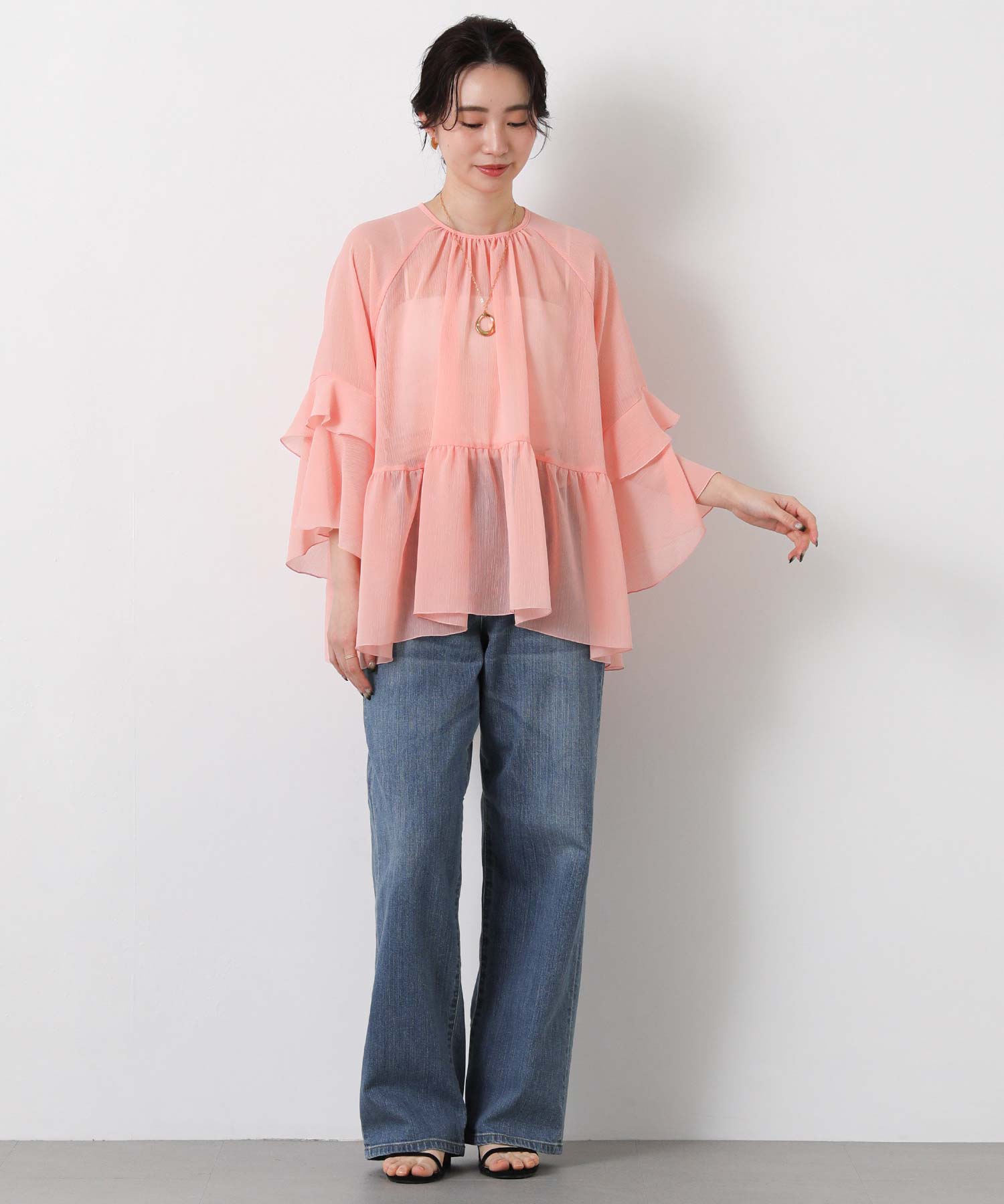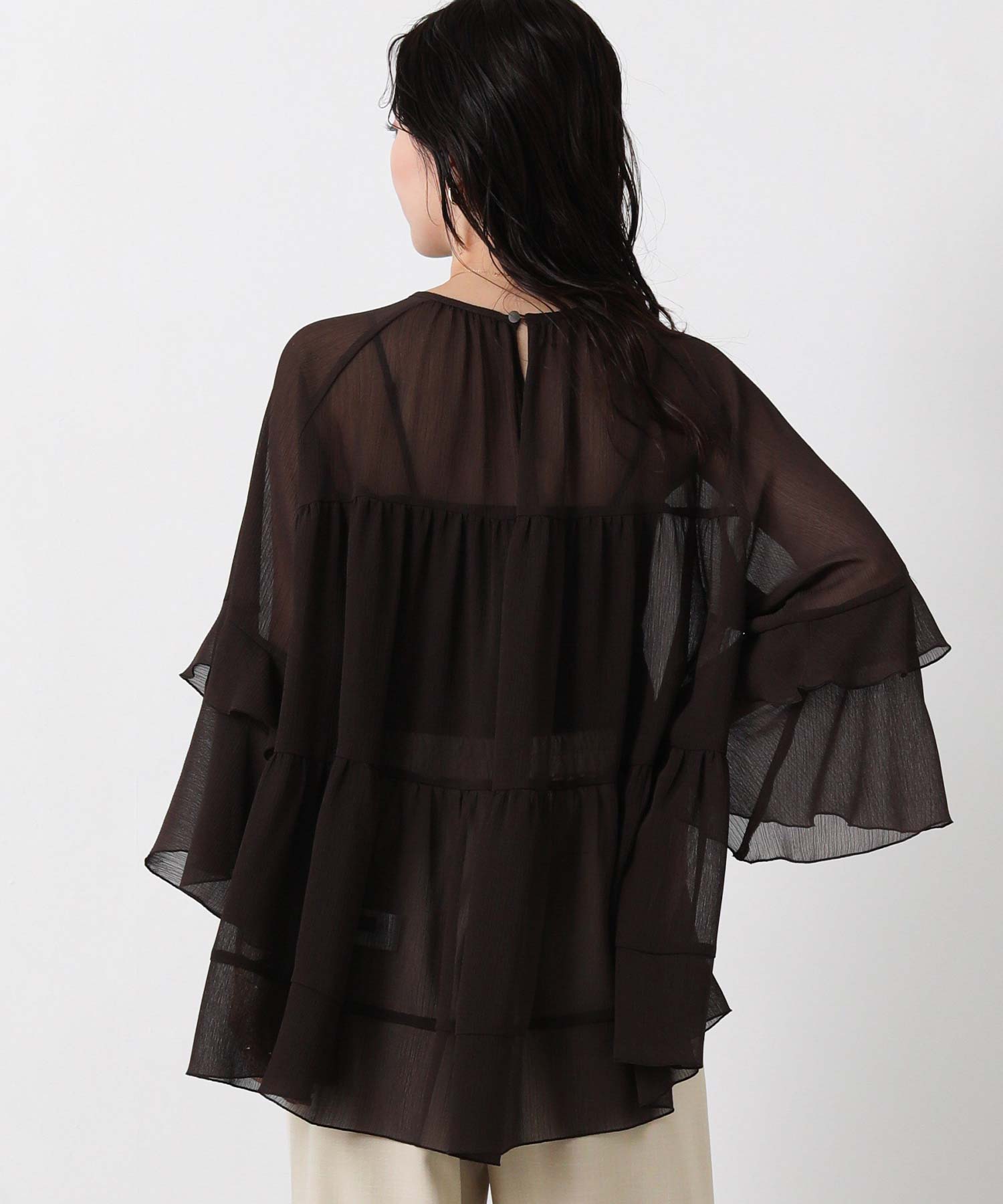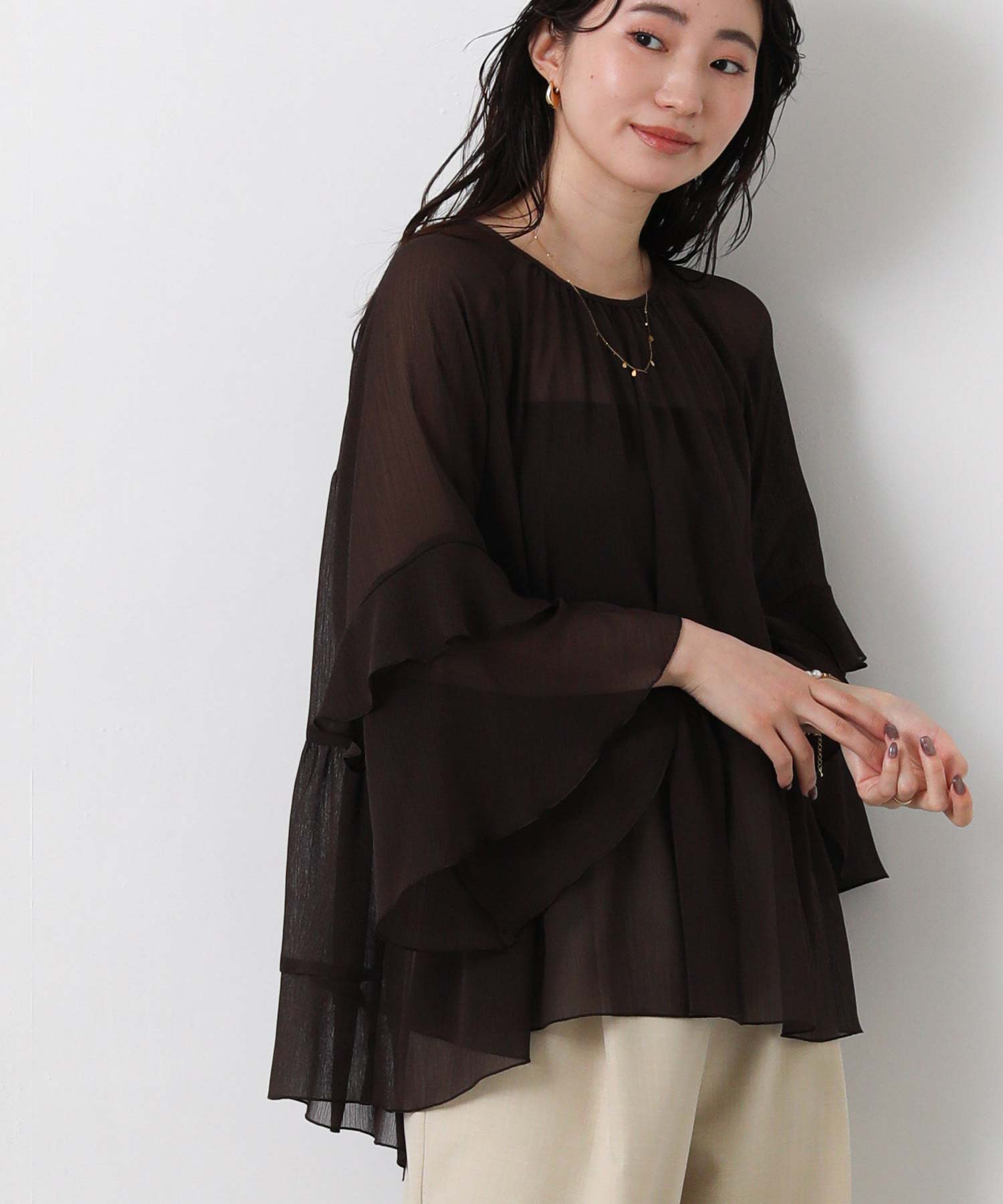 首元はすっきりとしたクルーネック、袖は二段フレアの7分袖で動くたびにやわらかな表情を生み出します。