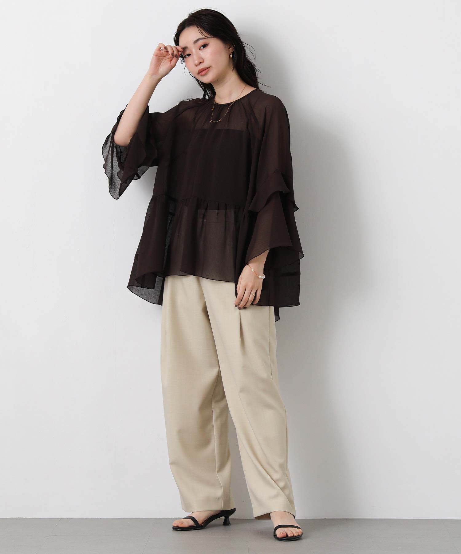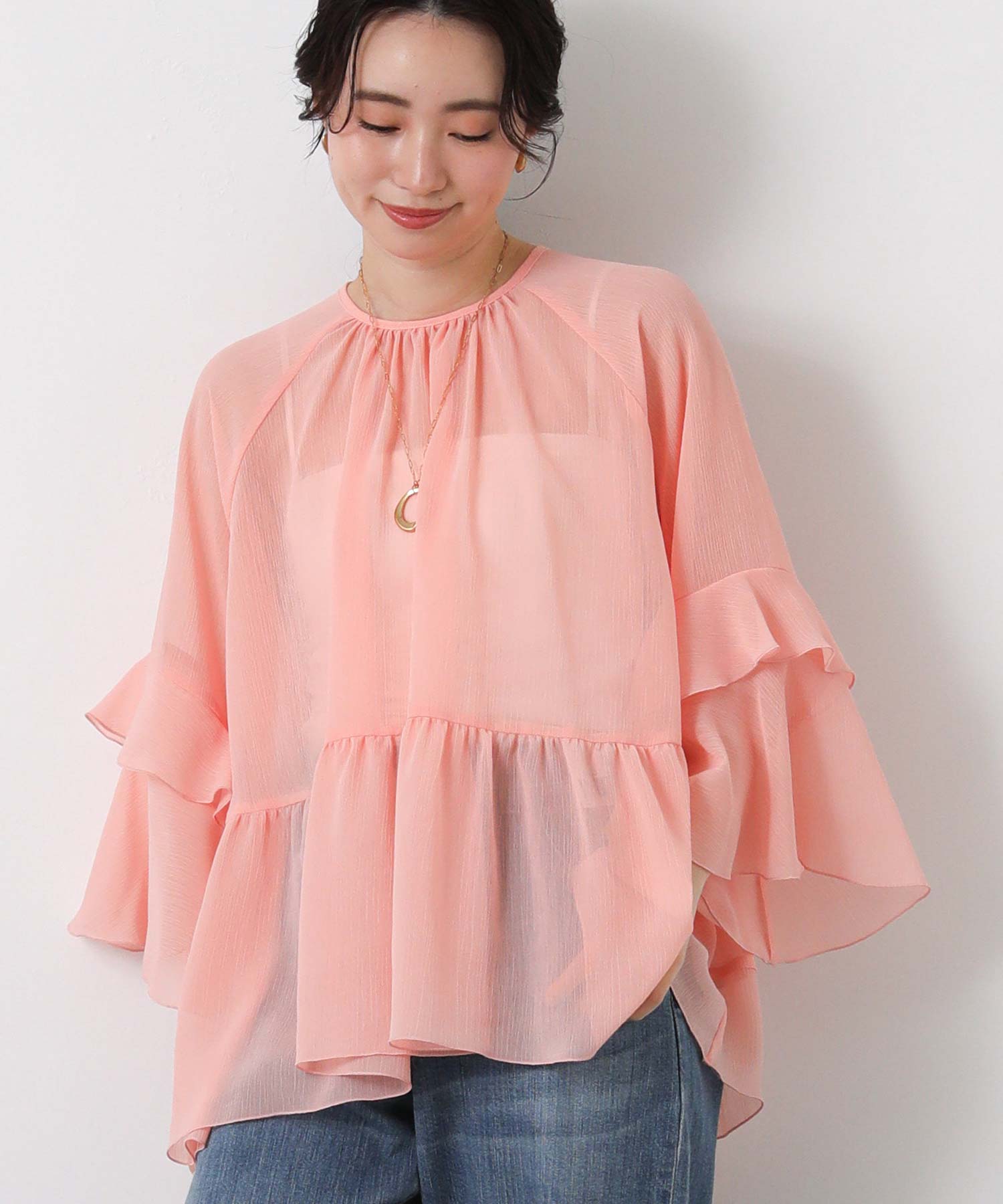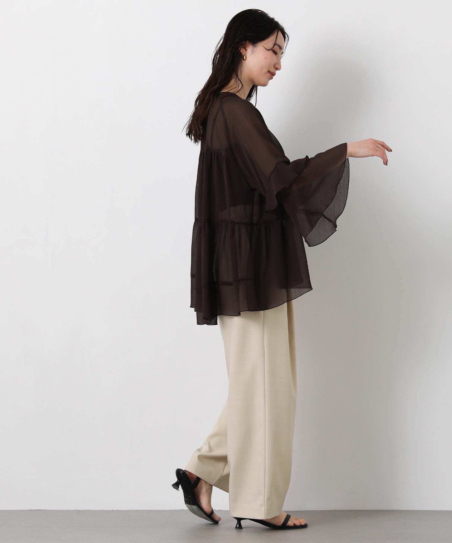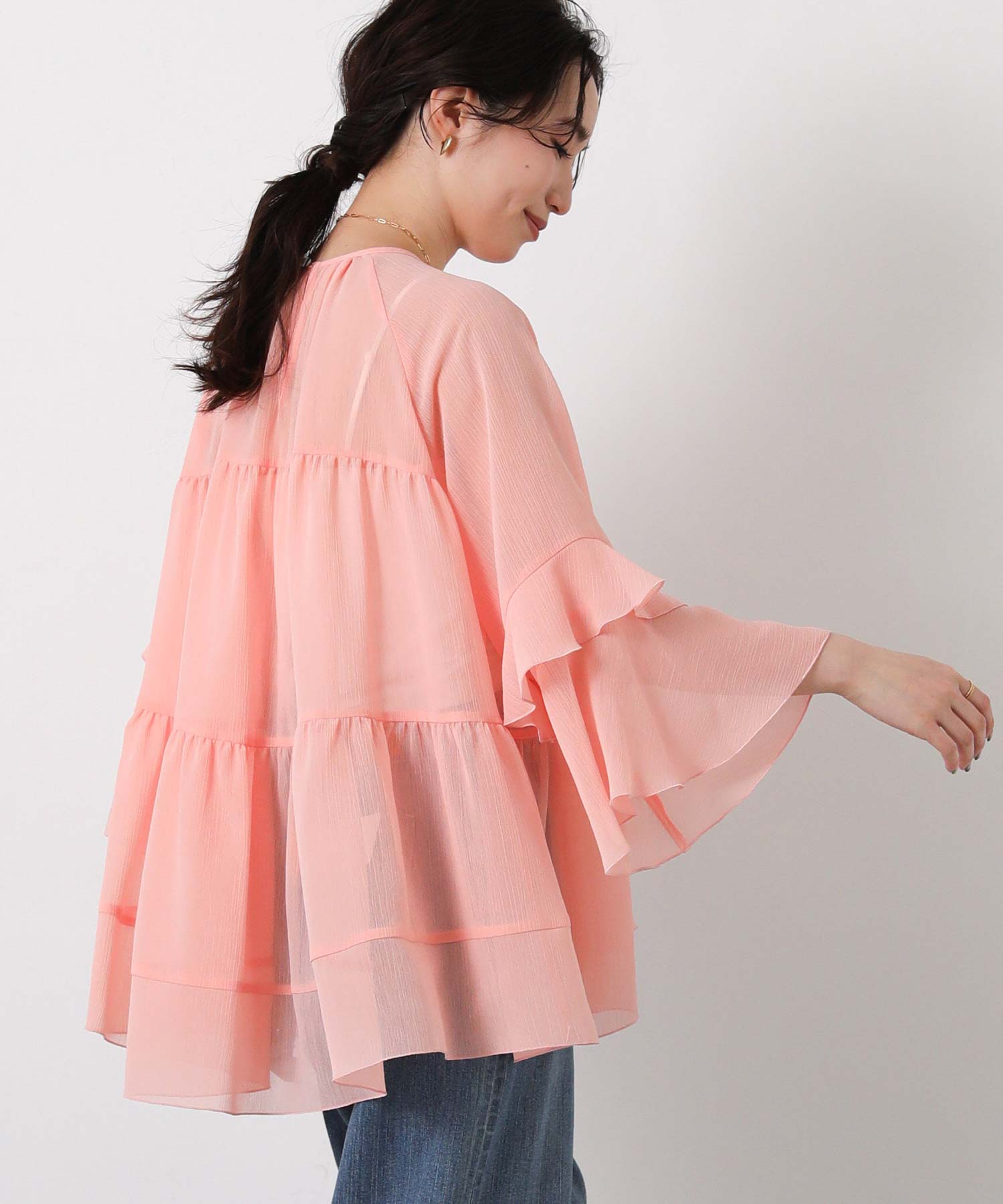 首元はすっきりとしたクルーネック、袖は二段フレアの7分袖で動くたびにやわらかな表情を生み出します。