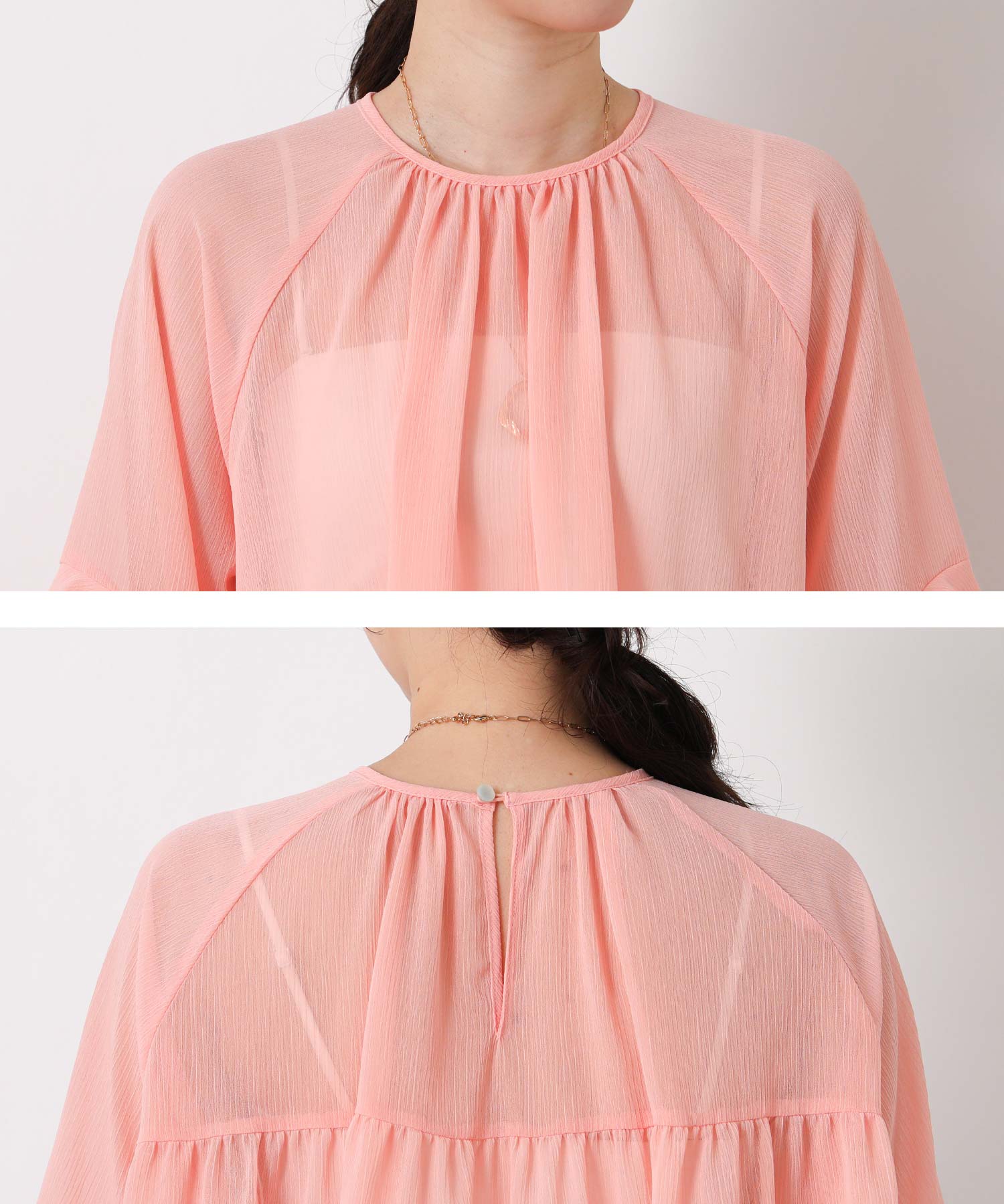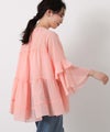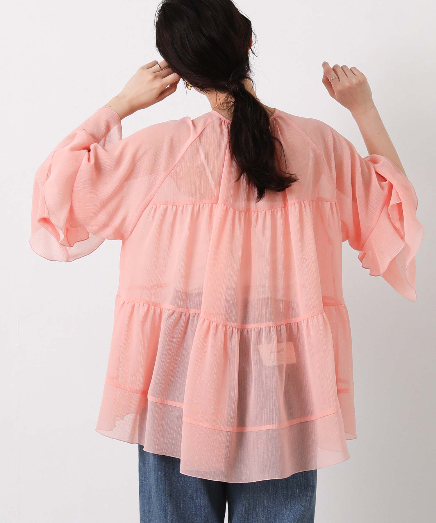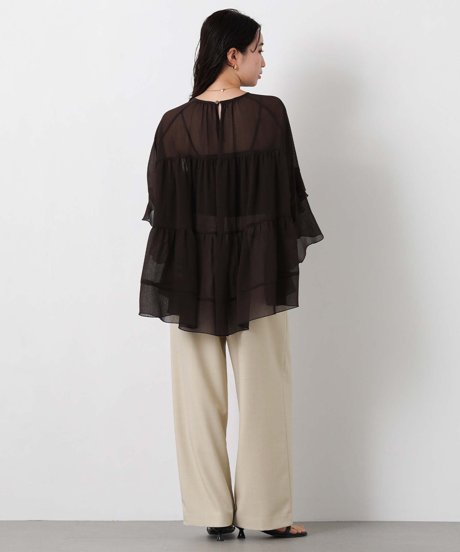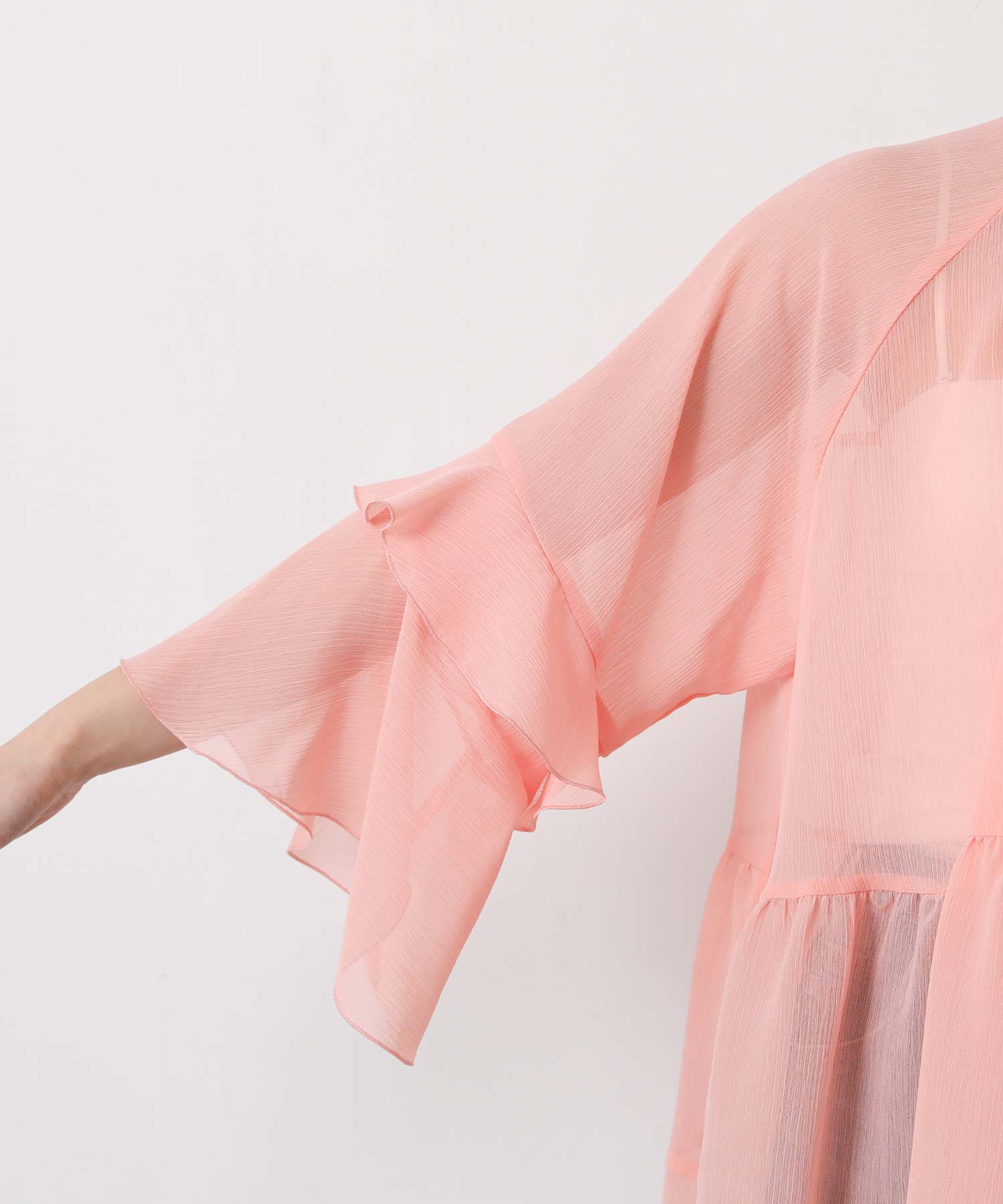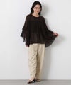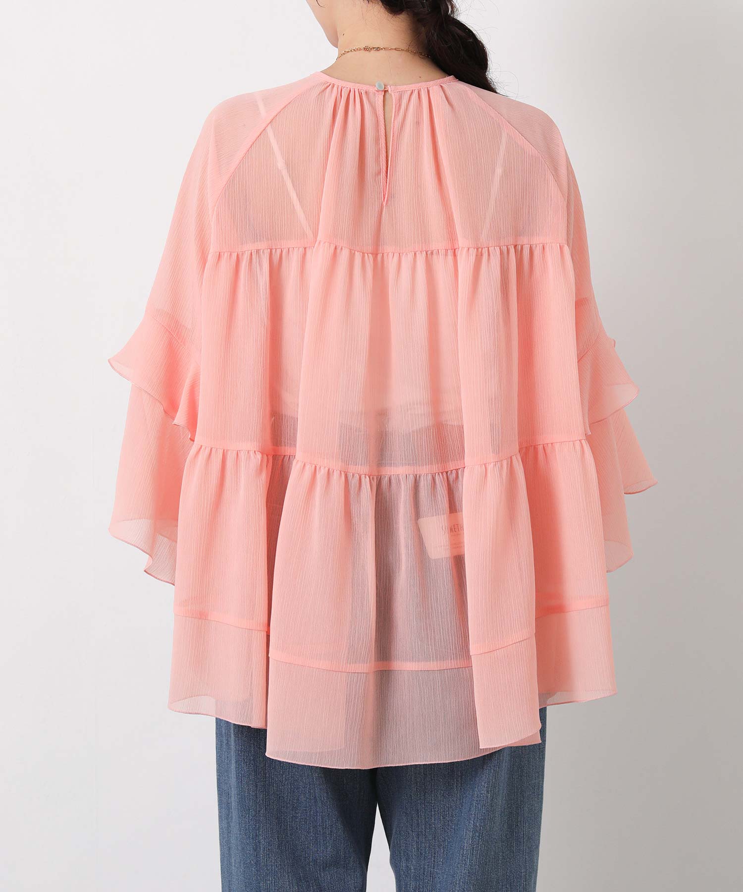 首元はすっきりとしたクルーネック、袖は二段フレアの7分袖で動くたびにやわらかな表情を生み出します。