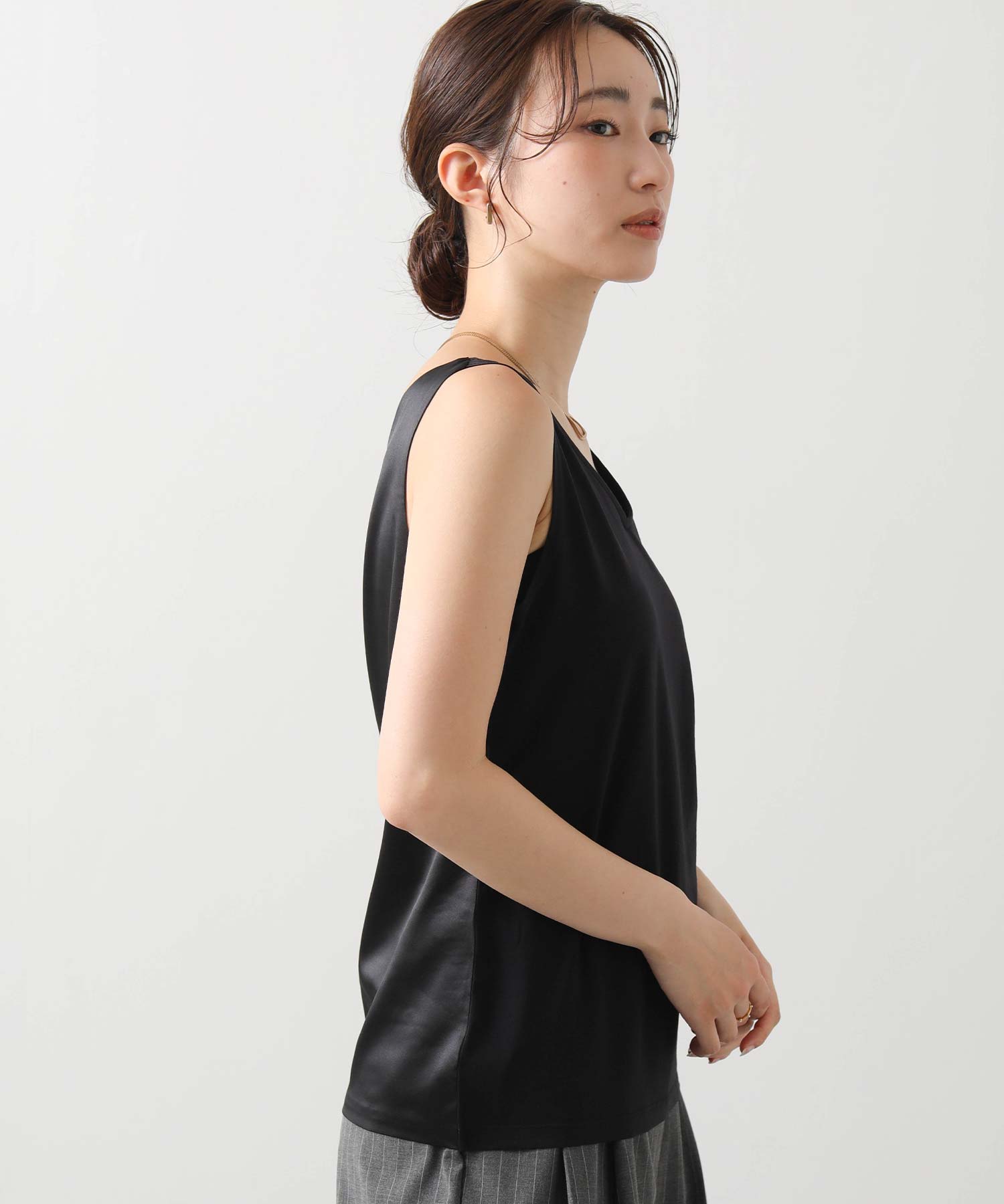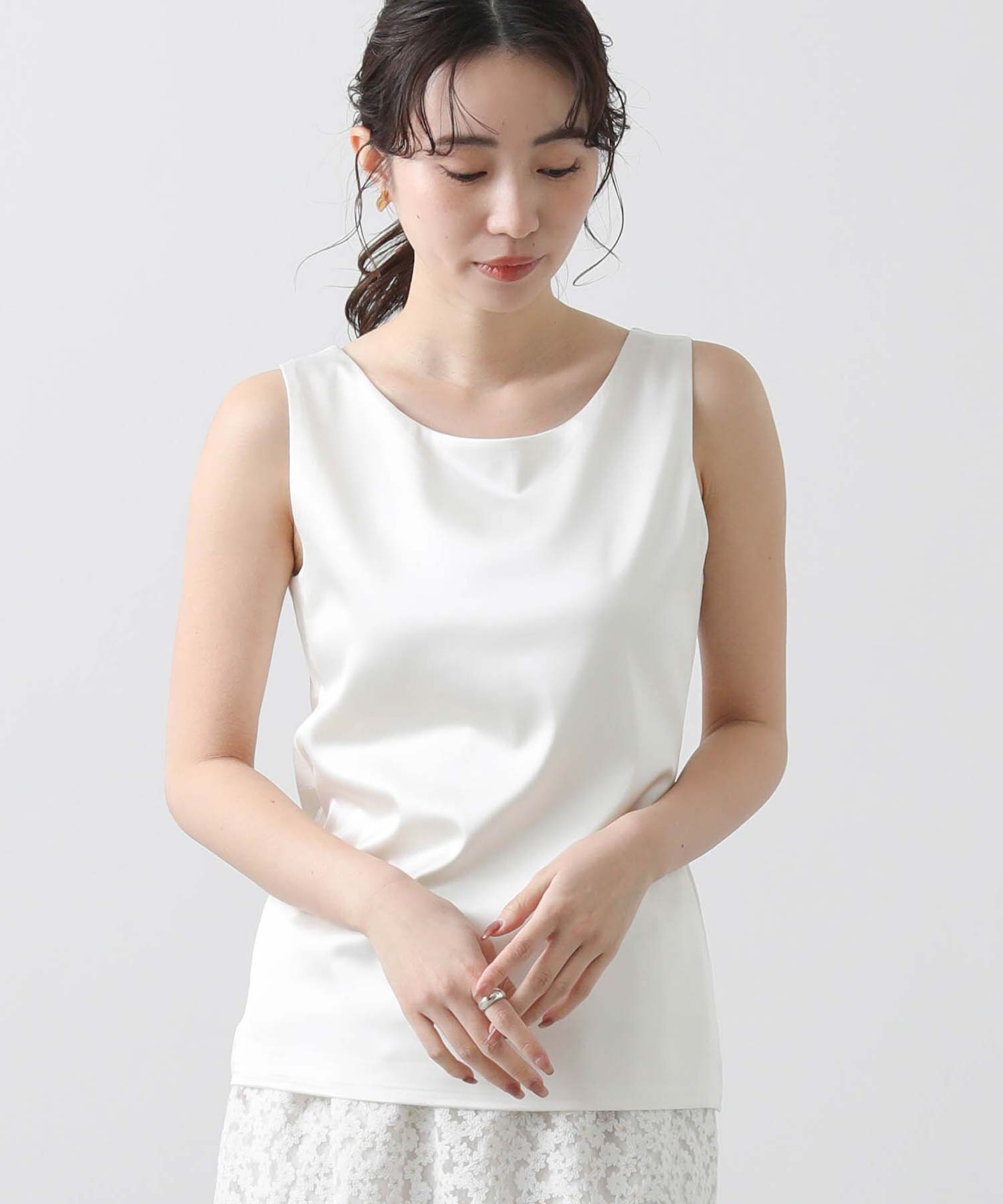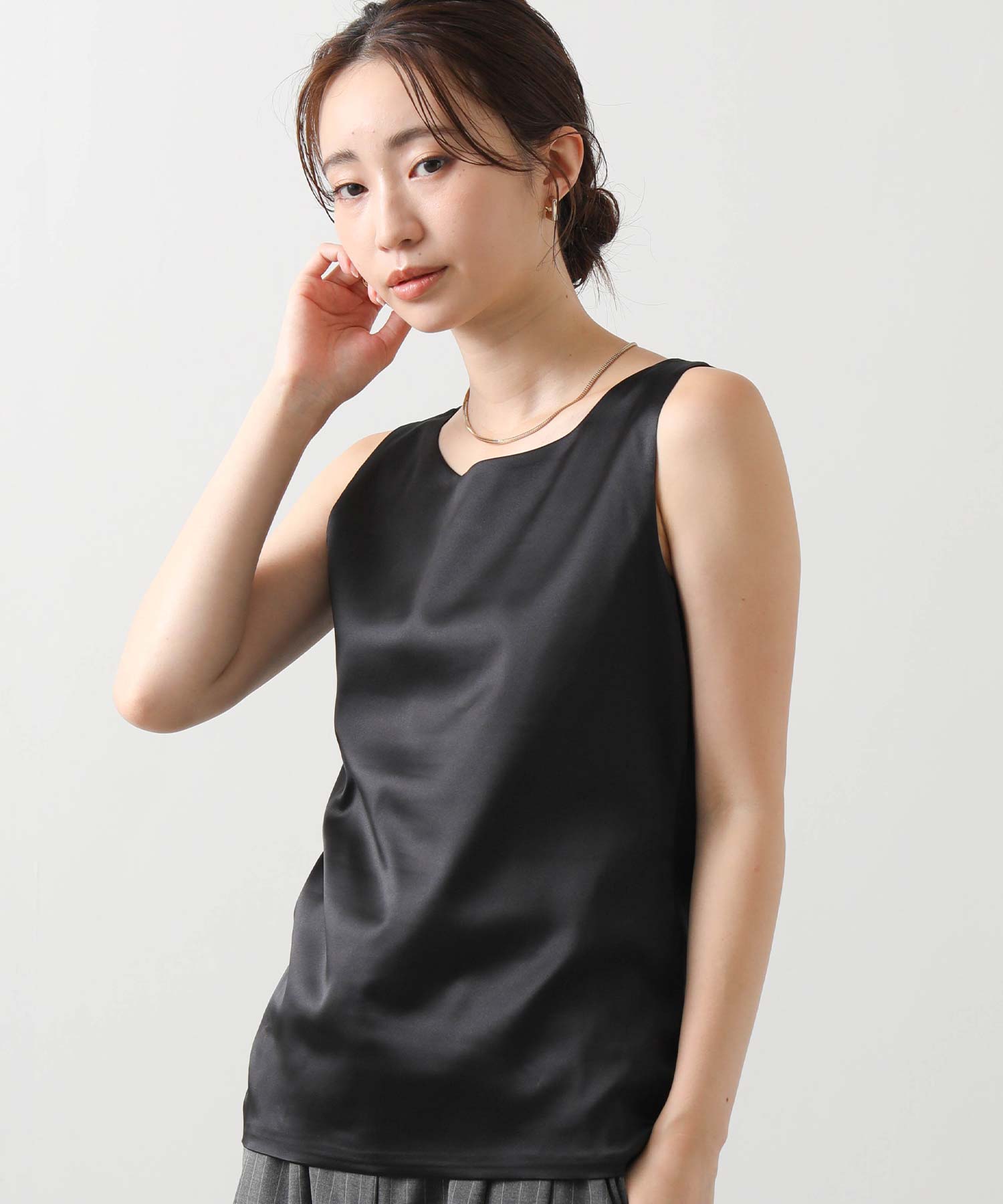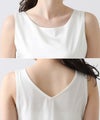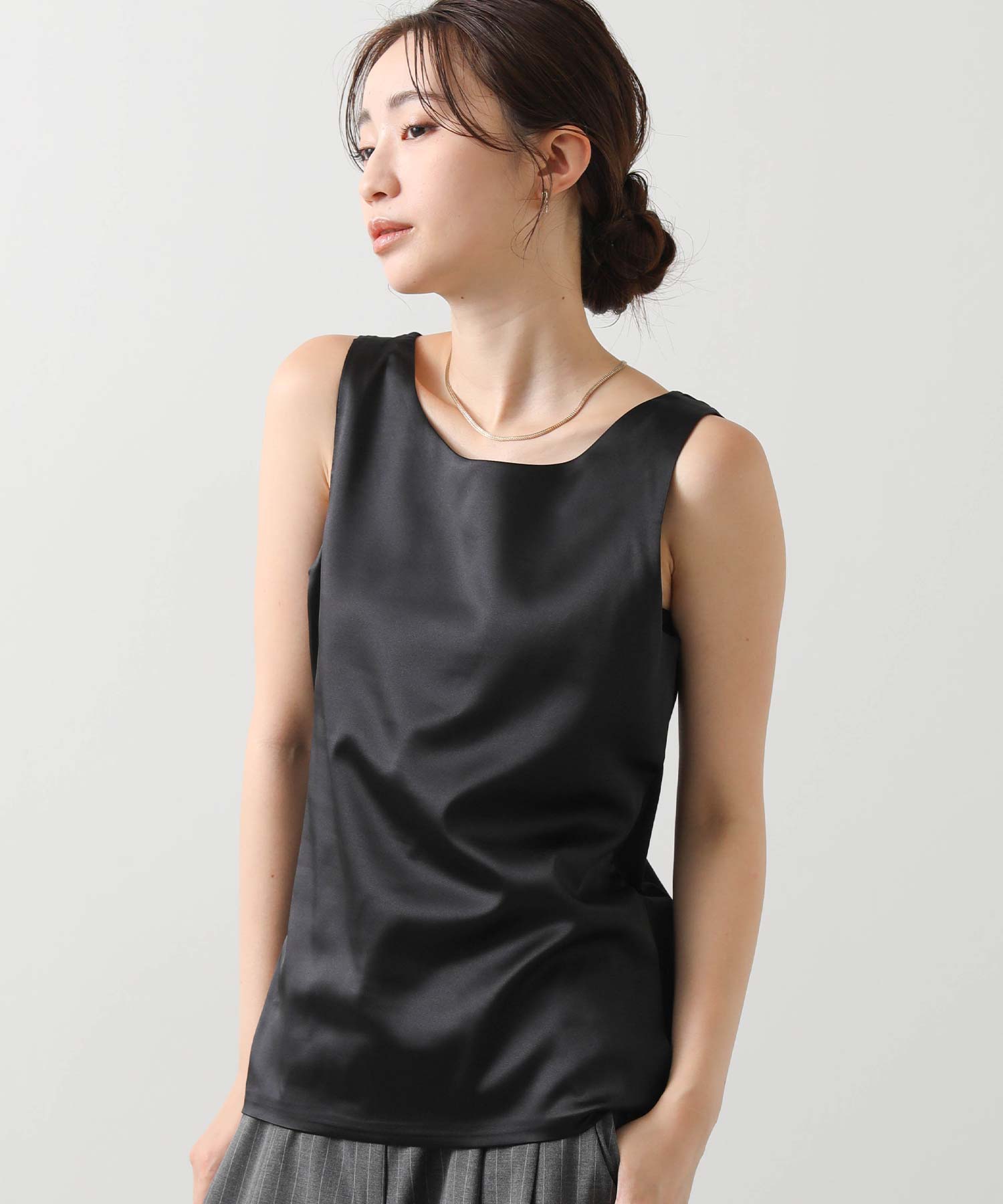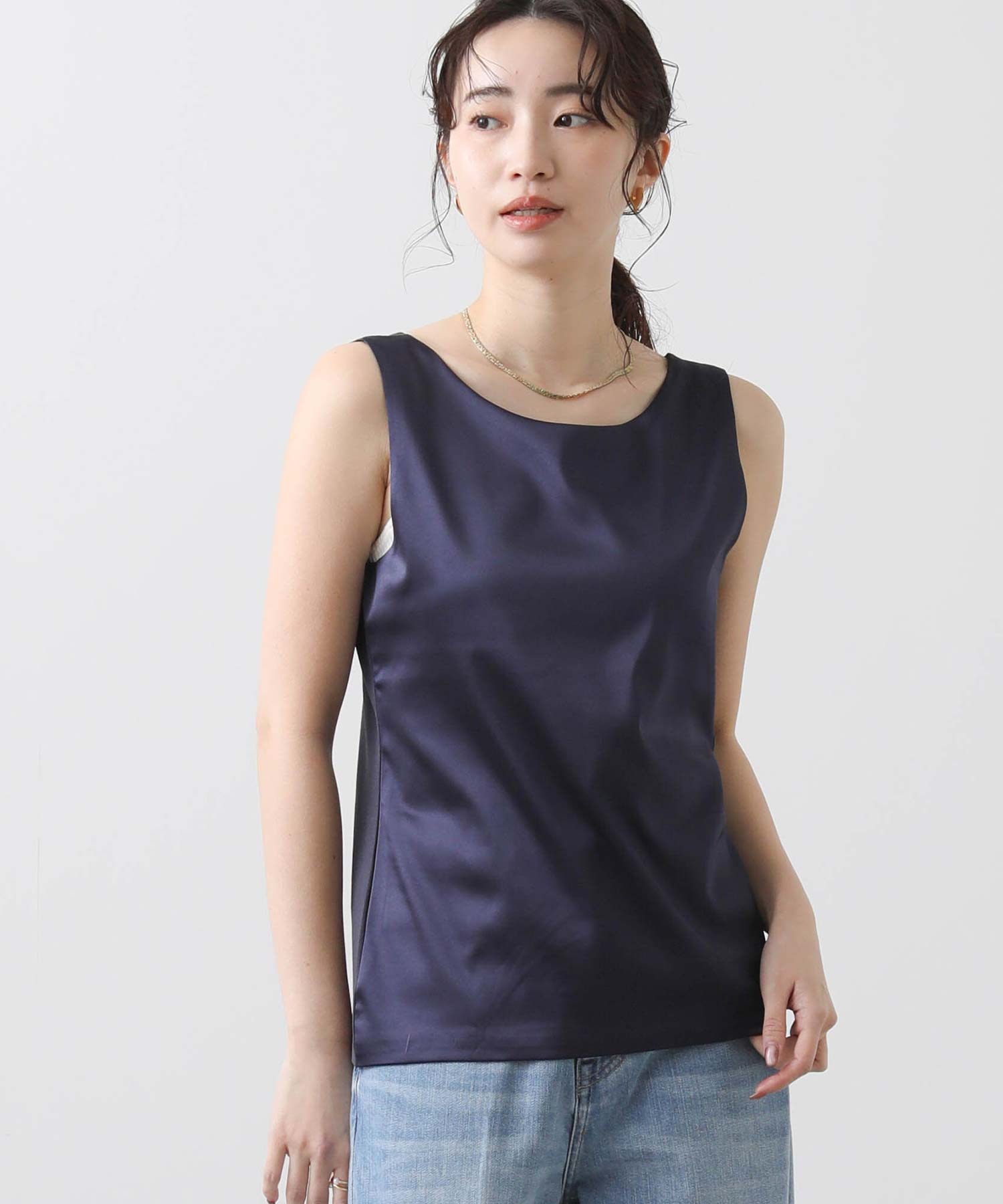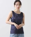 洗練された光沢感と機能性を兼ね備えた大人の女性のためのタンクトップ。 程よい艶感のあるストレッチサテン素材を使用し、女性らしい印象を演出しながらも動きやすさをしっかり確保。
