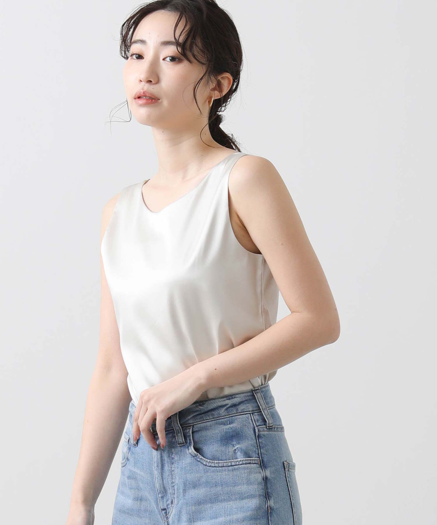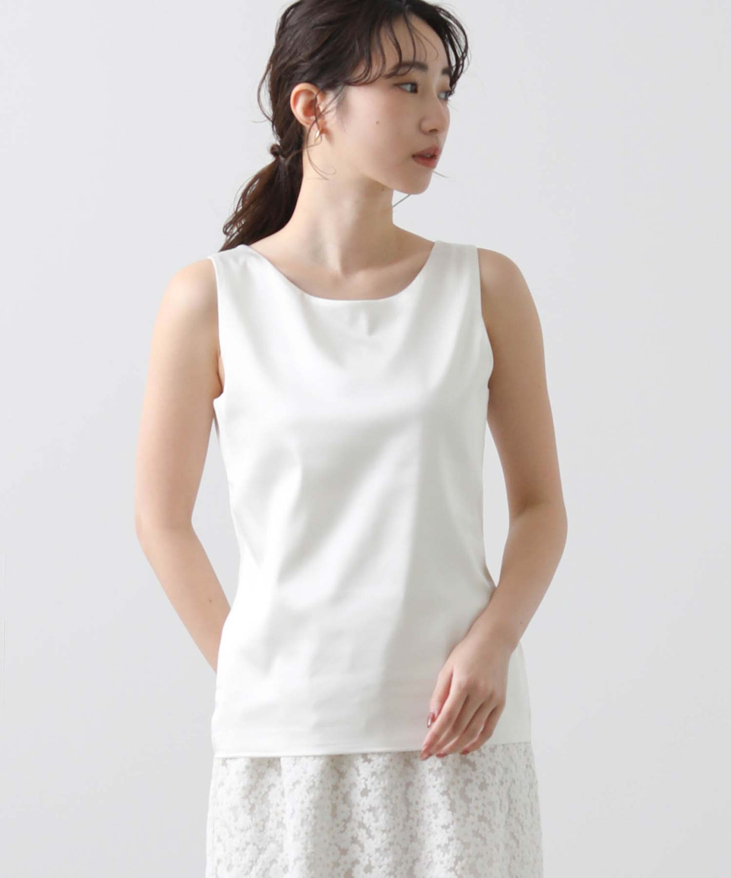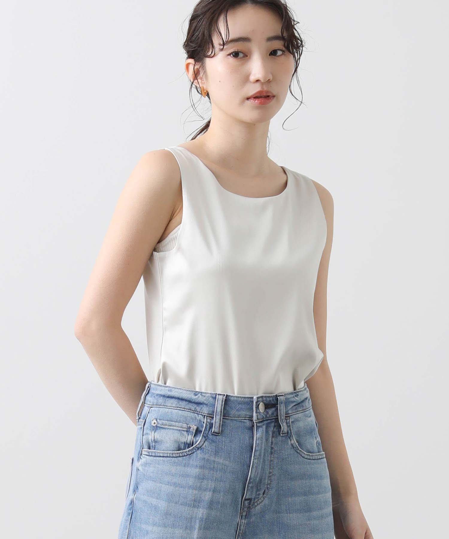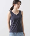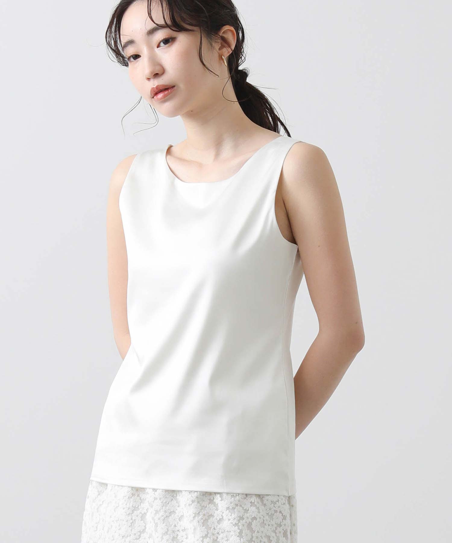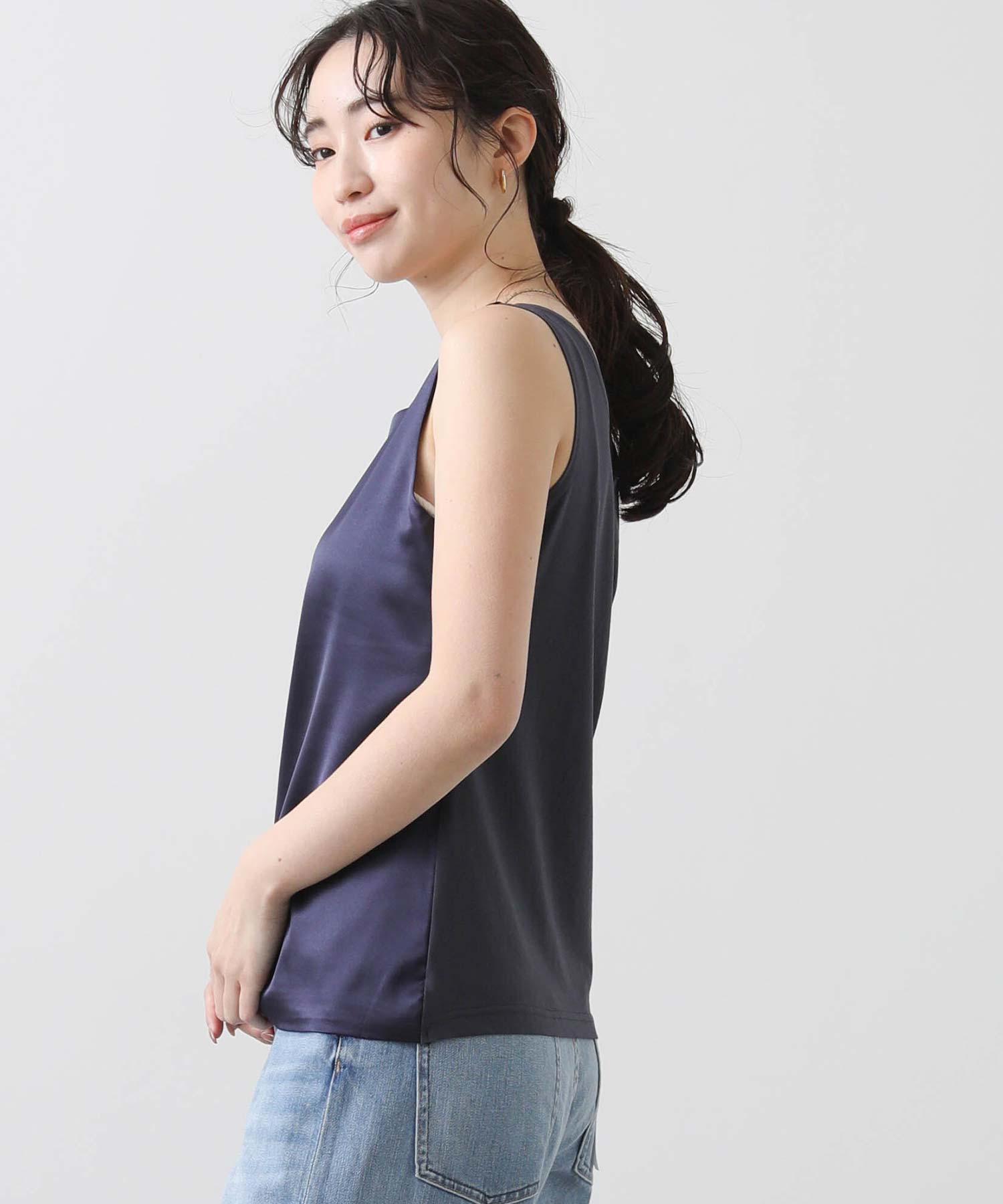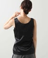 洗練された光沢感と機能性を兼ね備えた大人の女性のためのタンクトップ。 程よい艶感のあるストレッチサテン素材を使用し、女性らしい印象を演出しながらも動きやすさをしっかり確保。
