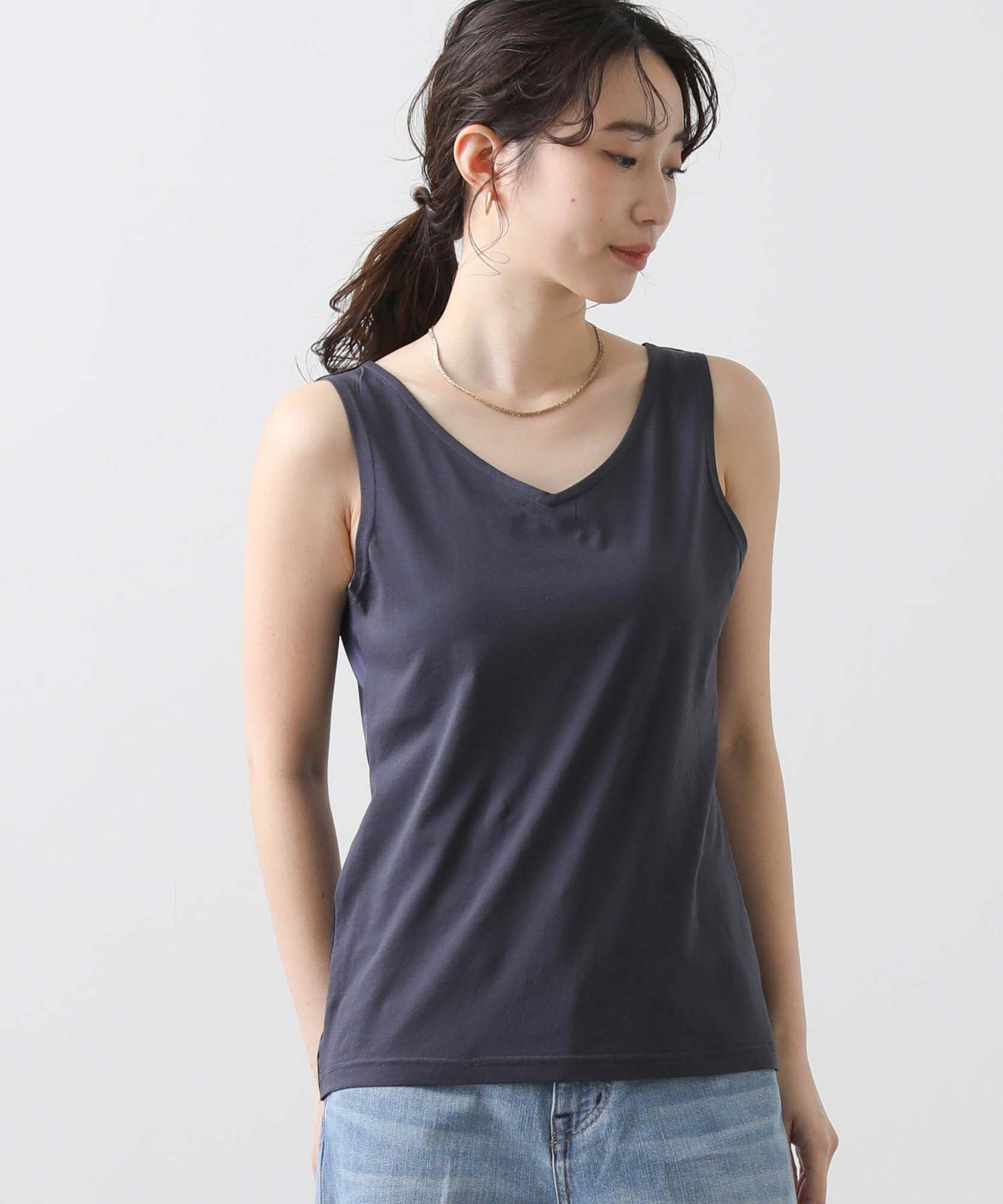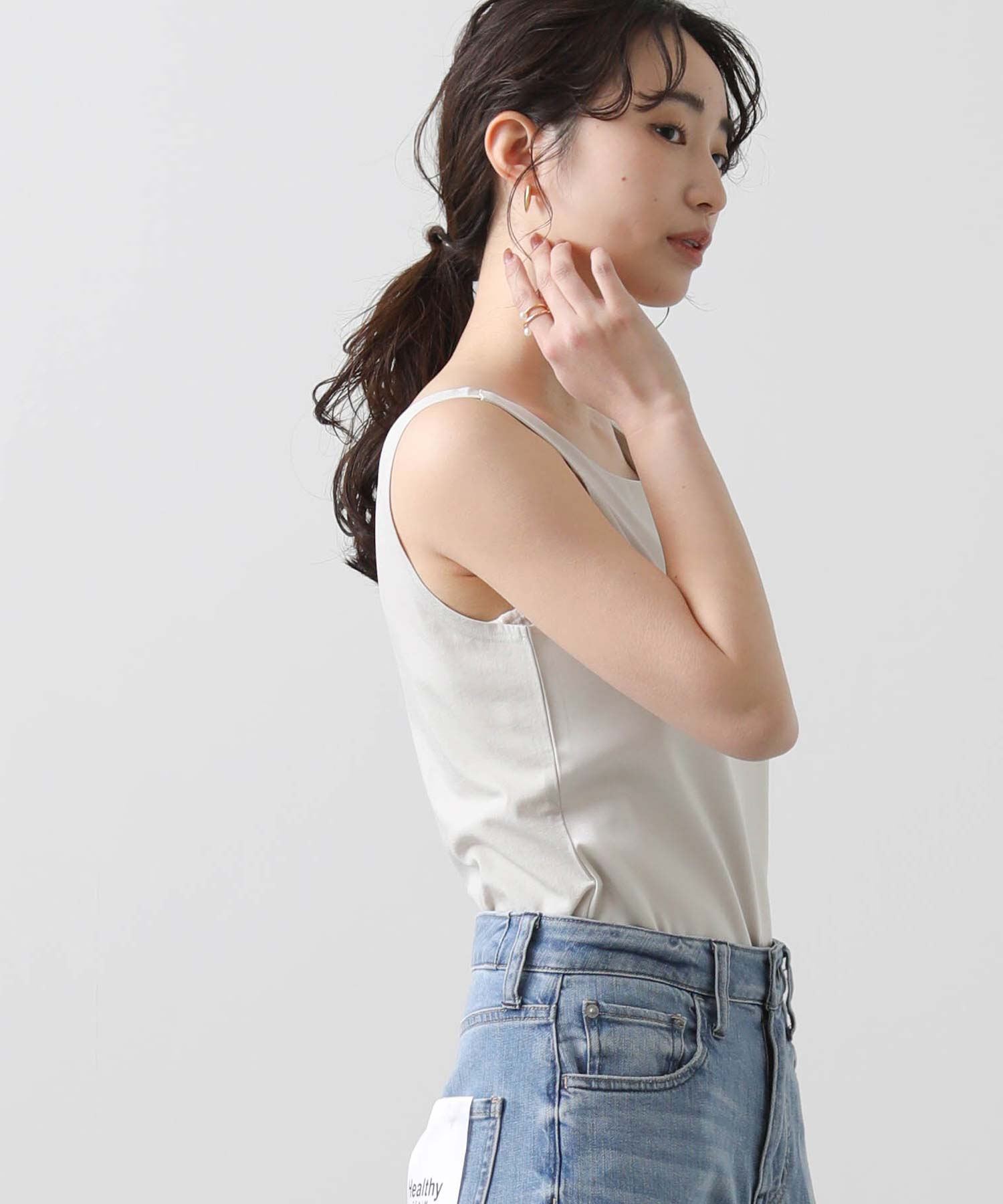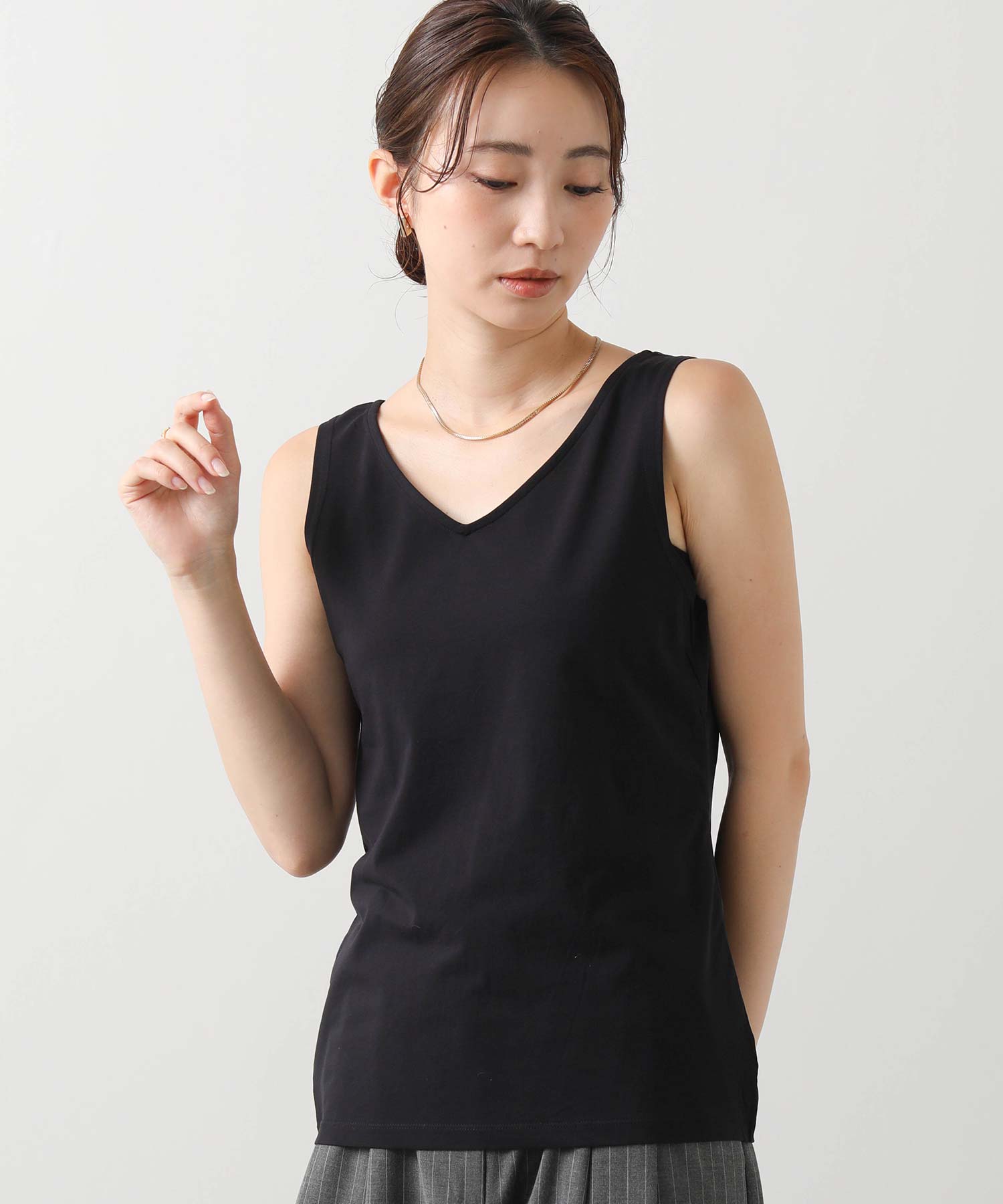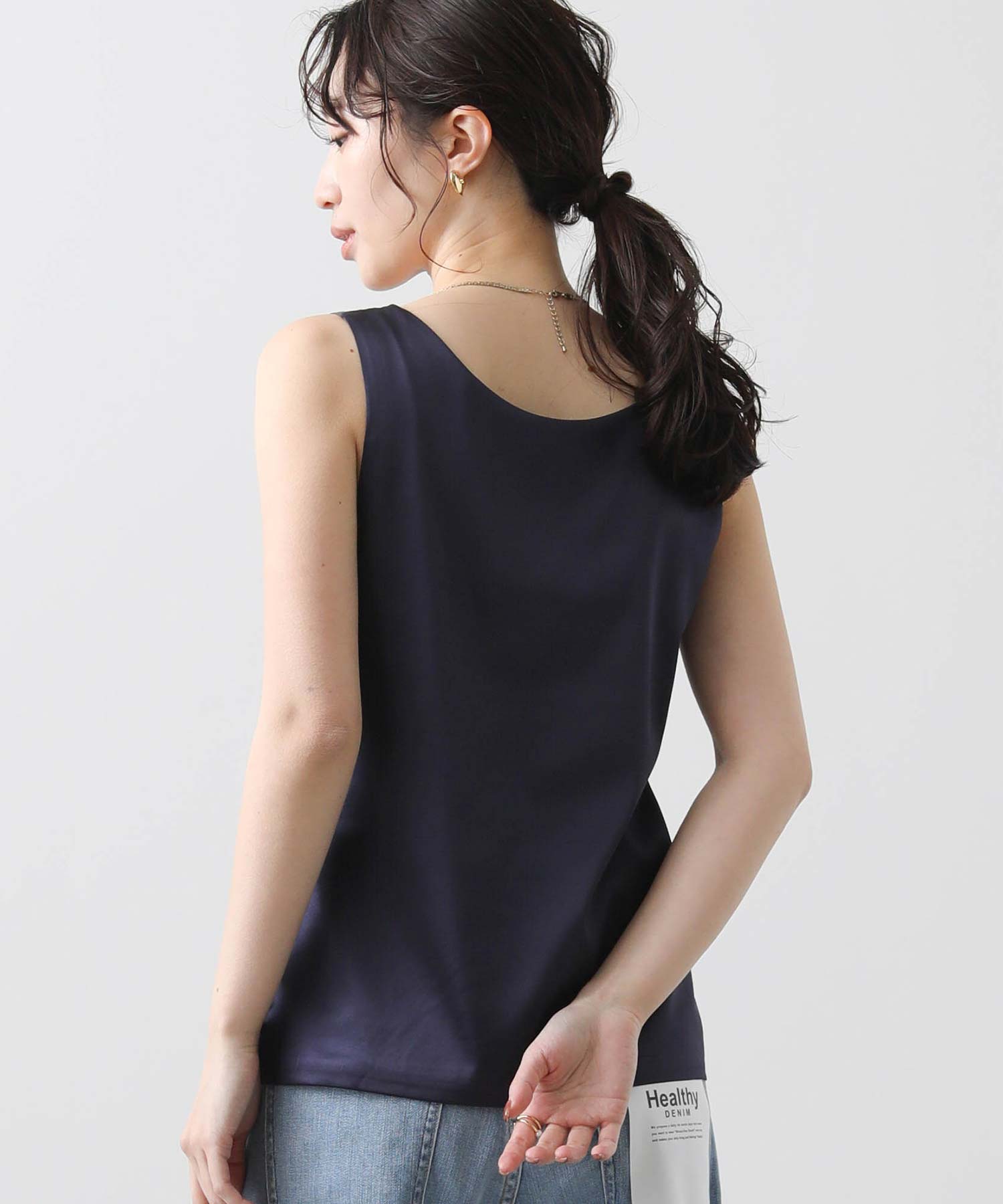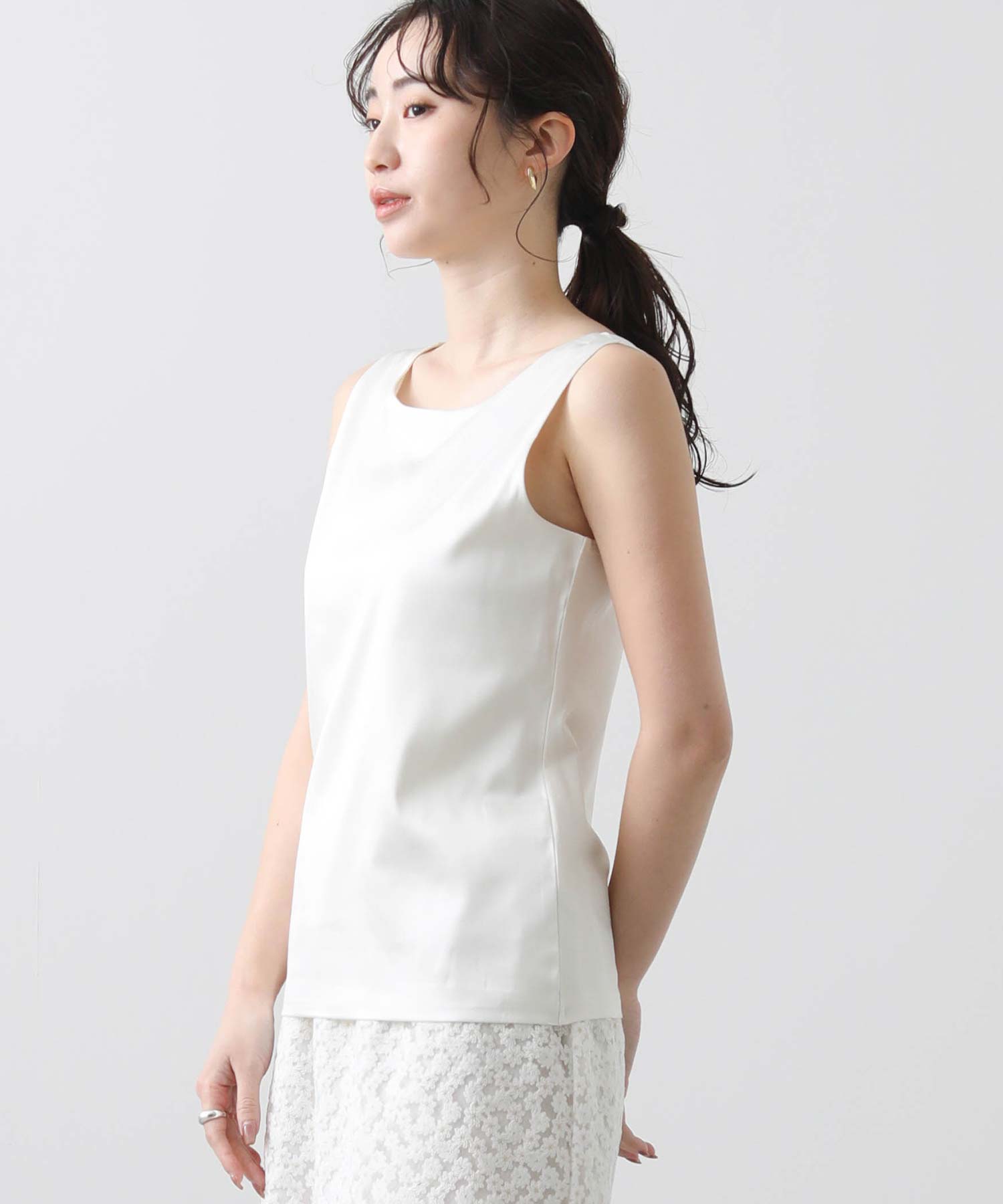 洗練された光沢感と機能性を兼ね備えた大人の女性のためのタンクトップ。 程よい艶感のあるストレッチサテン素材を使用し、女性らしい印象を演出しながらも動きやすさをしっかり確保。