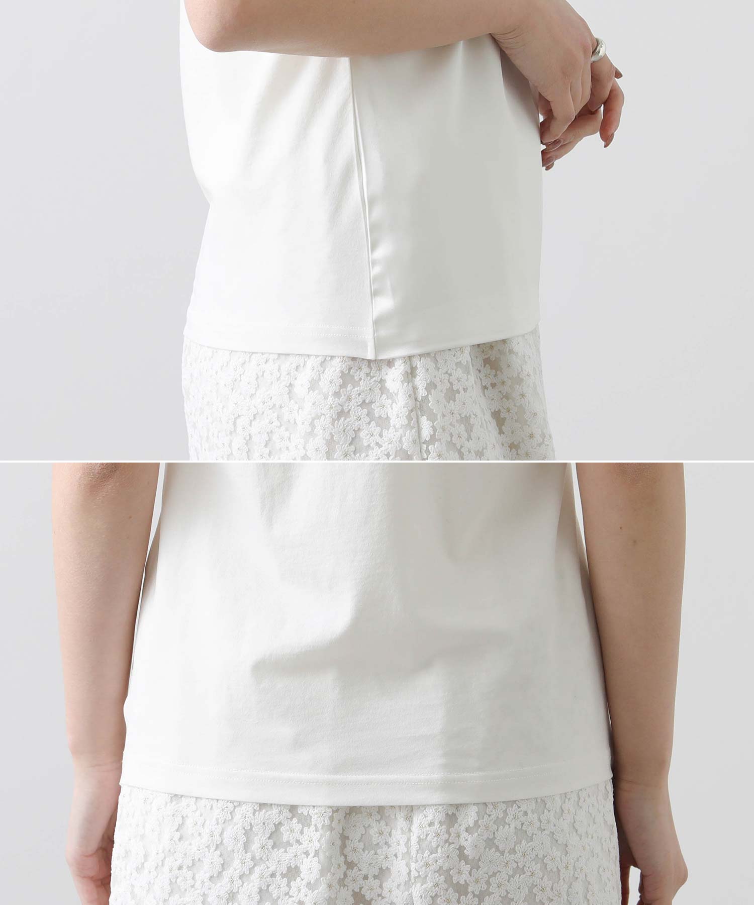 後ろ身頃やサイドにはドライタッチなカットソー素材を使用。肌に張り付きにくく、さらりとした快適な着心地。