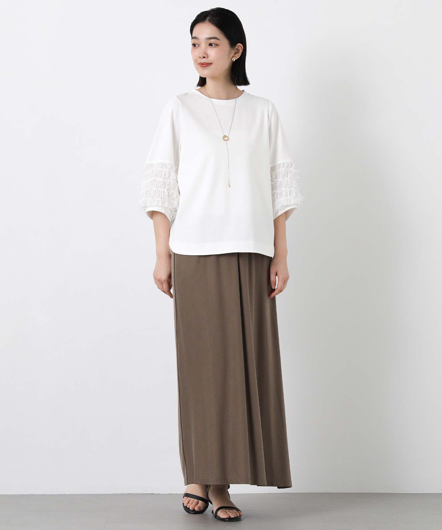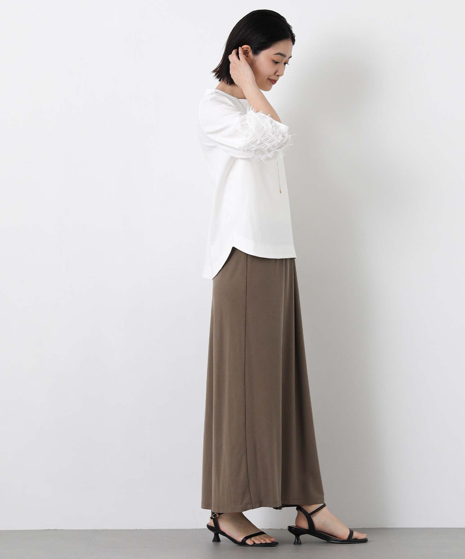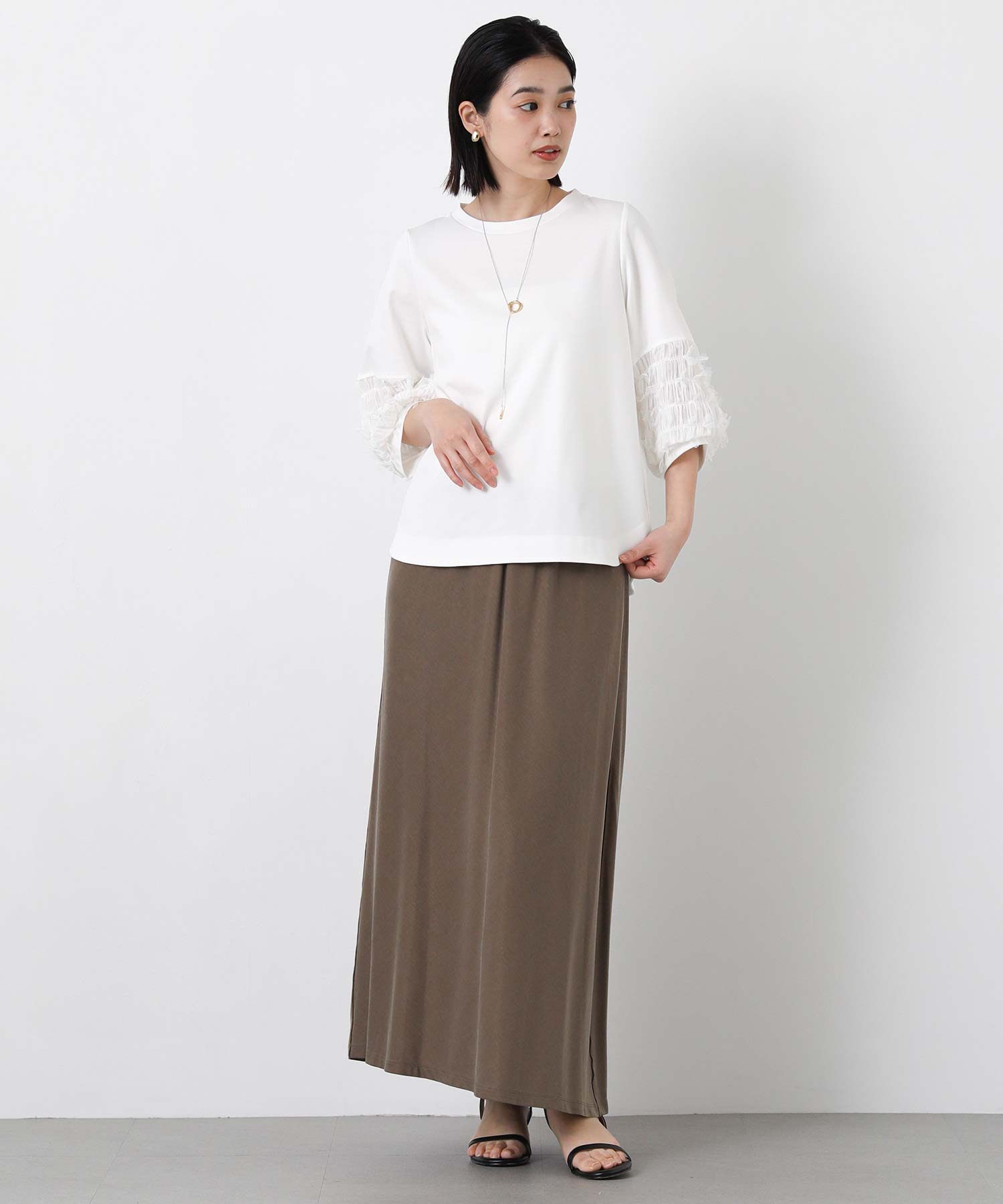 身体のラインを拾いにくいサイジングと素材、さらにセットインスリーブにすることで肩まわりをスッキリと見せ、バランスの取れた美しいシルエットを実現しました。