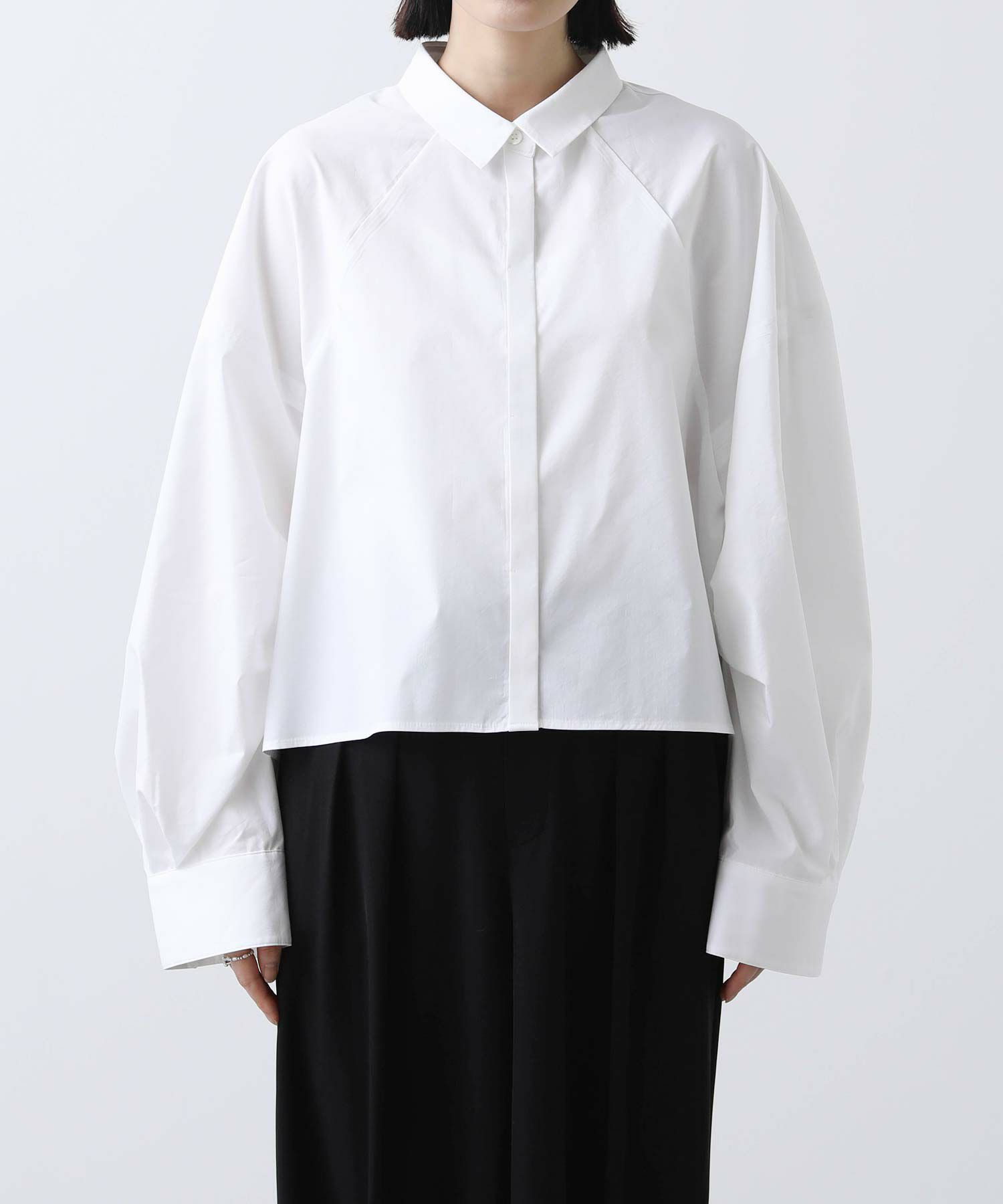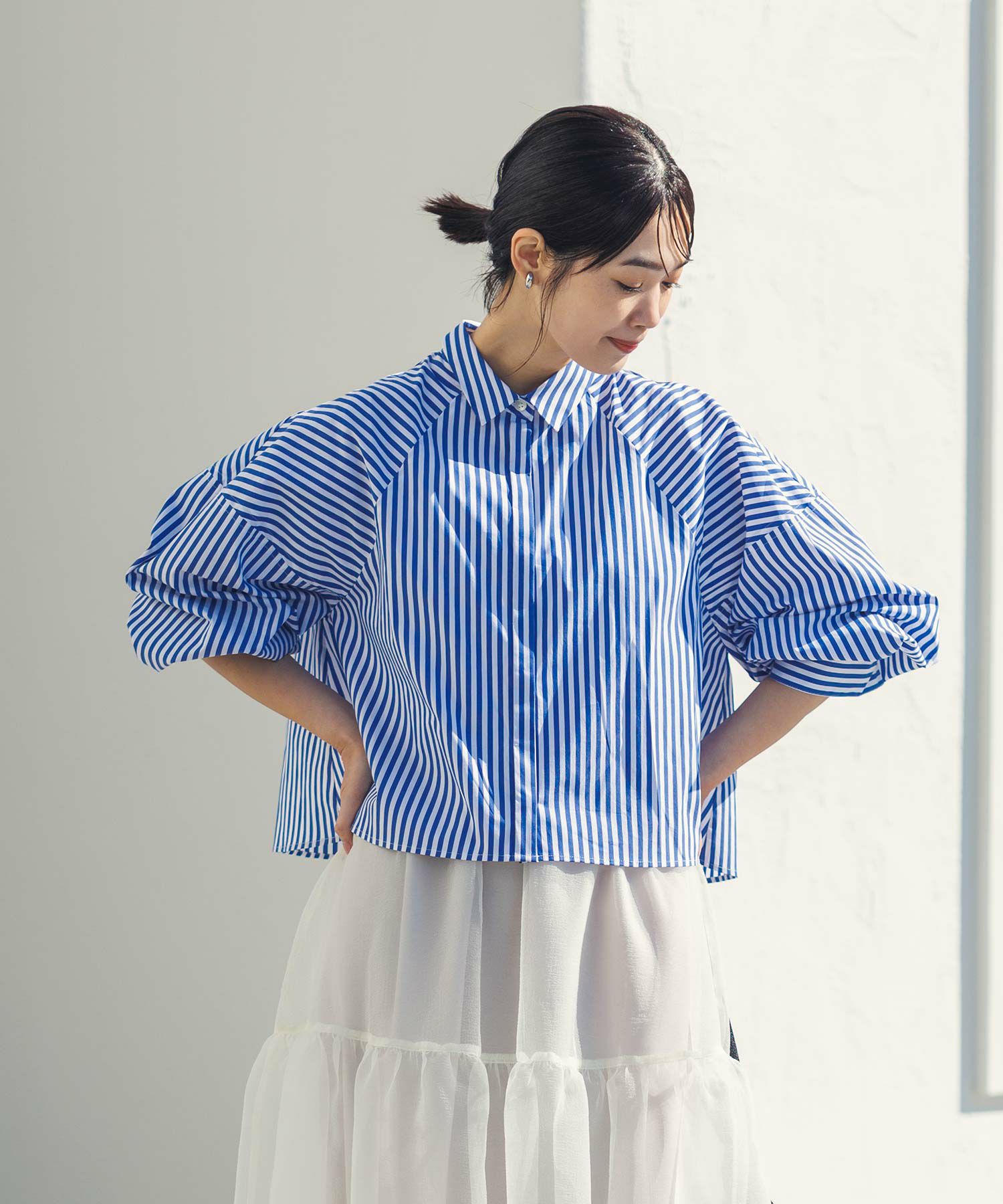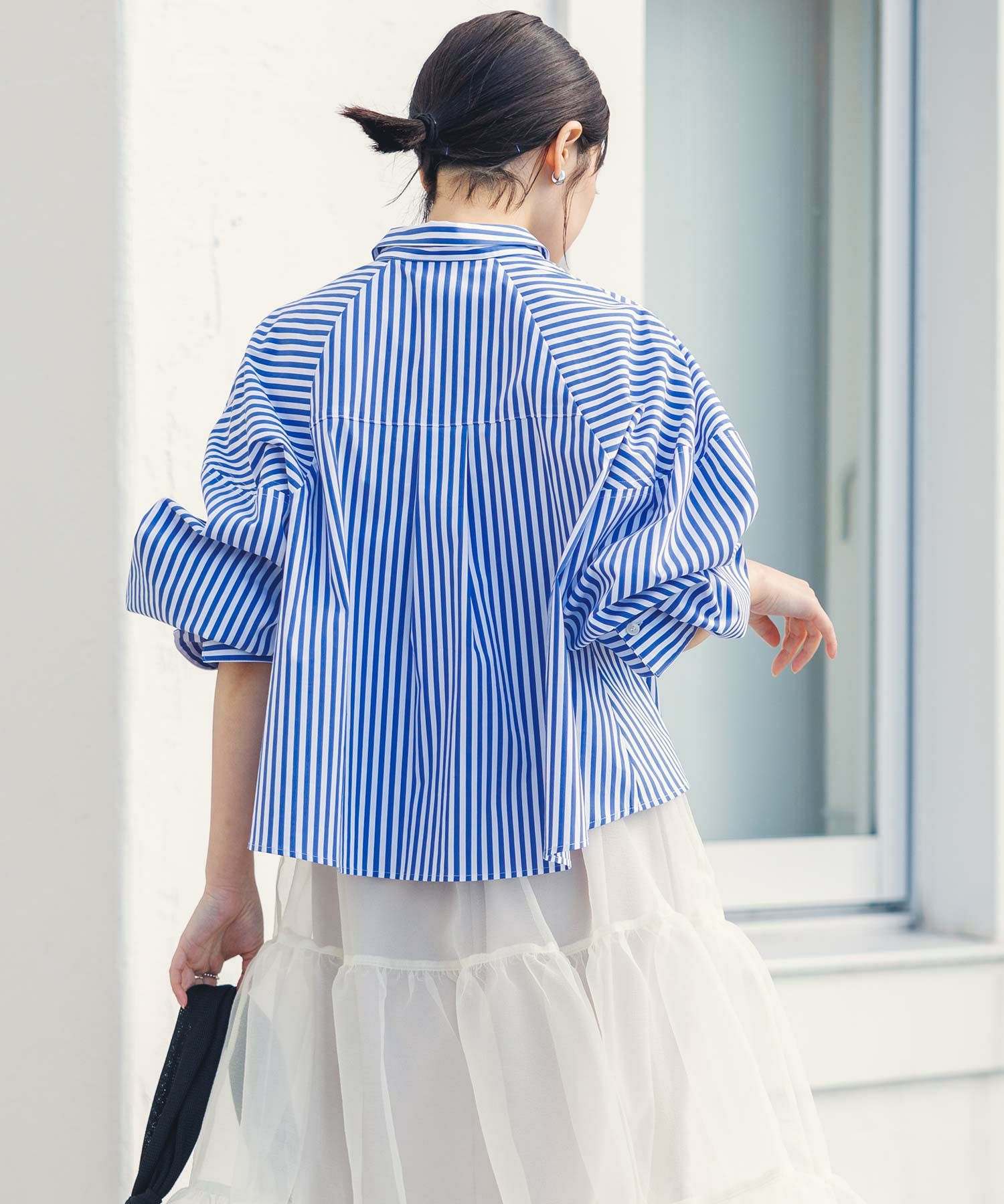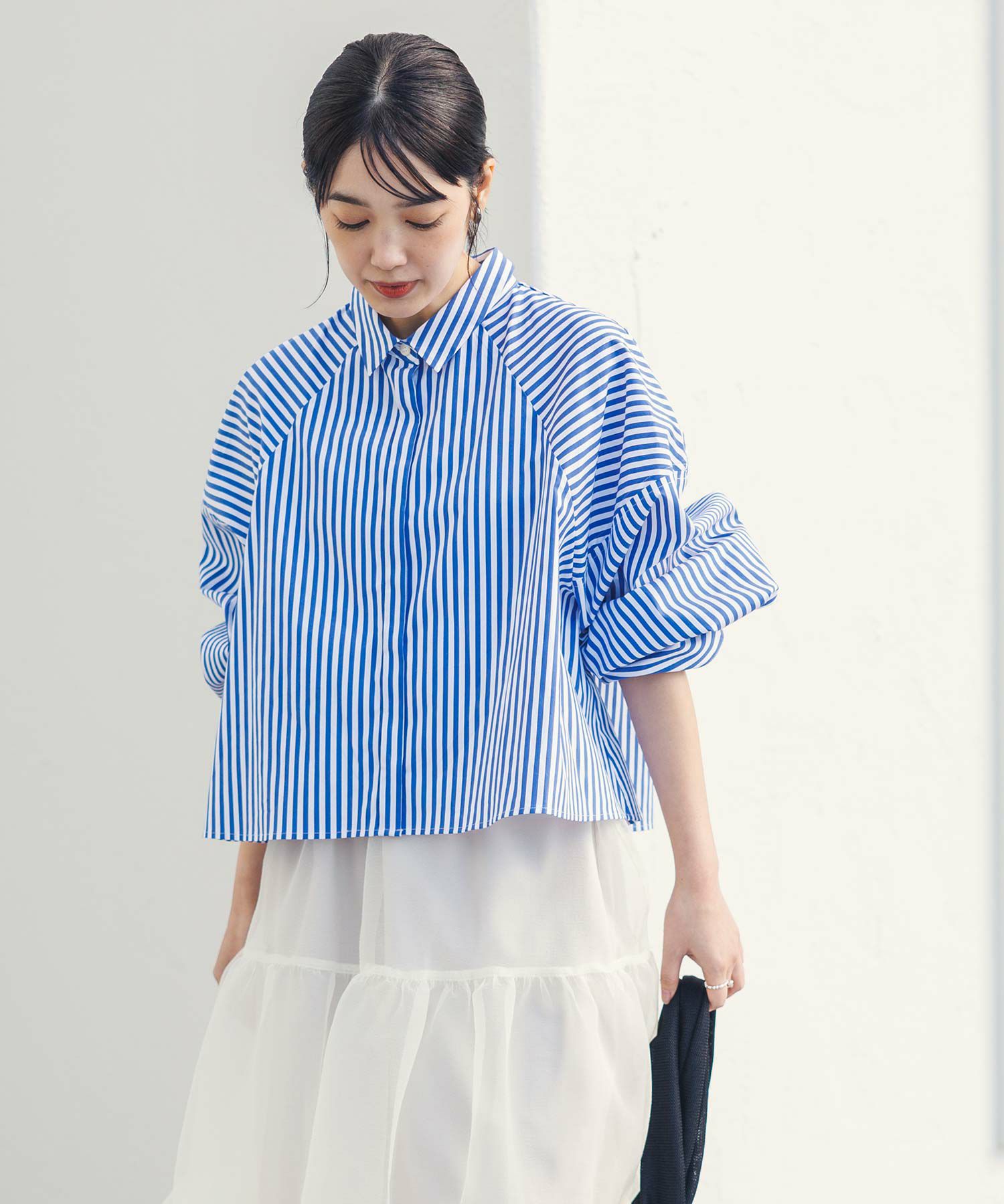 今年らしいクロップド丈のシャツ。