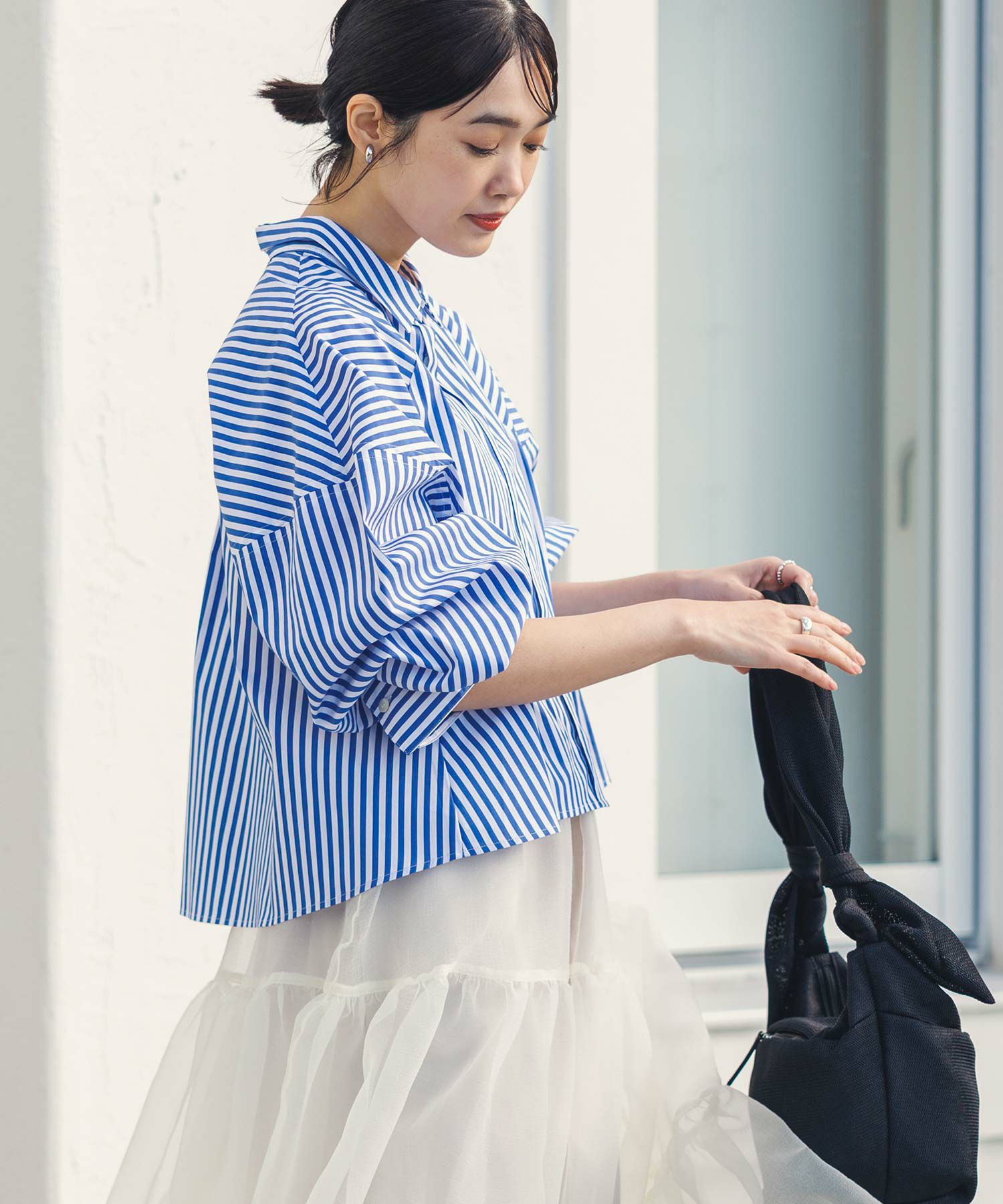 今年らしいクロップド丈のシャツ。