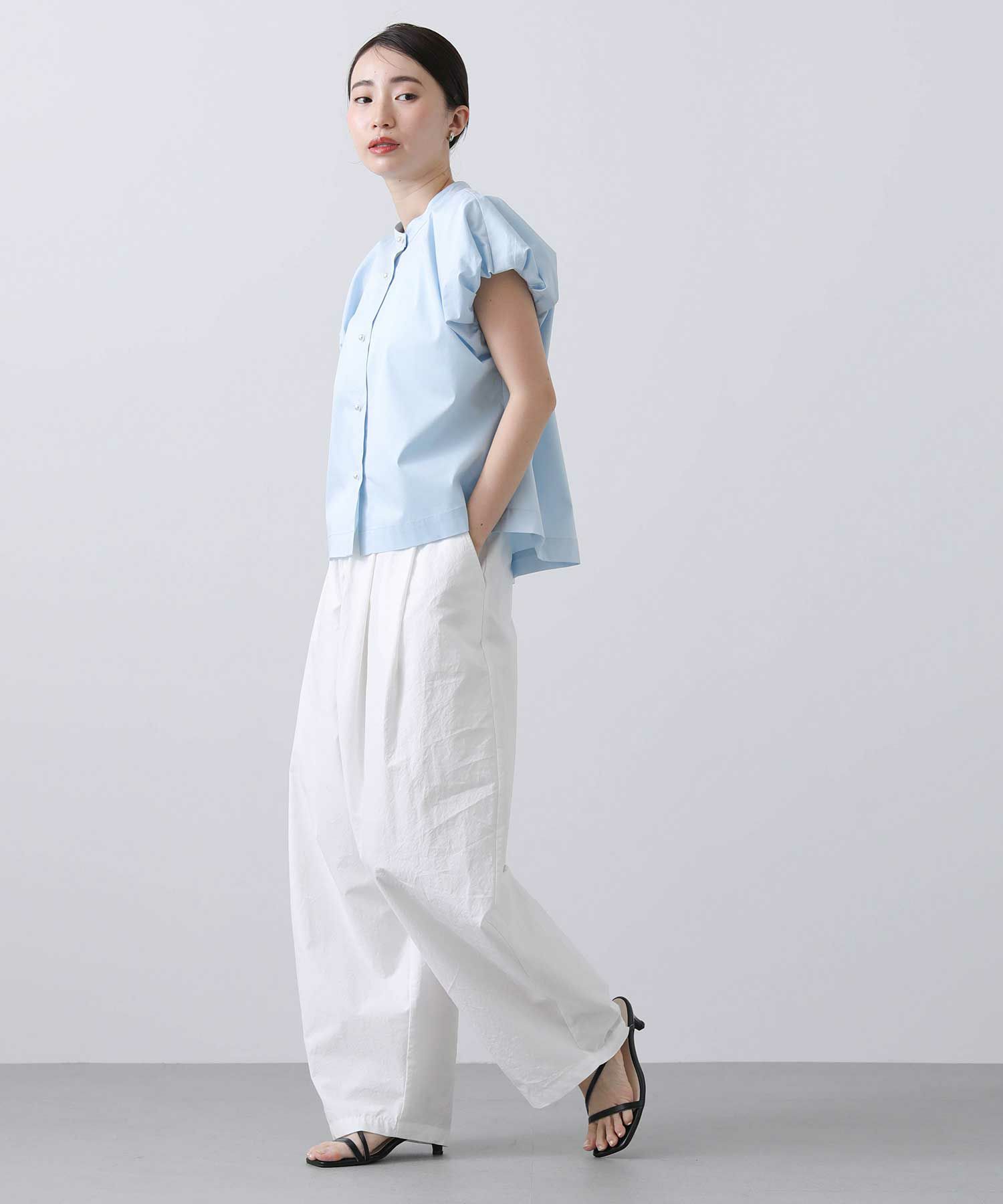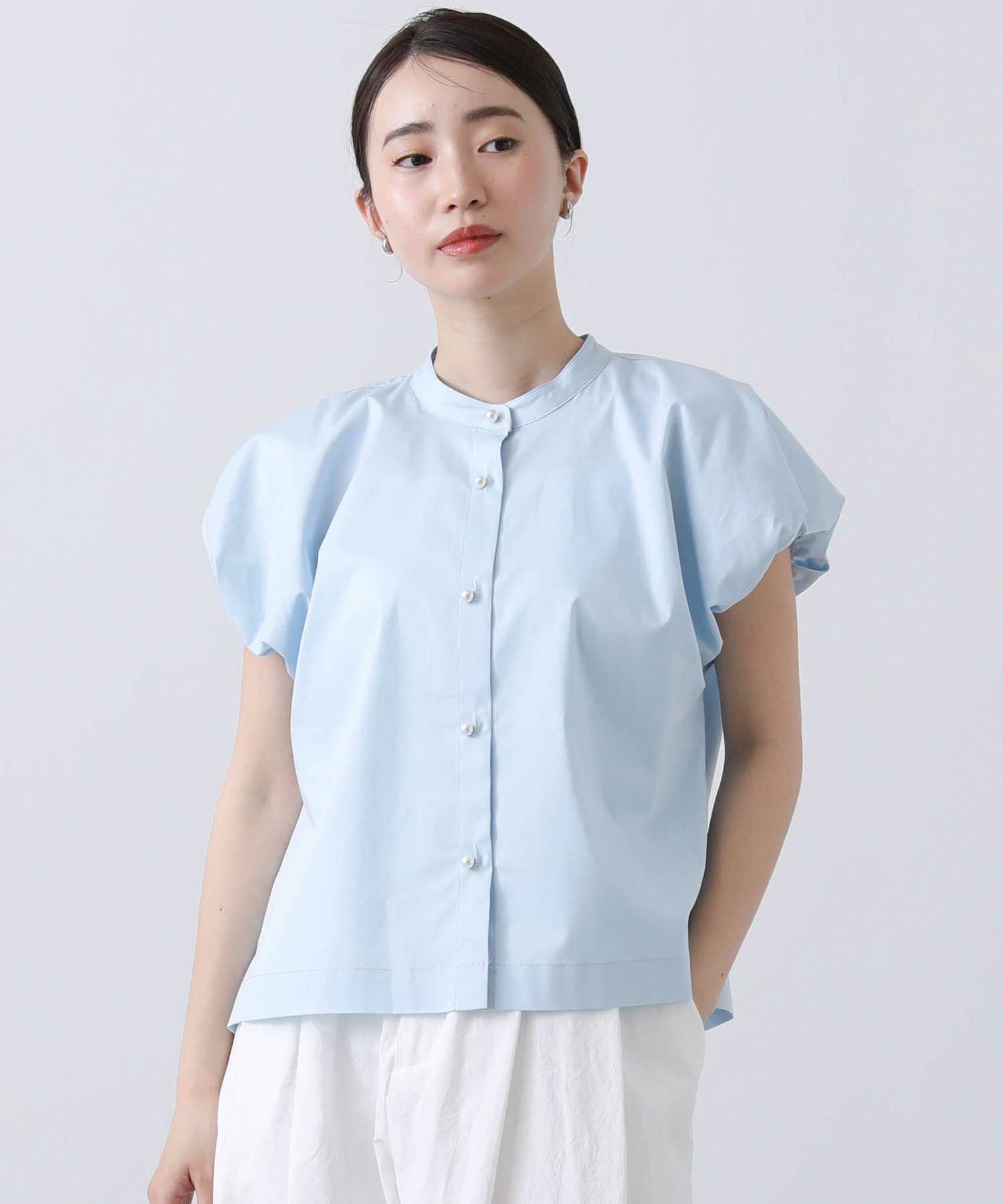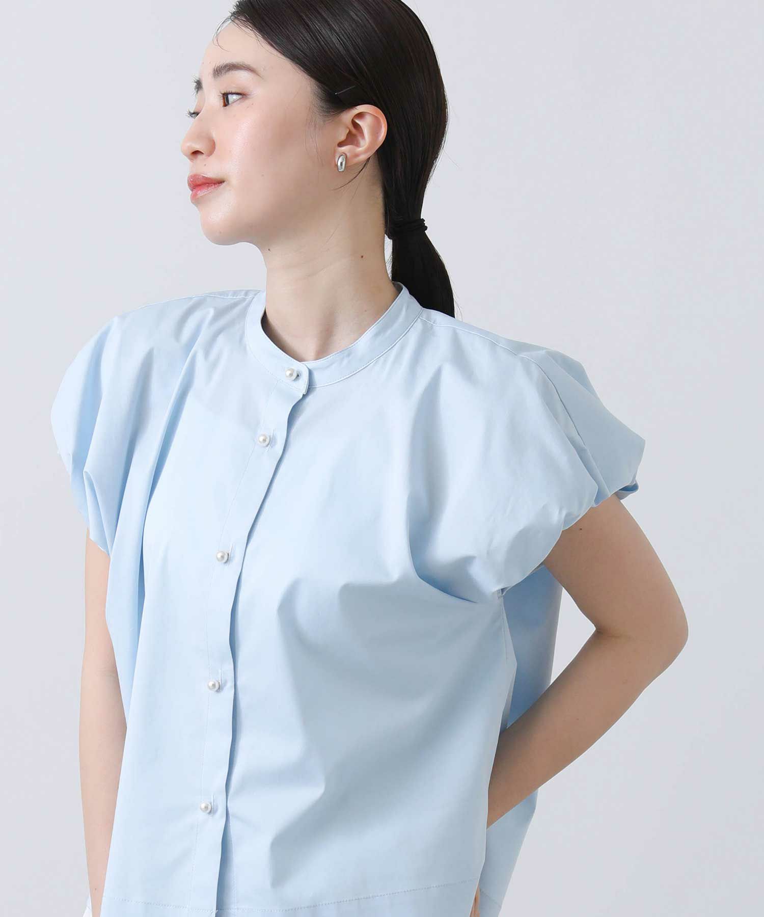 スタンドカラーで首周りをすっきりさせ、バルーン袖の甘さを抑えたデザインが魅力の一着。