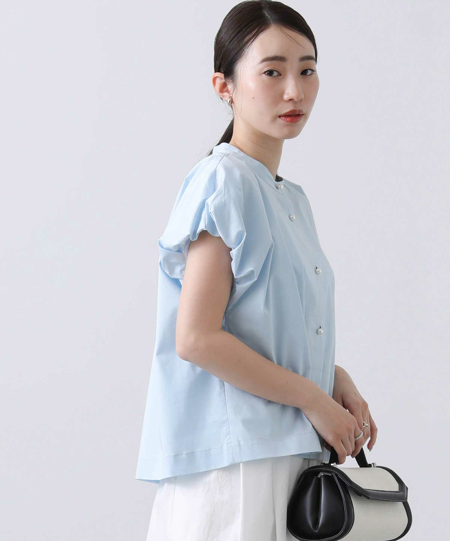 パールボタンが着こなしのアクセント。