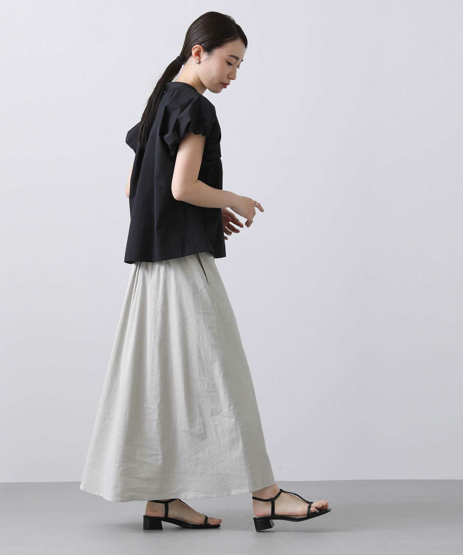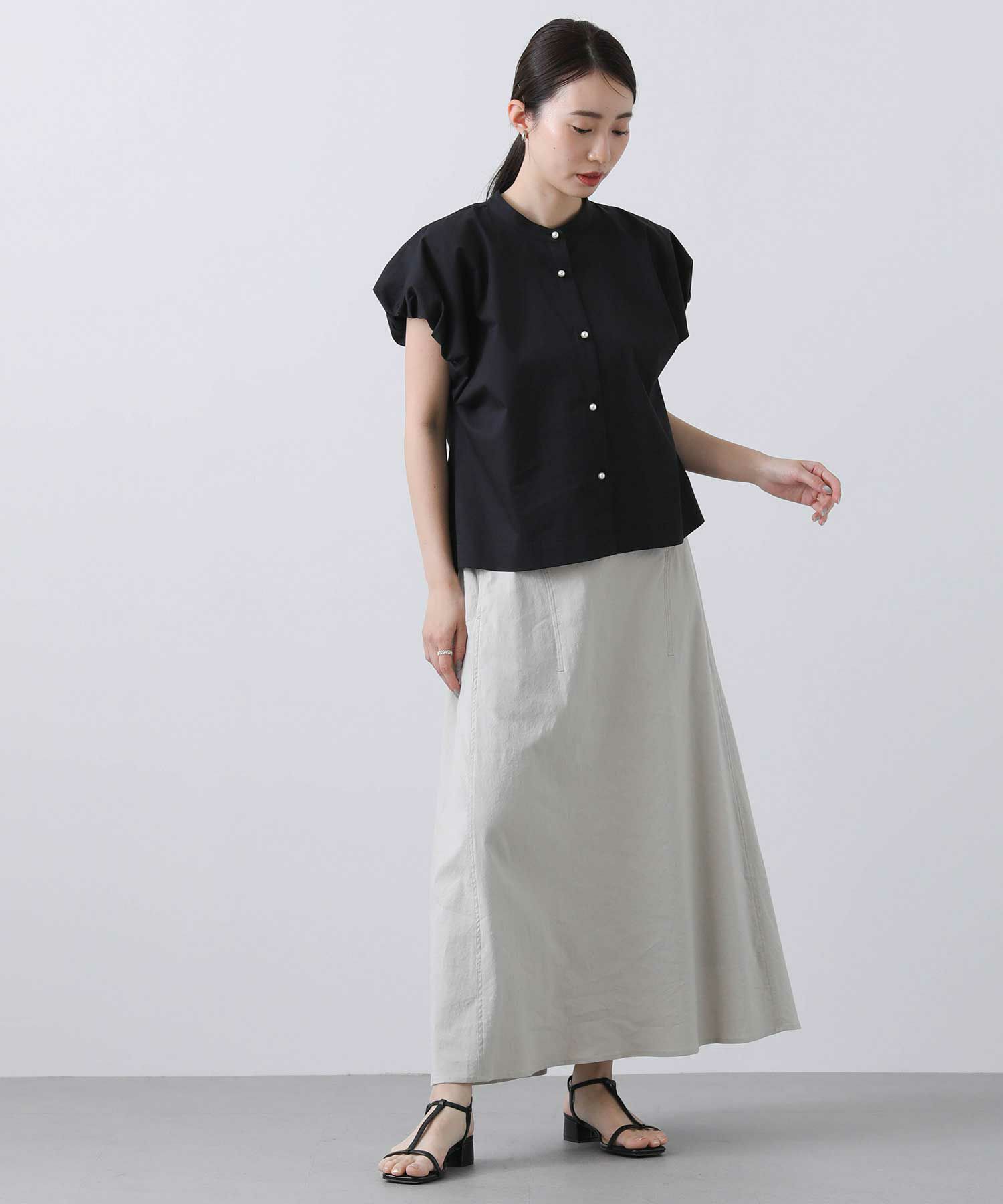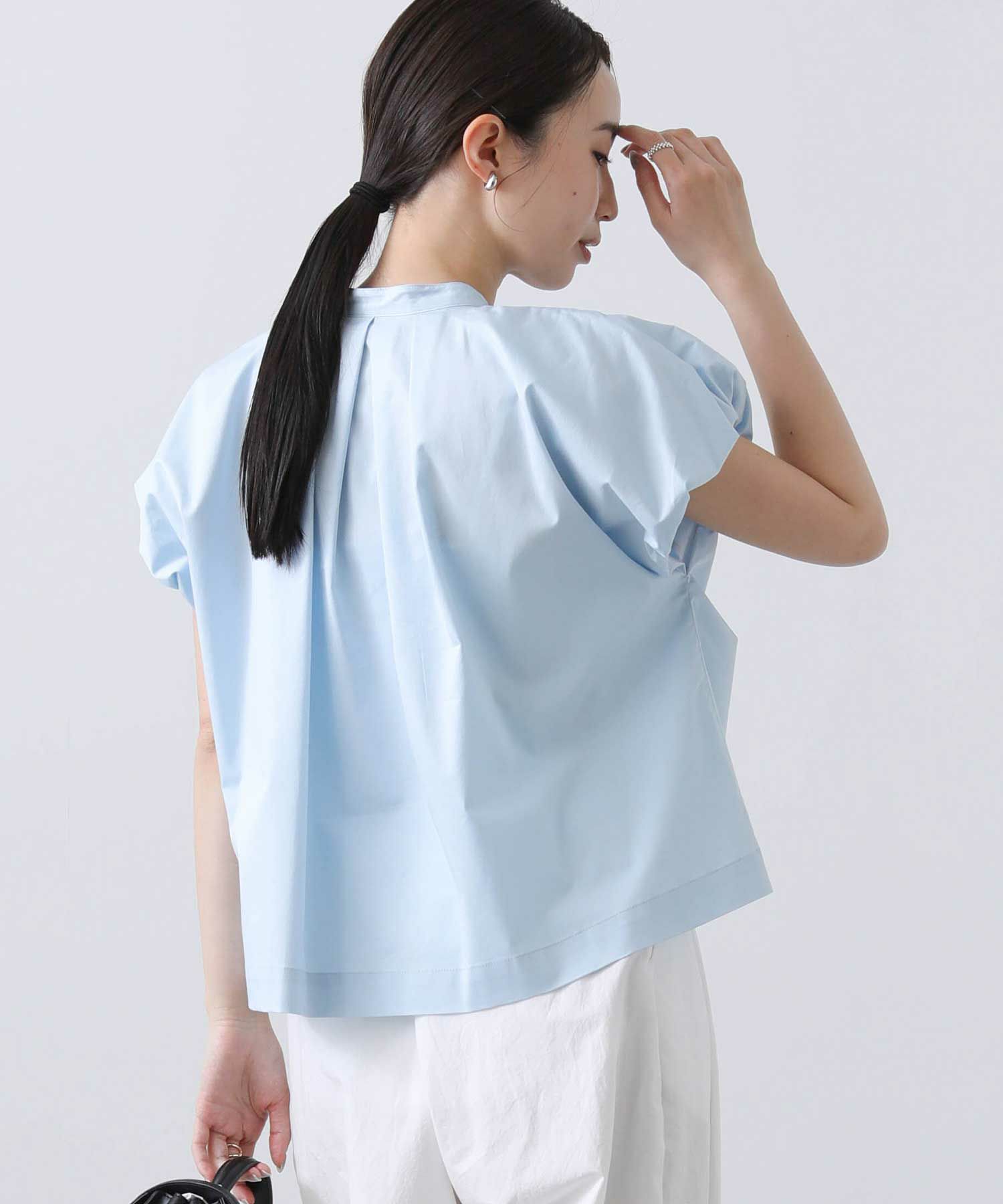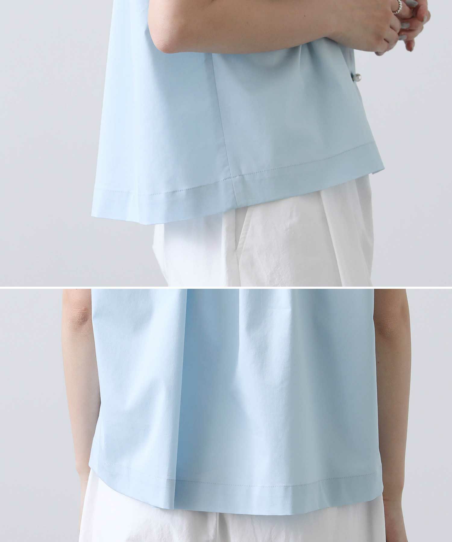 裾に前後差をつけることでボトムスを選ばず合わせやすい使用に。