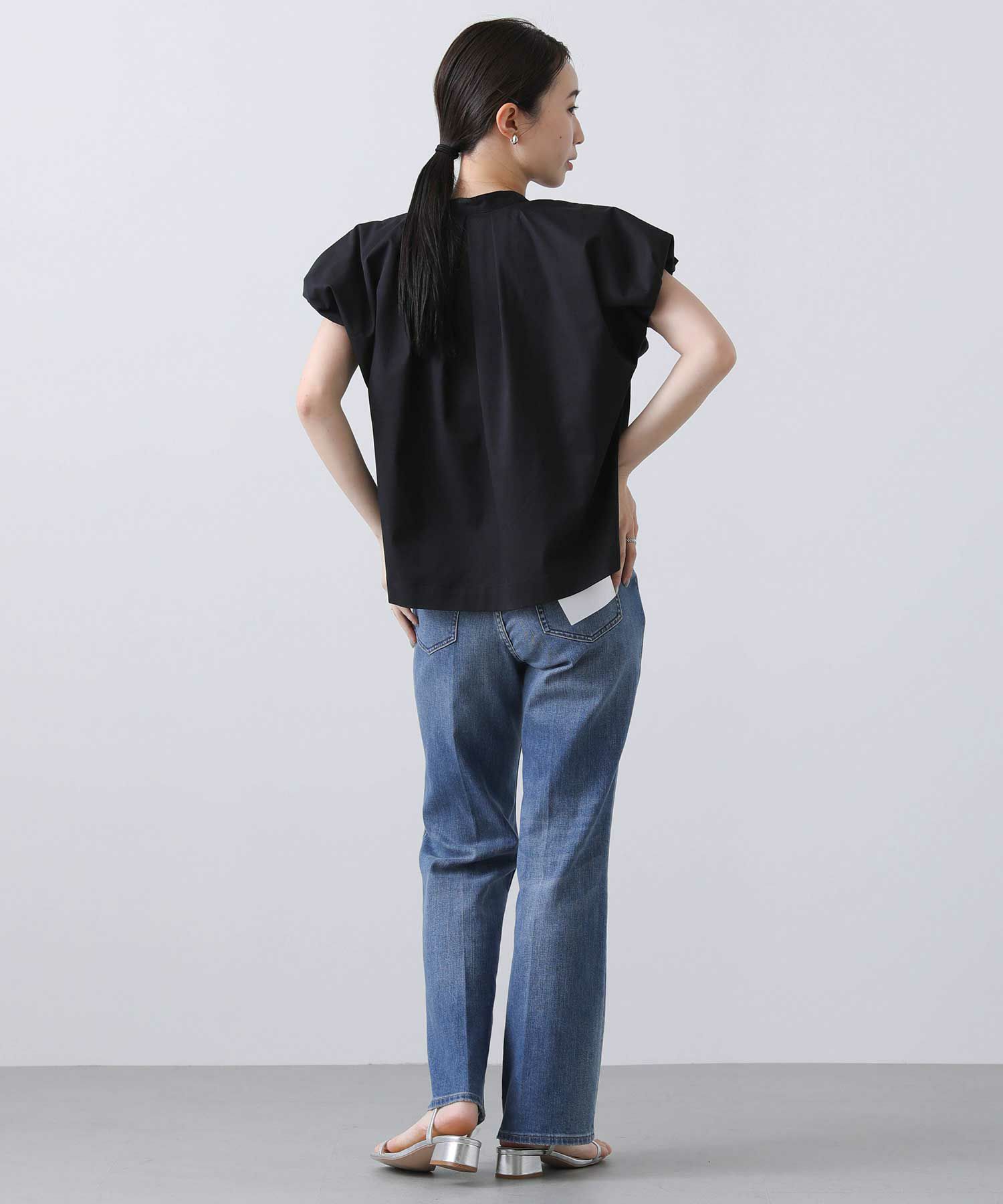 裾に前後差をつけることでボトムスを選ばず合わせやすい使用に。