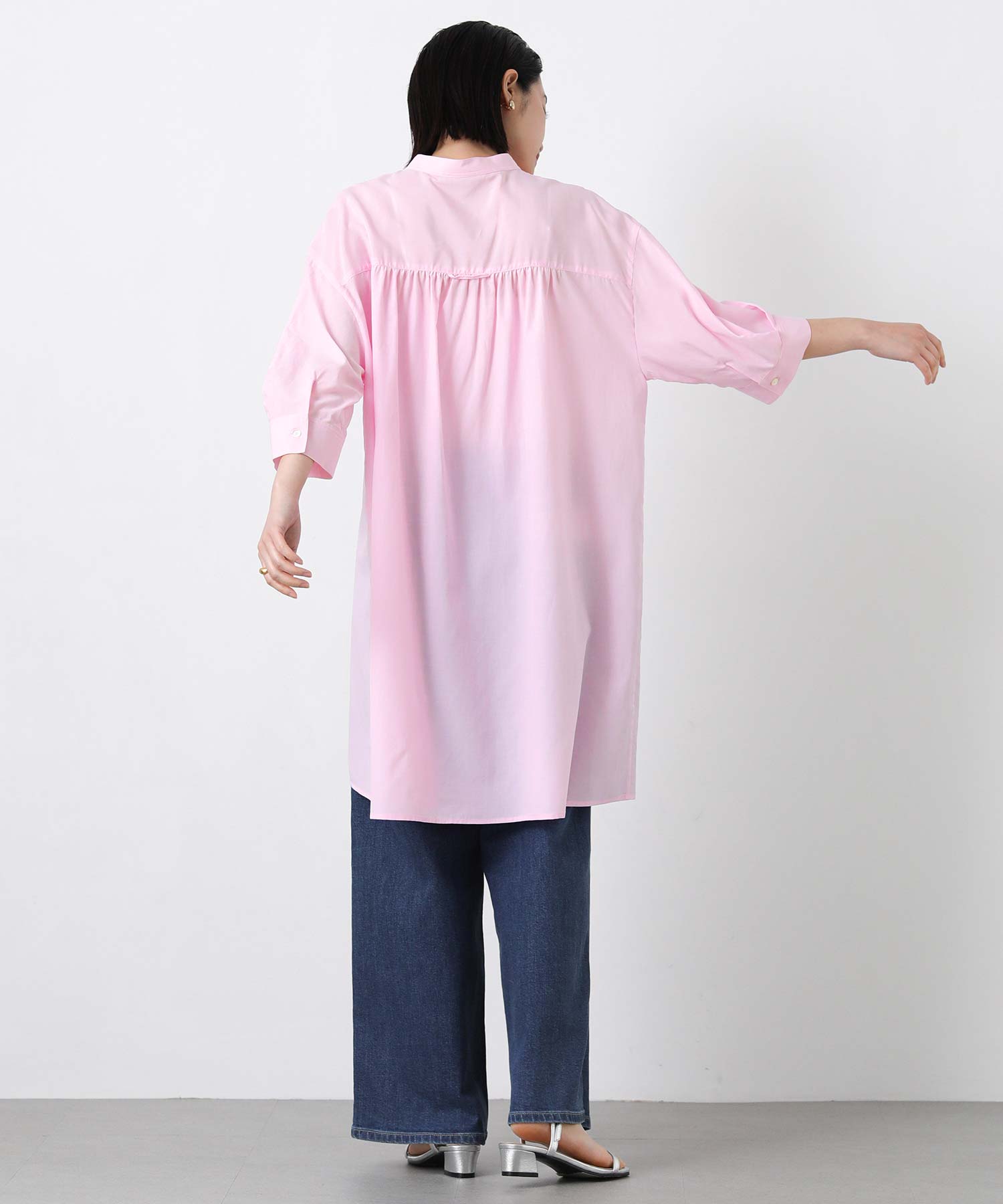 トレンド感のあるオーバーシルエットながら、シアー感と程よいハリ感のある素材でスッキリとした印象に。