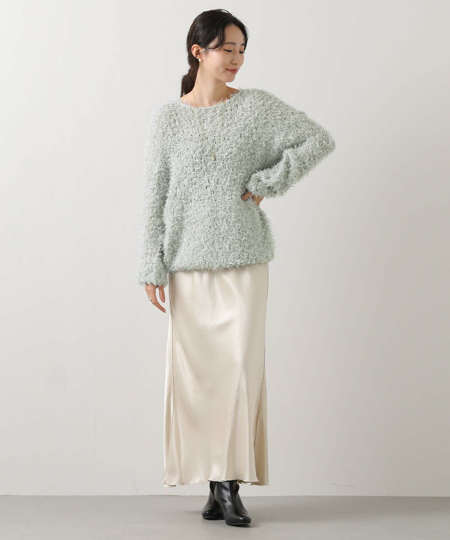 リボンヤーンを使用した、表情豊かな風合いが魅力のボートネックニット。