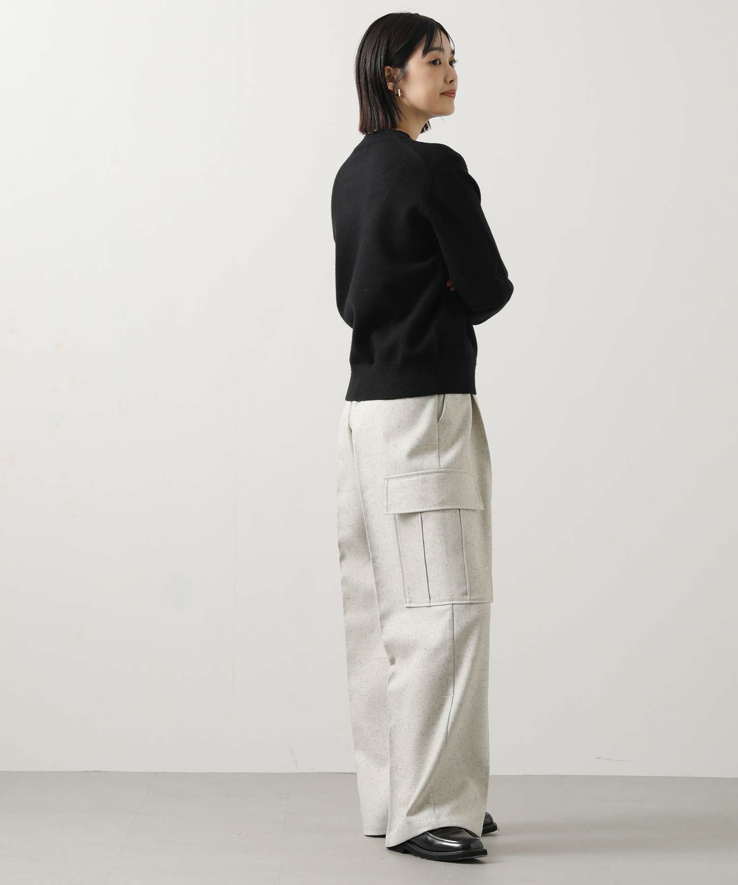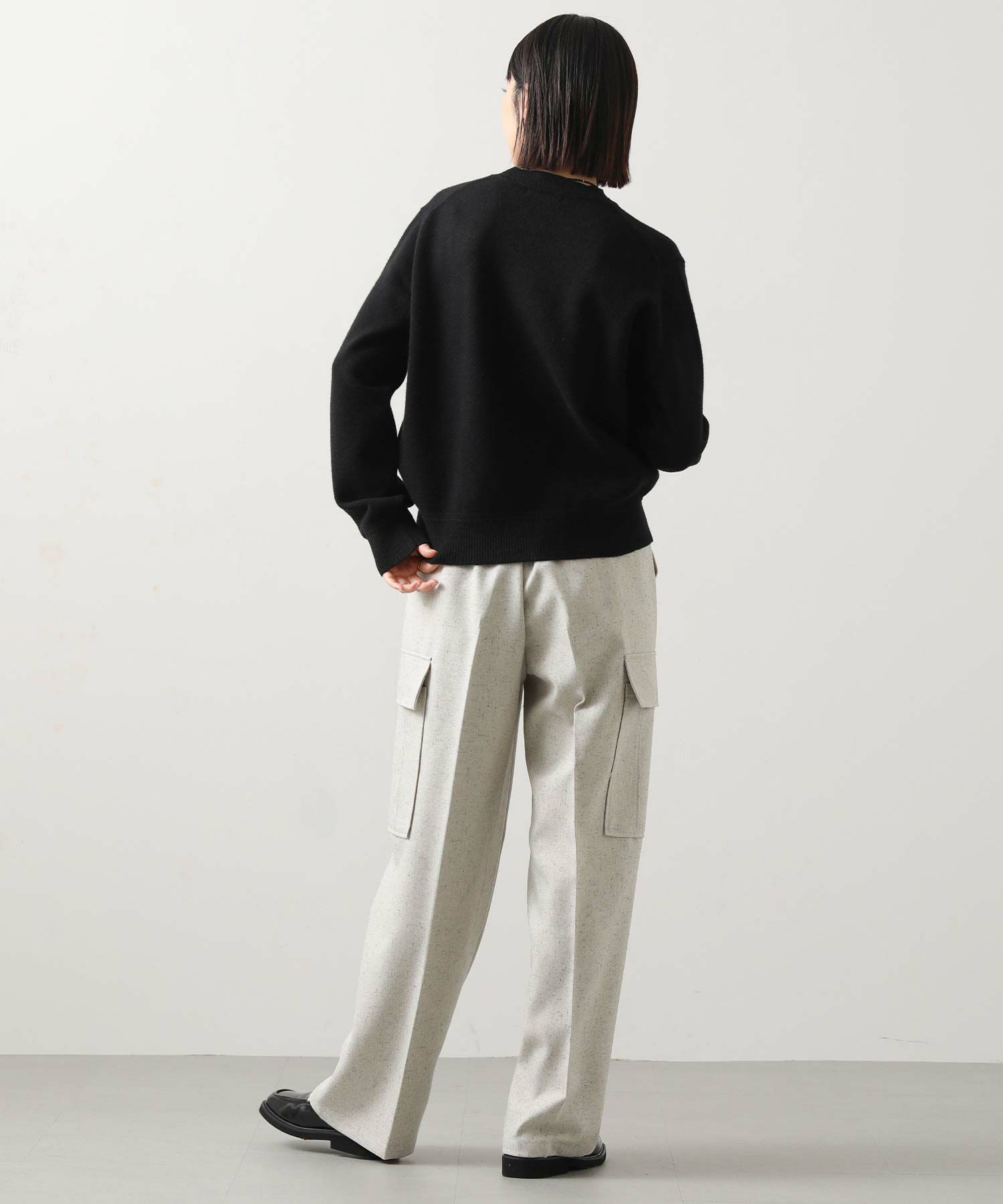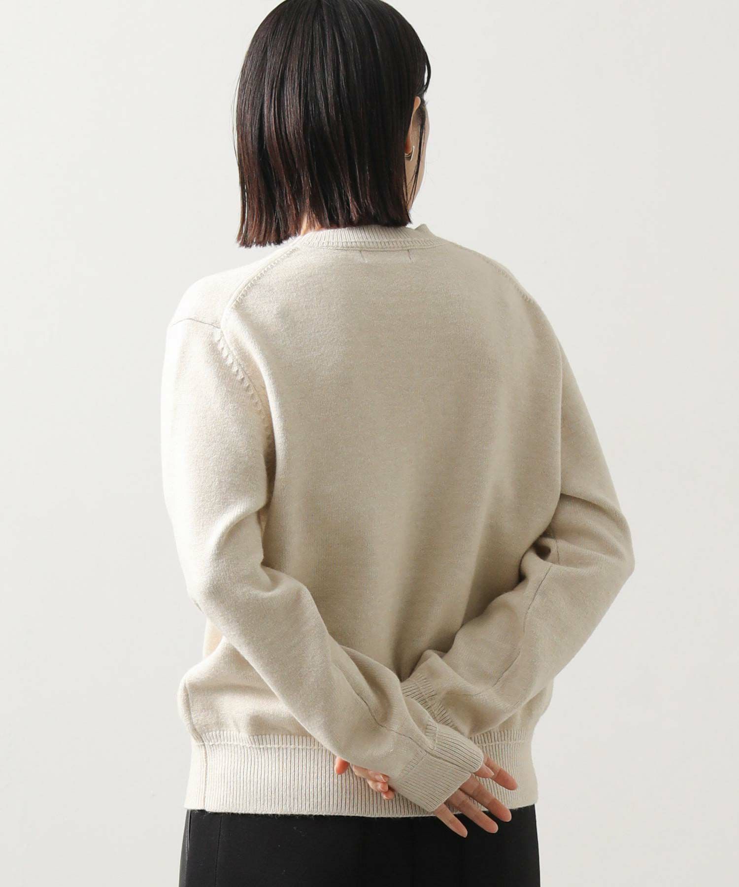 衿ぐりは程よく詰まったクルーネックで、首元をきれいに見せながら安心感のある着心地。