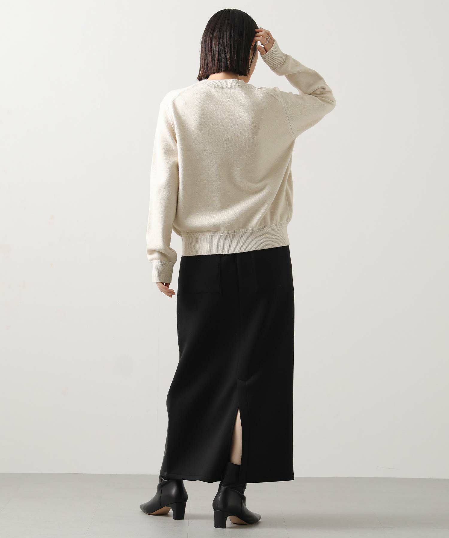 衿ぐりは程よく詰まったクルーネックで、首元をきれいに見せながら安心感のある着心地。
