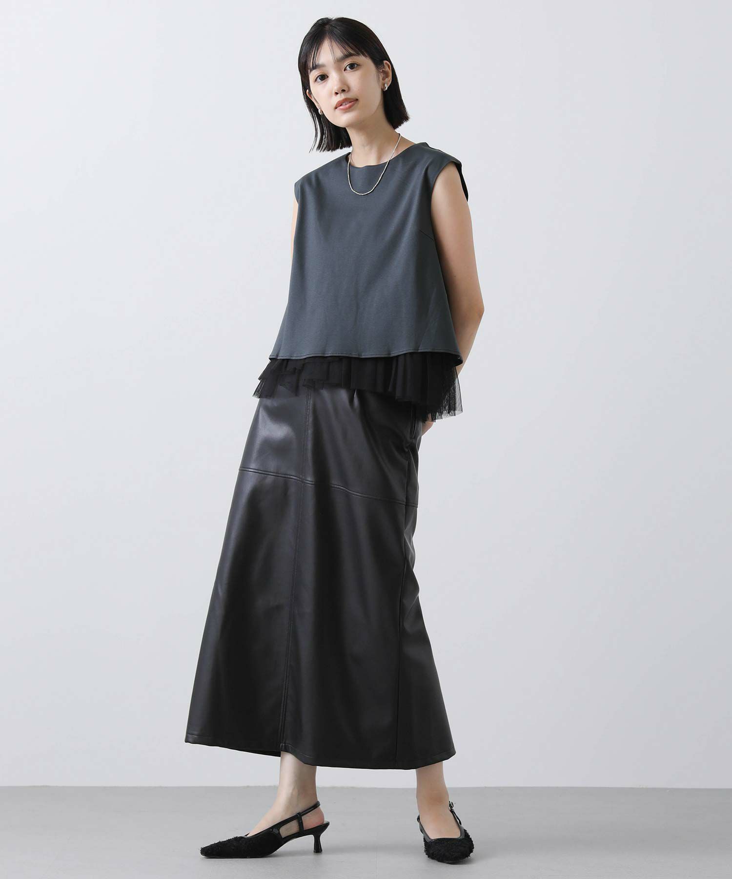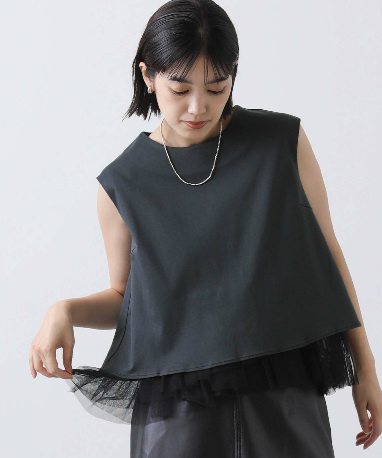 【anana/アナナ】から、きれい見えするTシャツ生地に裾からチュールレースがのぞくドッキングプルオーバーをセレクト。