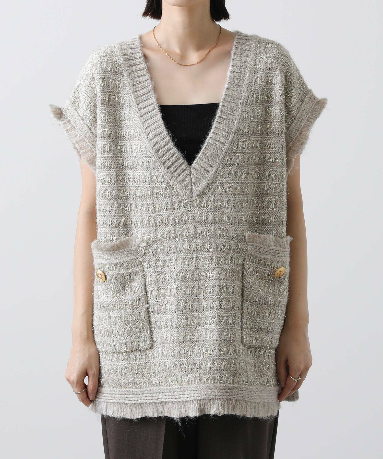 意匠糸を使用し、ツイード見えするよう編み上げ、ゆったりとしたシルエットで、レイヤードしやすいサイズ感がポイント。