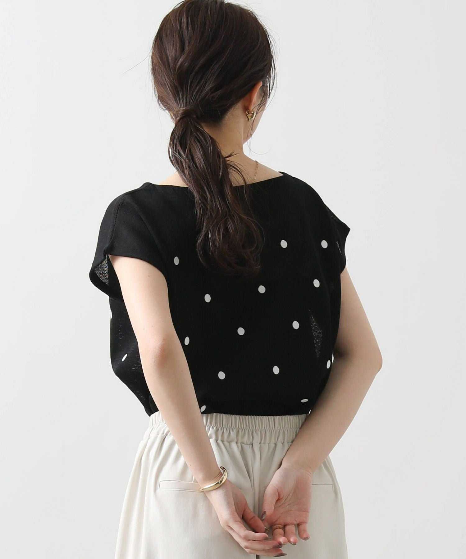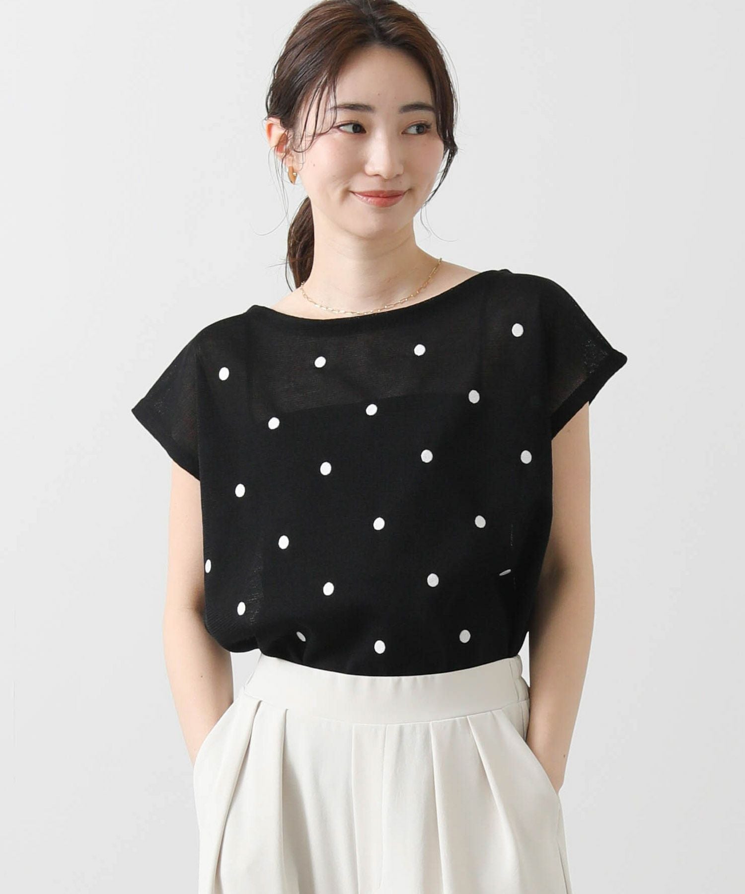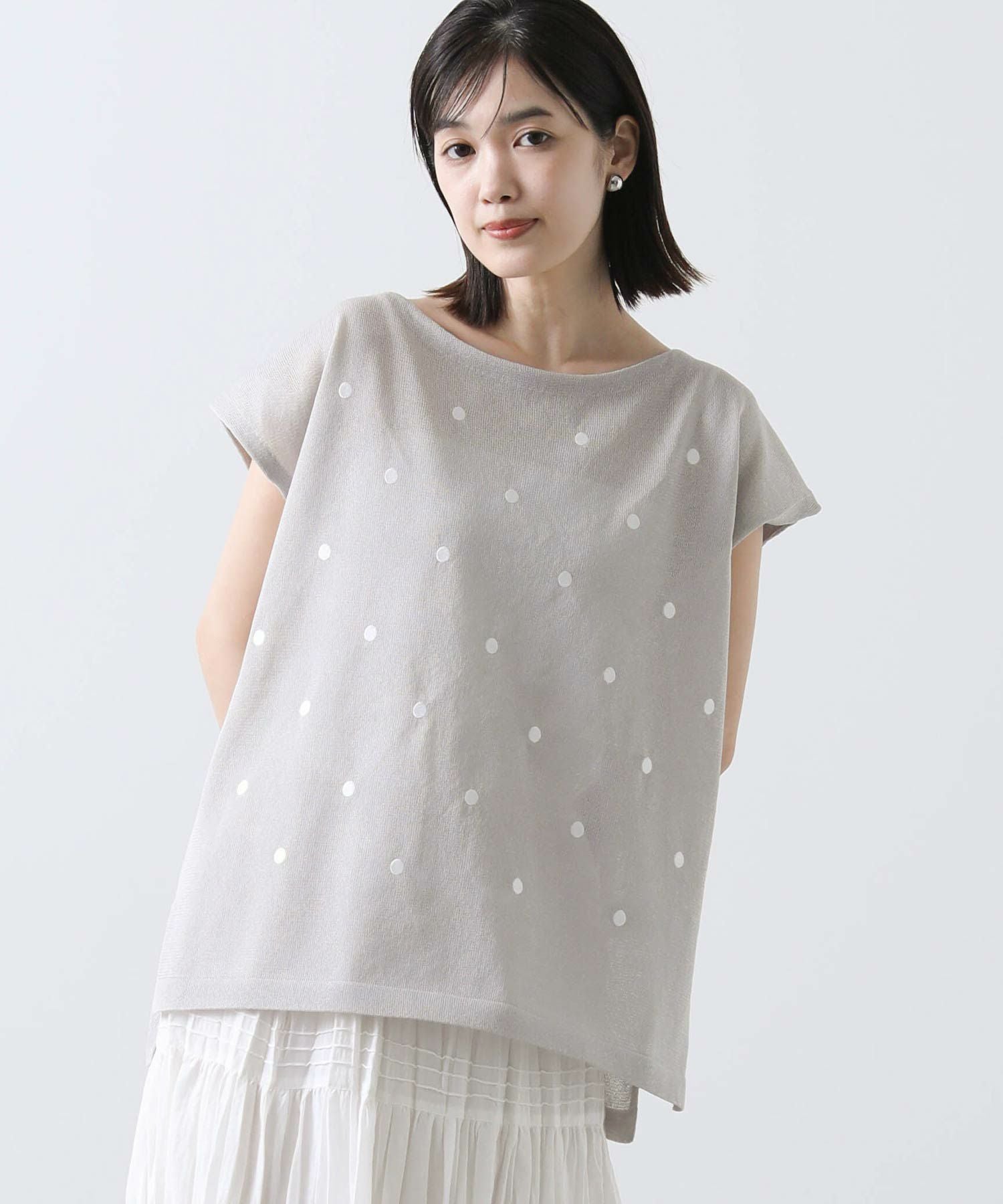 程よく間隔をあけて、大人フェミニンなドット柄に仕上げたサマーニット。