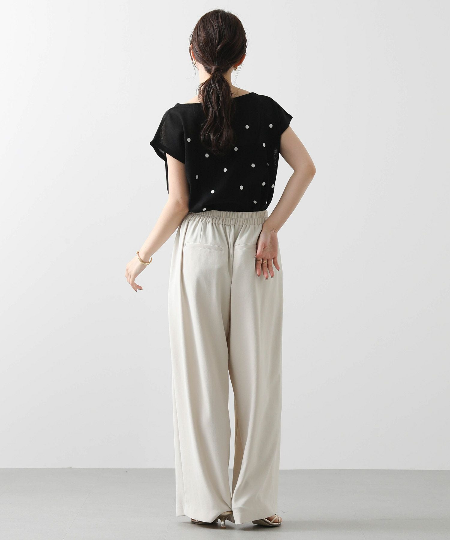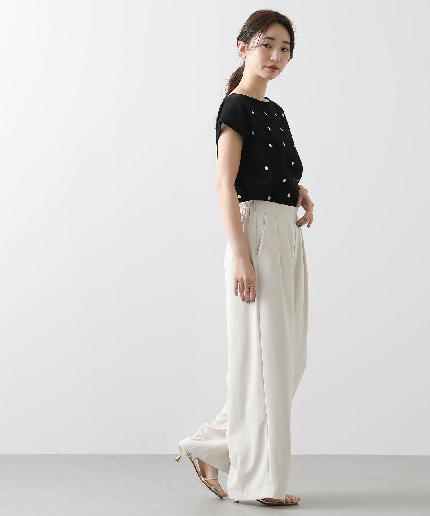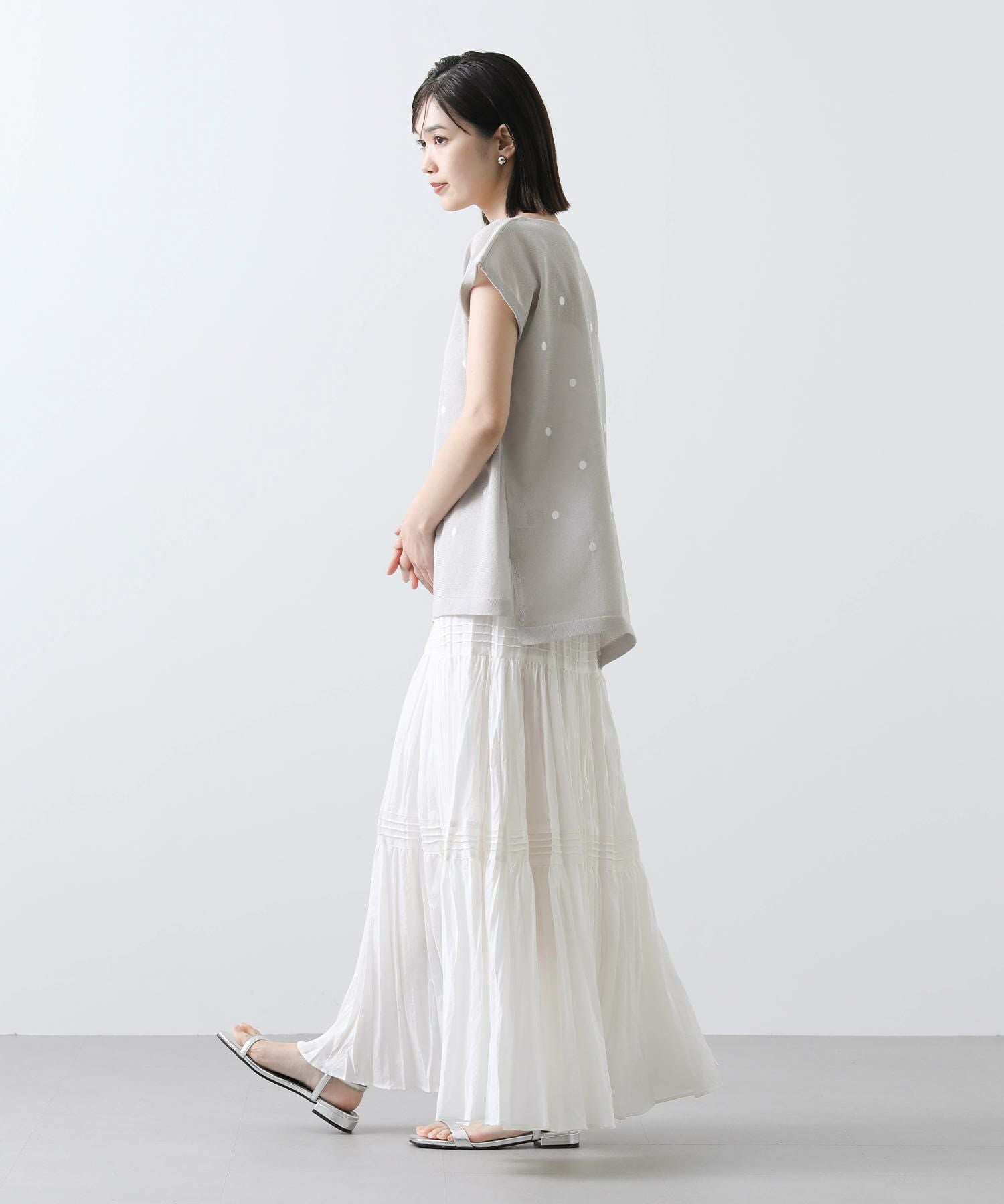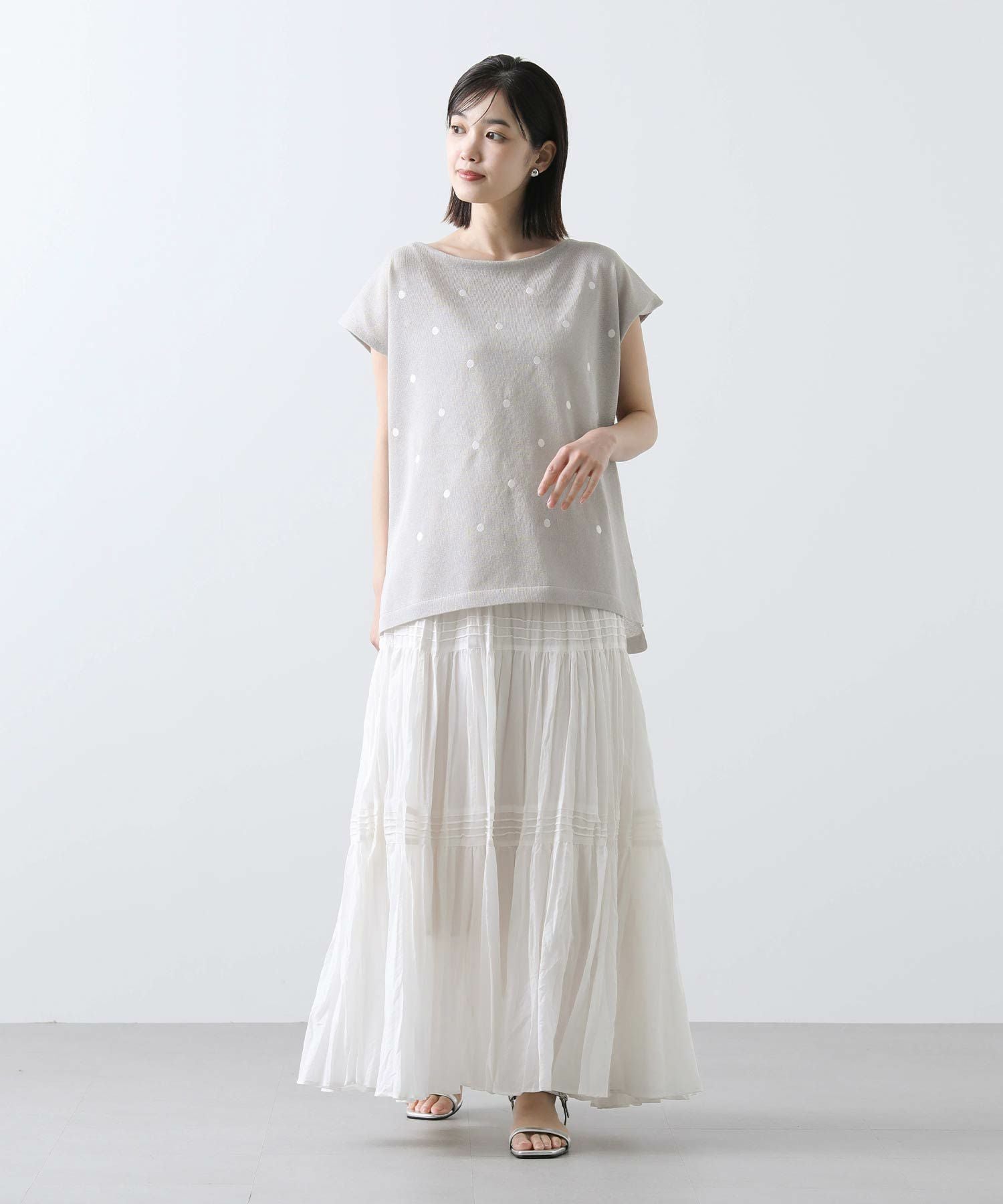 程よく間隔をあけて、大人フェミニンなドット柄に仕上げたサマーニット。
