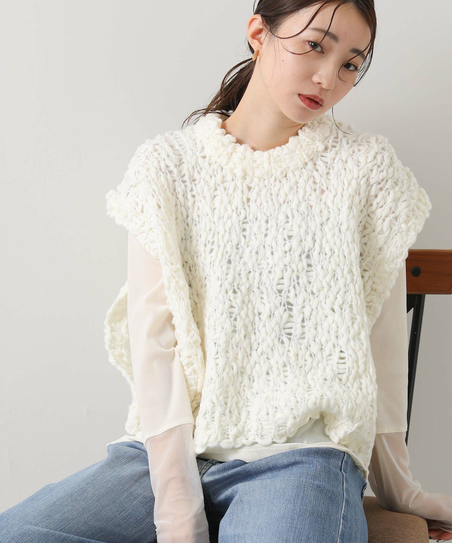 スラブ糸自体に表情があり、手編みであえて軽く編み上げたニットベストは、ざっくり感がとても可愛い1着。