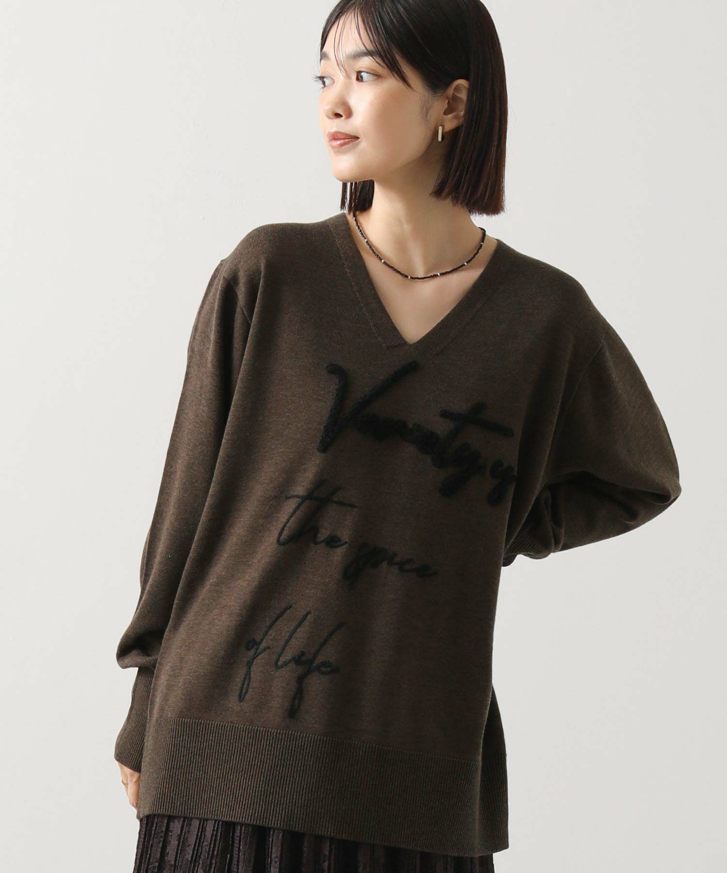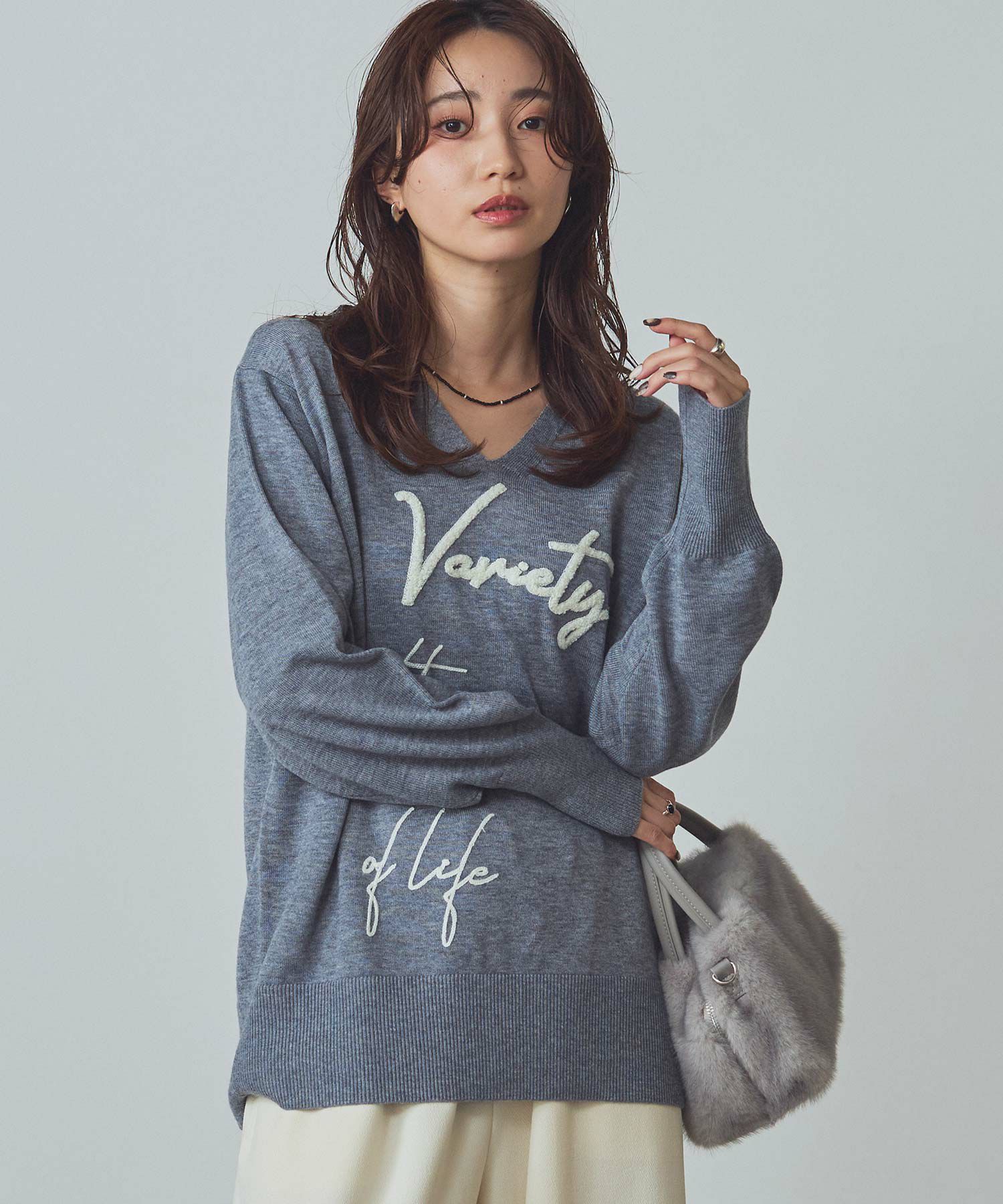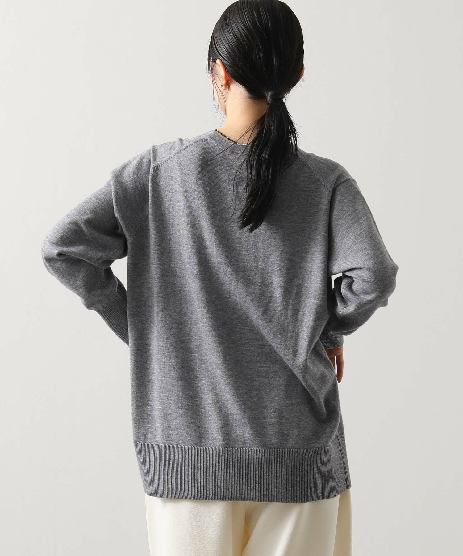 デコルテを美しく魅せるVネックの首元もポイント。