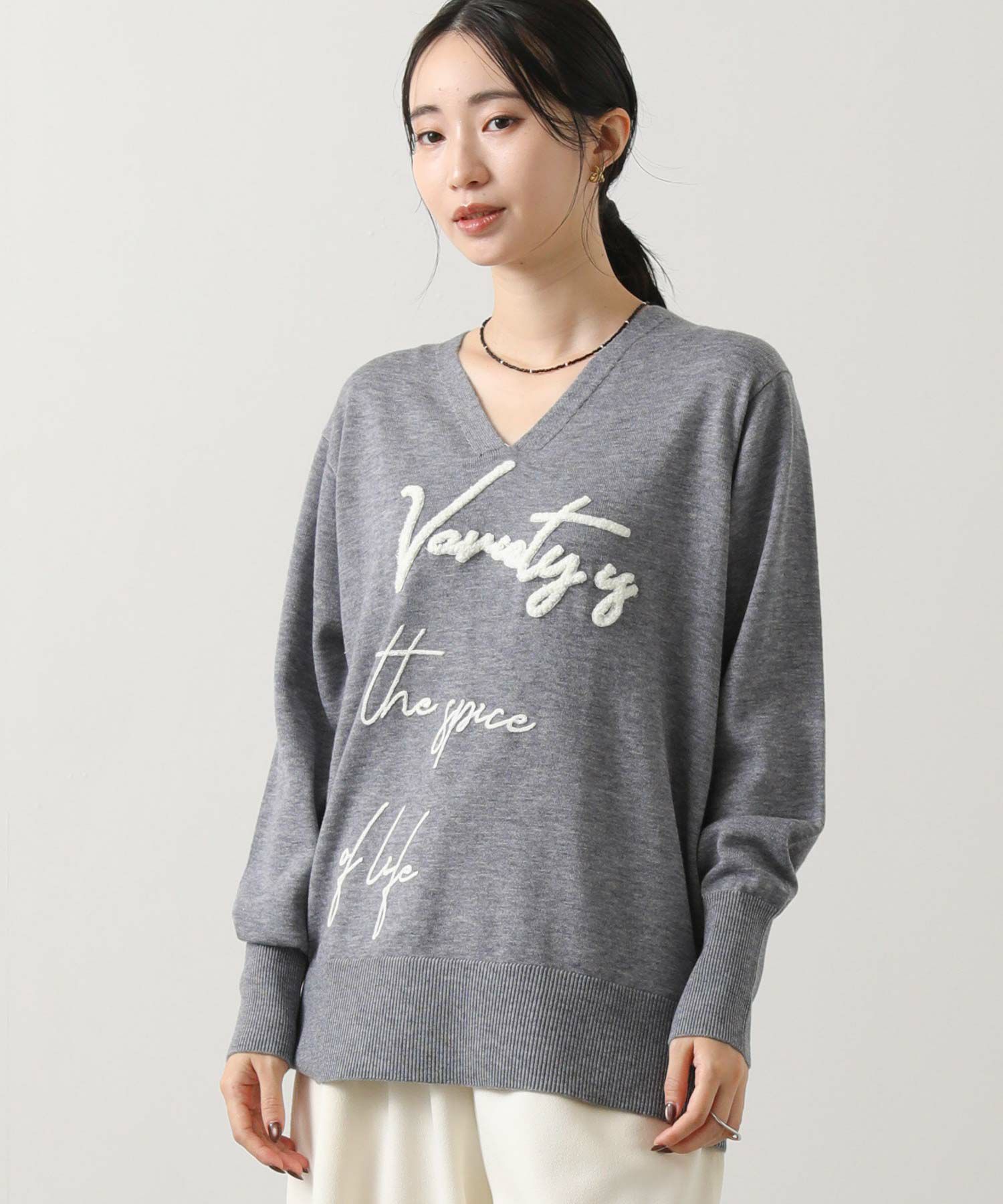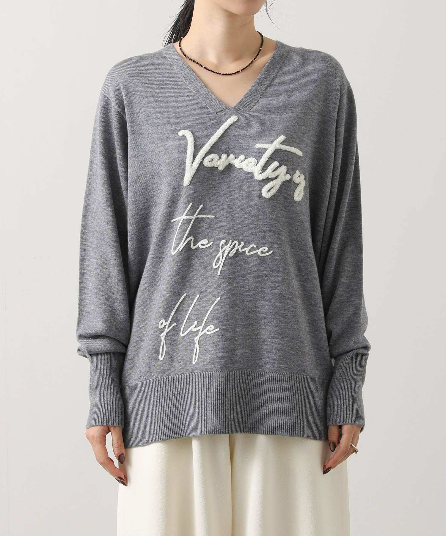 大胆に走る刺繍ロゴがインパクトのあるニットプルオーバー。