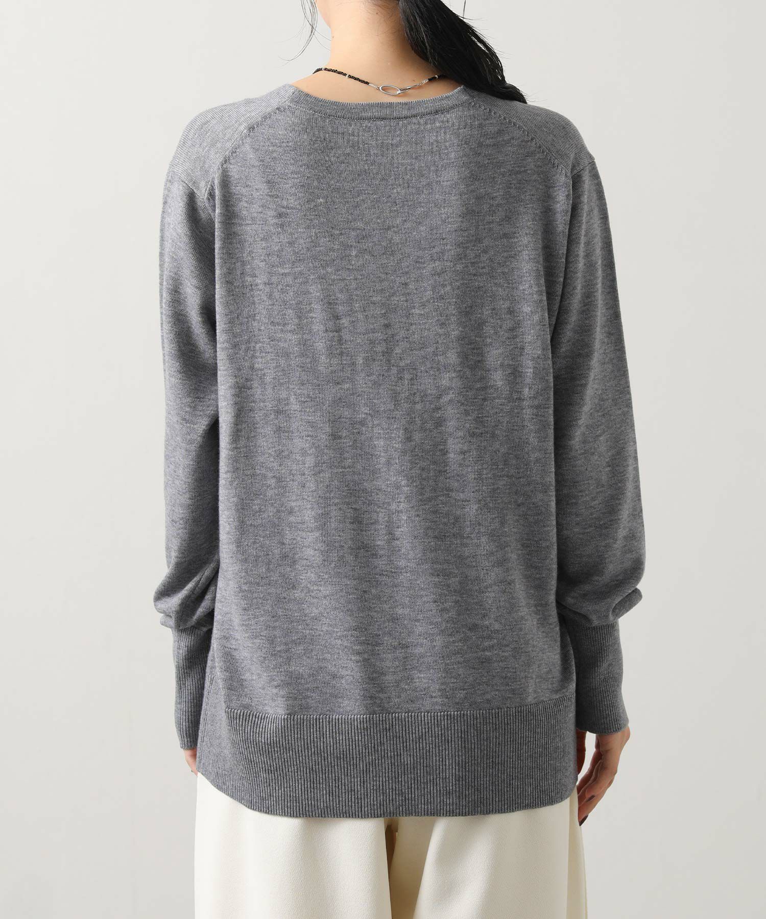 デコルテを美しく魅せるVネックの首元もポイント。
