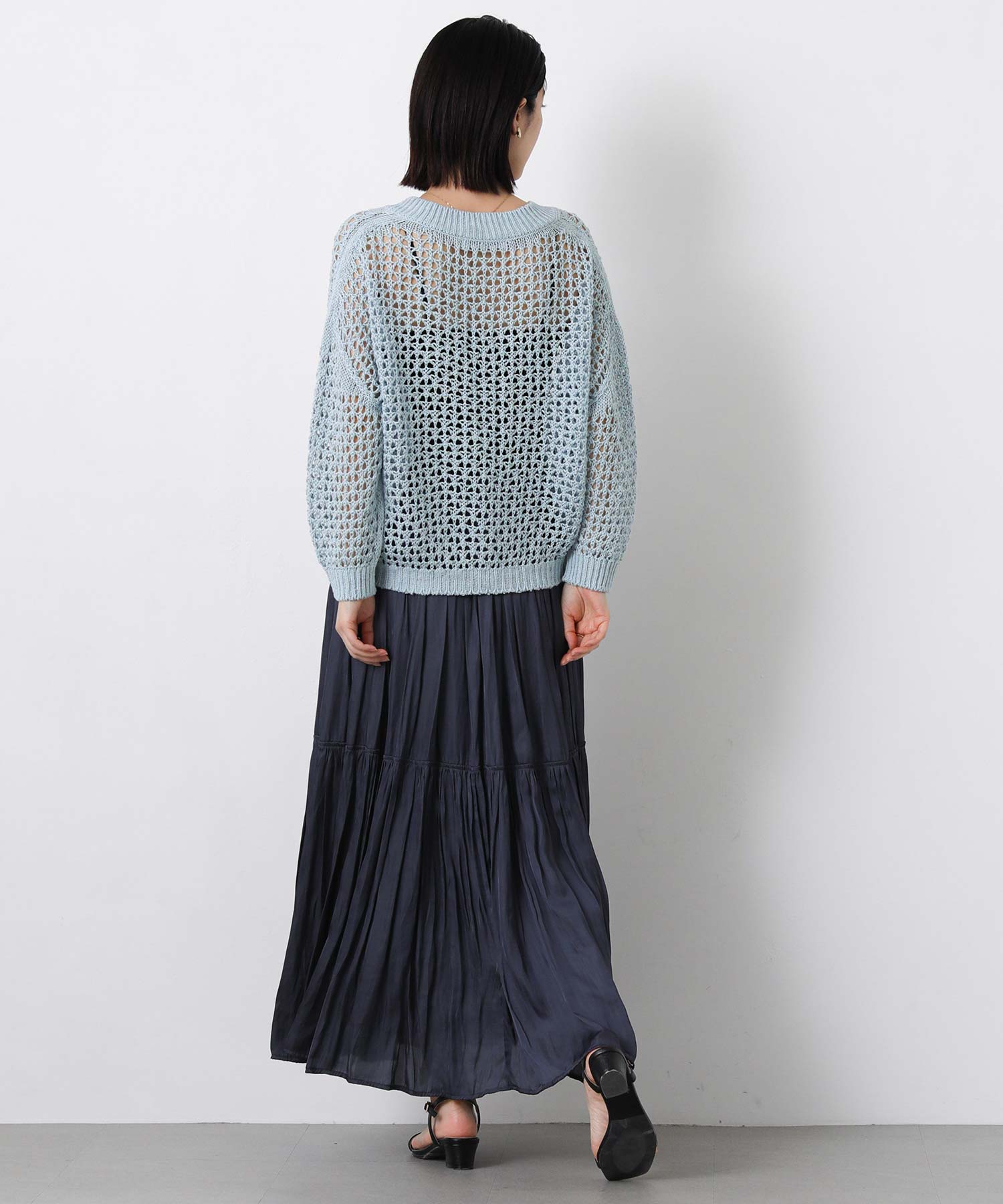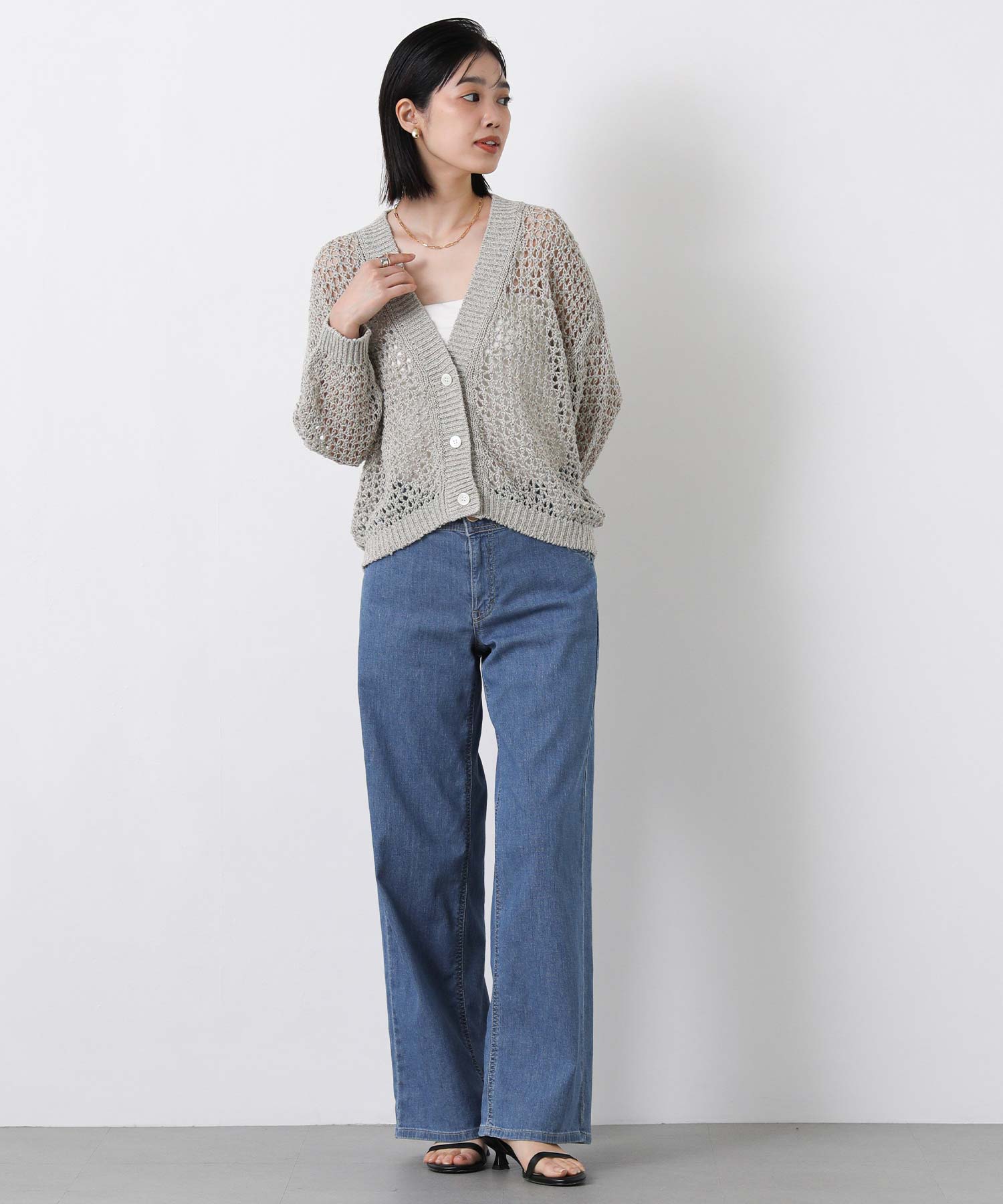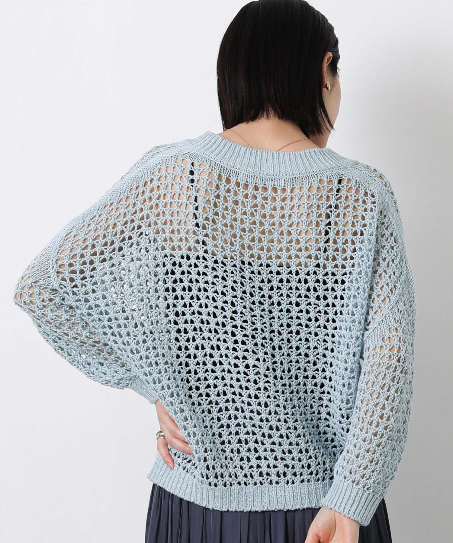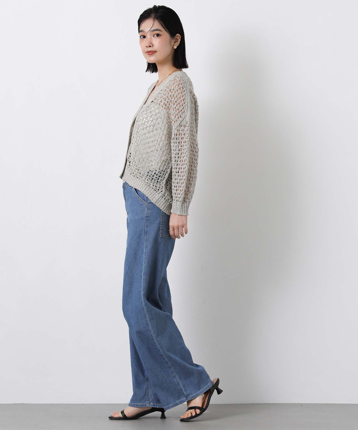 【EMMACULATE(エマキュレイト)】から、ホールガーメントでざっくりメッシュ調に編み立てたVネックカーデをセレクト。